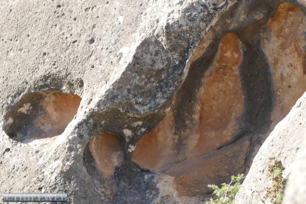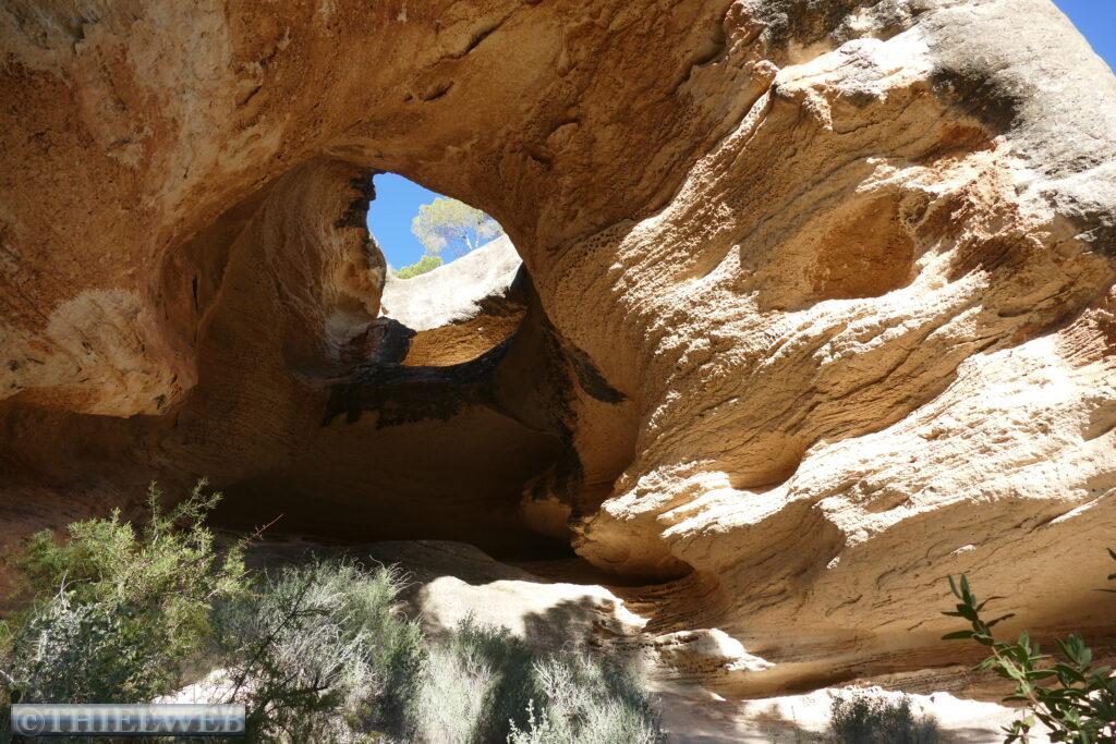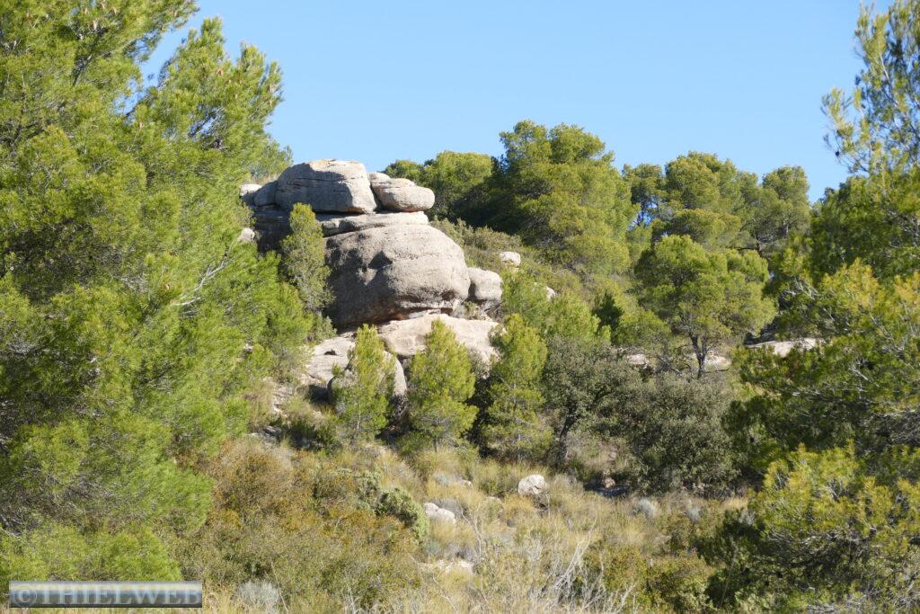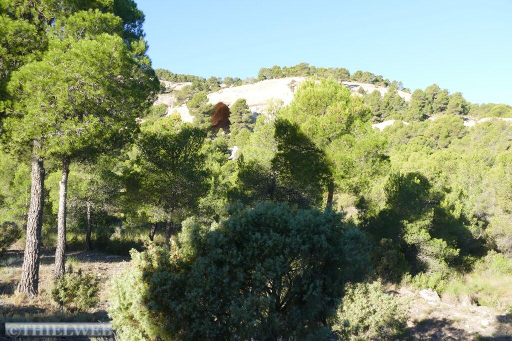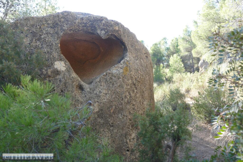 Zum Glück haben wir gestern Abend noch bemerkt, dass der Ausgangspunkt unserer Wanderung auf den Berg Arabi ca. 20 km von unserem Stellplatz entfernt liegt. So fahren wir am Morgen zuerst die Straße 404 von der wir auf die A18 abbiegen und bei Kilometer 15 sehen wir dann das Hinweisschild auf den Berg Arabi. Auf einem Schotterweg geht es weiter bis zu einem Wanderparkplatz. Der Berg Arabi ist eine besondere Erhebung in der ringsum ebenen, durch ein endlos scheinendes Weinanbaugebiet bewirtschafteten Landschaft. Zunächst folgen wir dem Wanderweg, der uns bis zur Höhle von La Horadada bringt. Ihr Dach hat ein riesiges Lock. Überall hat die Erosion von Wasser und Wind Höhlen, Galerien und merkwürdige Formen im Felsen gebildet. Eine einzigartige Formation ist u. a. die Form des Herzens, das die Liebe anziehen soll. Im fast ebenen Gelände folgt der Wanderweg bis zum Hügel Cerro de los Moros oder Arabilejo, der durch eine Schlucht vom Berg Arabi getrennt ist. Die Vegetation ist von Aleppo-Kiefern, Steineichen und zahlreiche Pflanzenarten wie Kermeseiche, schwarzer Wacholder, Erdbeerbaum, schwarzer Weißdorn und weiße Zistrose sowie zum Teil endemischen Pflanzenarten geprägt.