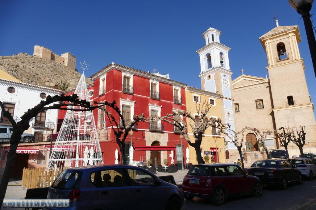 Am Morgen liegt nach unserer bisher kältesten Nacht mit 3,9°C dicker Nebel auf der Landschaft und läßt sie märchenhaft erscheinen. Die Sonne steigt schnell auf und am Nachmittag sind es bereits 16°C. Wir nähern uns entlang von Obst und Zitronenplantagen der kleinen Stadt Mula. Die Gemeinde Mula ist voller Kontraste und überraschender Landschaften aufgrund ihrer Lage zwischen wichtigen Bergformationen wie der Sierra Espuña, der Sierra del Cambrón und der Sierra de Ricote, zusammen mit den Trockengebieten von Cagitán und El Ardal und der fruchtbaren Ebene von Río Mula und Pliego. Hoch über der Stadt thront das Kastell, das gerade rekonstruiert wird. Es gibt einige schöne Häuser aus dem 16. und 17. Jahrhundert und etliche Kirchen. Leider gehen wir mal wieder nicht zur passenden Zeit durch die Gassen, denn alle Kirchen sind geschlossen.