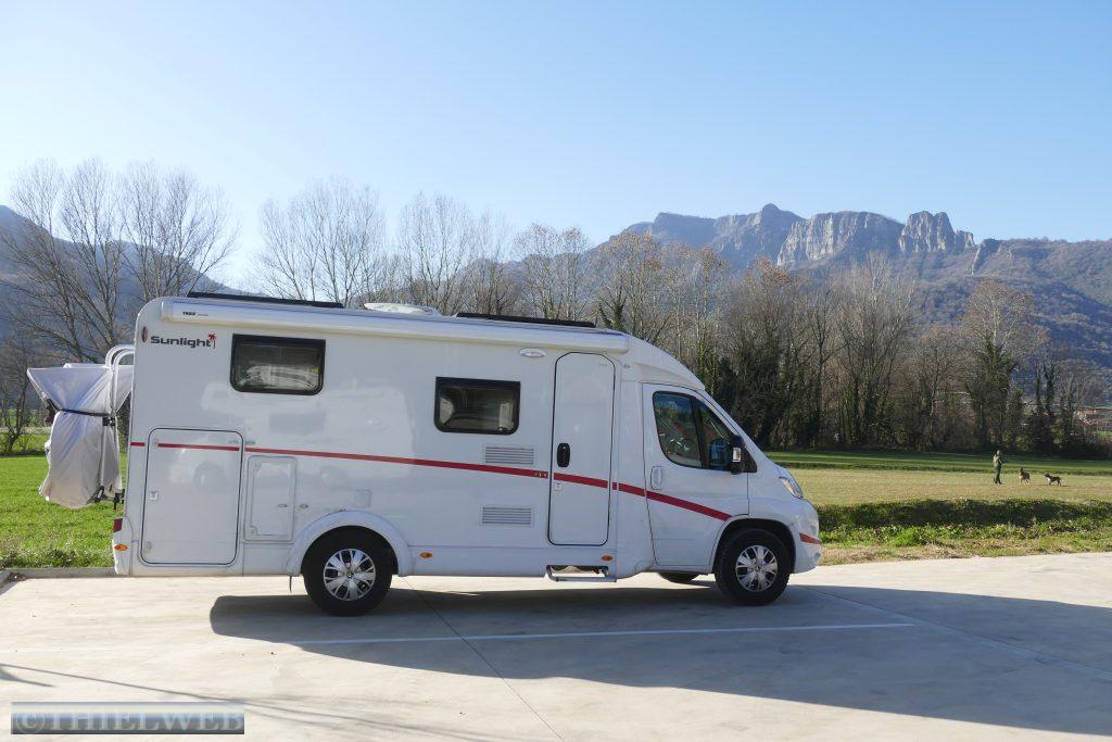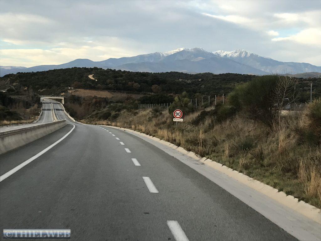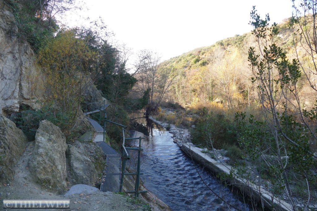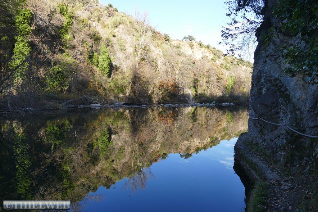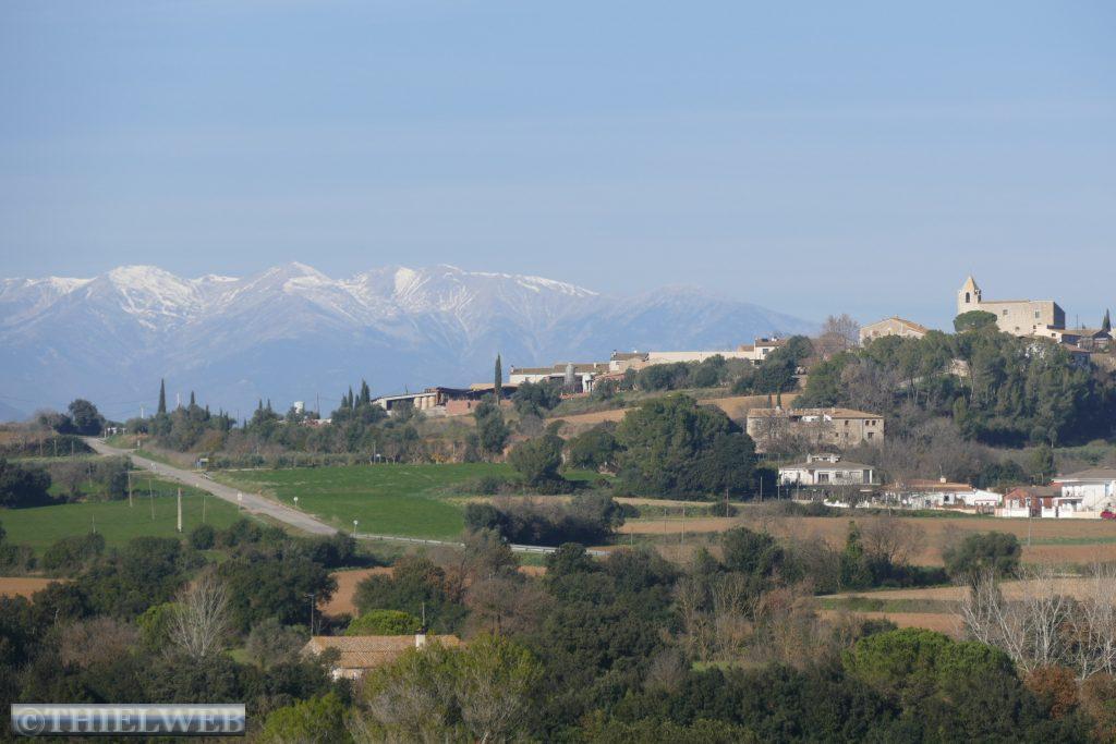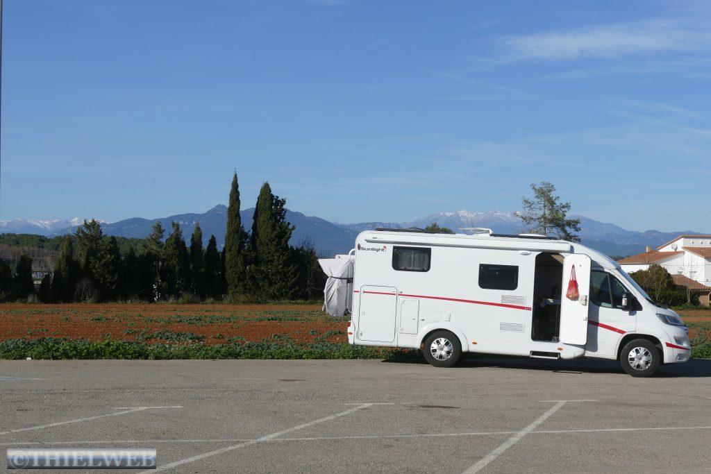 Für den heutigen Tag sind über 20 °C angesagt. Da wir erst morgen in Spanien sein wollen, fahren wir erst einmal weiter bis Perpignan. Weinfelder und hohe Pinienbäume säumen die Straße, eine Mandelbaumplantage – wir sind unverkennbar im Süden angekommen. Noch einmal müssen wir ein wenig Diesel tanken, um von Perpignan ca. 20 km ins Hinterland nach Ille-sur-Têt zu gelangen. Von weiten sehen wir die Pyrenäen mit ihren schneebedeckten Gipfeln. Wir haben eine kleine Wanderung von hier aus gefunden, zu der wir nach unserer Mittagspause starten. Zunächst verläuft der breite Weg entlang eines alten Bewässerungskanals. Dann verengt er sich und ist mit Stegen gesichert. Es folgt eine sehr schmale Stelle, an der wir das Seil gern zu Hilfe nehmen. Kurz bevor wir Rodés erreichen, fragen wir eine Frau, wie der Rückweg auf der anderen Seite des Flusses verläuft. Sie rät uns ab, da wir erst einen Berg erklimmen müssen. Die uns verbleibende Zeit bis zum Sonnenuntergang wird nicht reichen. So kehren wir auf demselben Weg zum Wohnmobil zurück.