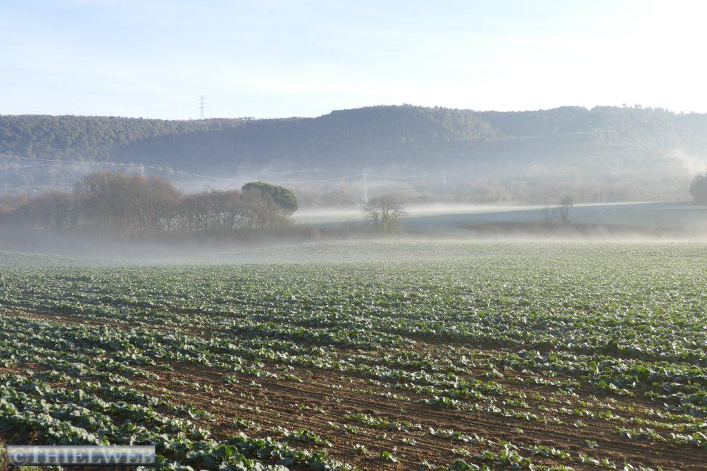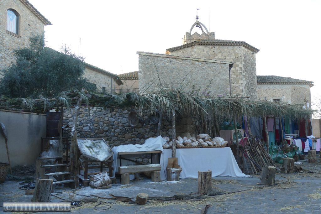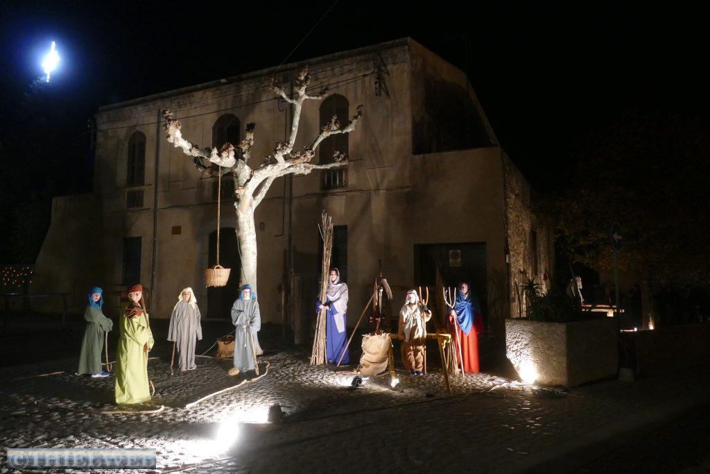 Um 9 Uhr fahren wir zurück nach Perpignan und weiter auf der N II über die Grenze bis La Jonquera, wo wir die Ver- und Entsorgung erledigen. In Figueres tanken wir an der Avanza Tankstelle für 1,459 € und machen auch gleich noch den AddBlue Tank voll. Nun müssen wir nur noch unsere heute Morgen leer gewordene Repsol Gasflasche tauschen. Wir fahren mehrere Tankstellen an, überall ist Propangas ausverkauft. Schon wollen wir aufgeben und weiter nach Baskara fahren, als wir den Zugang zu einer Tankstelle als letzten Versuch suchen. Dabei kommen wir an einem kleinen Laden vorbei, wo die orangen Flaschen vor der Tür stehen. Hier können wir endlich die Gasflasche tauschen, die mittlerweile auch 2 € teurer ist. Die paar Kilometer bis Baskara sind schnell geschafft, und der Parkplatz am Sportplatz völlig leer. Zunächst wollen wir uns wegen des lebendigen Krippenspiels am morgigen Tag erkundigen. Wir sehen schon die vorbereiteten Stände und erfahren, dass es morgen um 19 Uhr losgeht. Wieder zurück am Womo unternehmen wir noch eine kleine Wanderung um die Ortschaft über Calabuig und entlang von Feldern und durch ein Wäldchen.