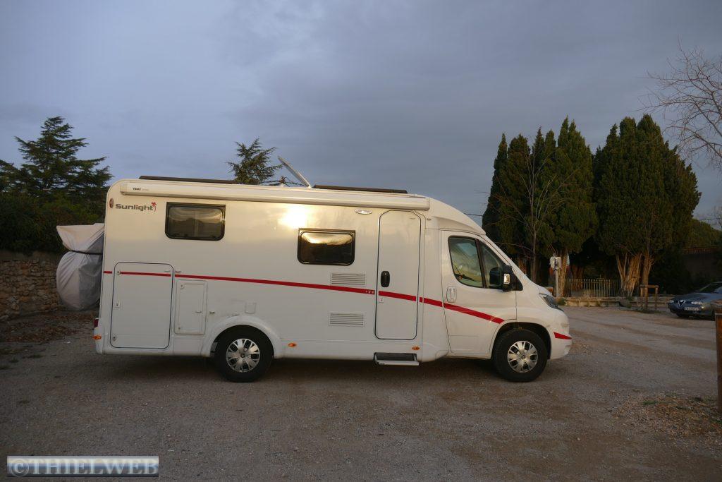 Am Morgen tanken wir noch einmal zu günstigen 1,709 €/l. Im Moment ist der Diesel sogar etwas günstiger als in Deutschland. Auf der Atlantikroute kommen wir mautfrei gut voran. Hinter Digoin folgen wir einer kleineren, landschaftlich schönen Straße. Leider ist der Himmel heute den ganzen Tag wolkenverhangen. Gegen Mittag ist Clermont-Ferrand erreicht. Jetzt geht es auf die mautfreie A75, die wir nur in Millau kurz verlassen, um das Viadukt zu umfahren. Wir kommen flott voran, da wenig Verkehr ist, beschließen wir noch über die Berge bis Montpeyroux zu fahren. Mit den letzten Sonnenstrahlen bei 15 °C erreichen wir das verschlafene Dorf nach ca. 530 km.