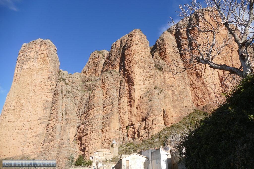 Nach einer stĂŒrmischen Nacht fahren wir weiter in das verschlafene Riglos, was durch seine imposanten, durch Wind und Wetter geformten Felsen vor allem unter Kletterern bekannt ist. Wir wandern auf dem Camino del Solano de Riglos im Königreich Mallos zunĂ€chst steil bergan zum Aussichtspunkt hinter dem Colorado Mallo mit Blick auf Riglos. Ăber den ParedĂłn de los Buitres kommen wir zum Abzweig auf dem Camino del Solano. Wir folgen dem Weg ein StĂŒck bergauf und haben einen Panoramablick auf die PyrenĂ€en. Rosmarin blĂŒht in Blau- und WeiĂtönen und die Geier lassen sich von der Thermik tragen. An einer Wegkreuzung gehen wir noch zum Mirador Torre y Ermita Murcuello zu einem tollen Aussichtspunkt an der Ruine. Wir halten uns nicht lange auf, denn die Windböen blasen uns fast um. Danach verlassen wir den Camino del Solano und nehmen den Weg GR 1, der zur La Mota-Schlucht und zurĂŒck nach Riglos fĂŒhrt.
