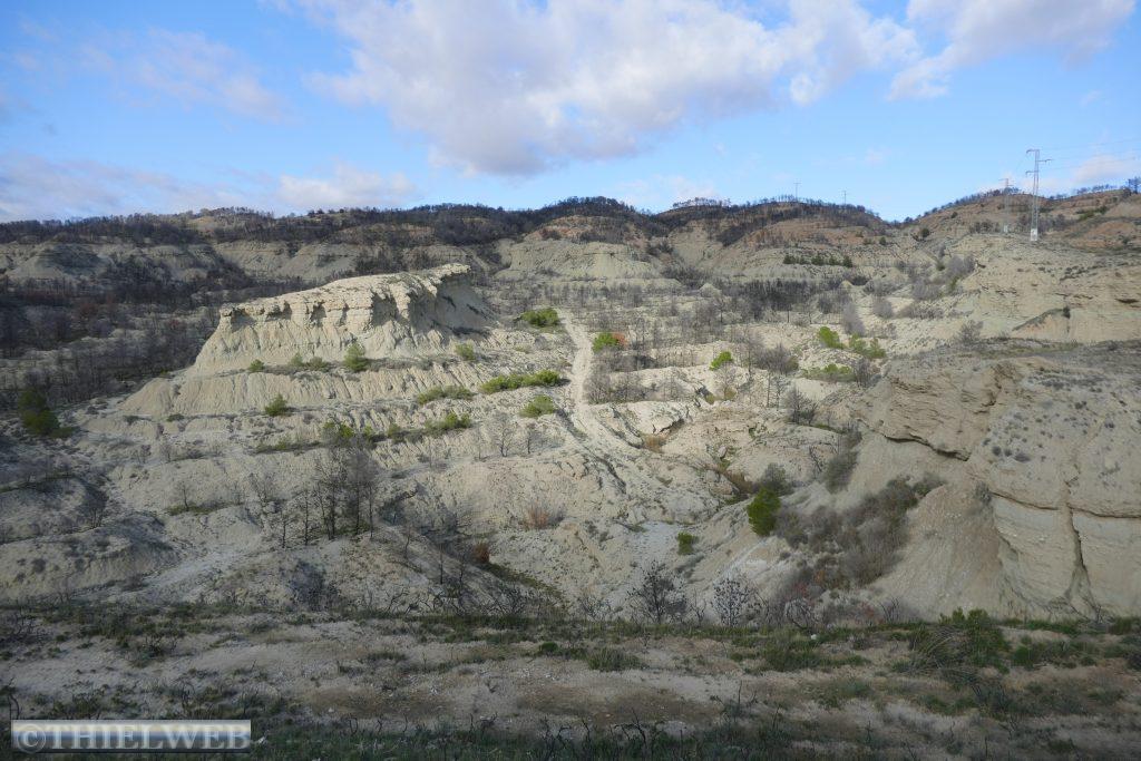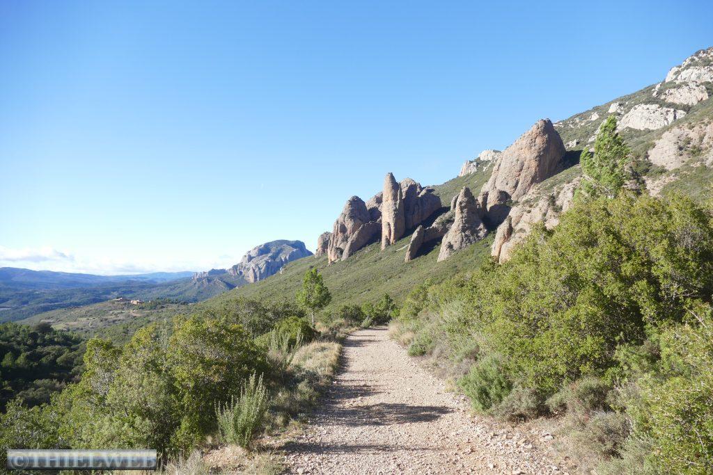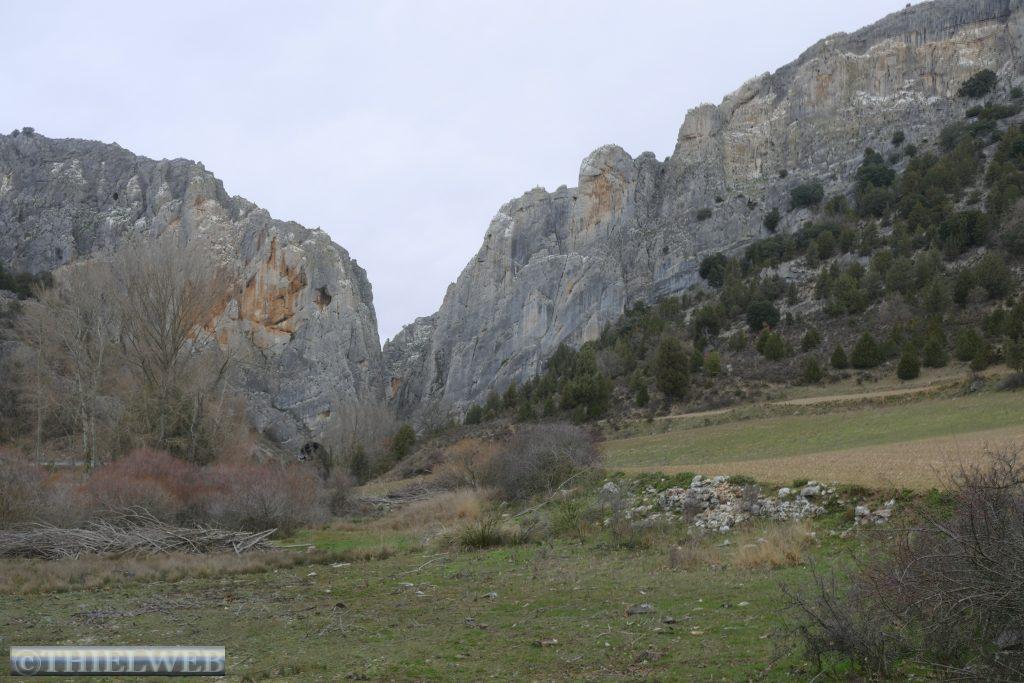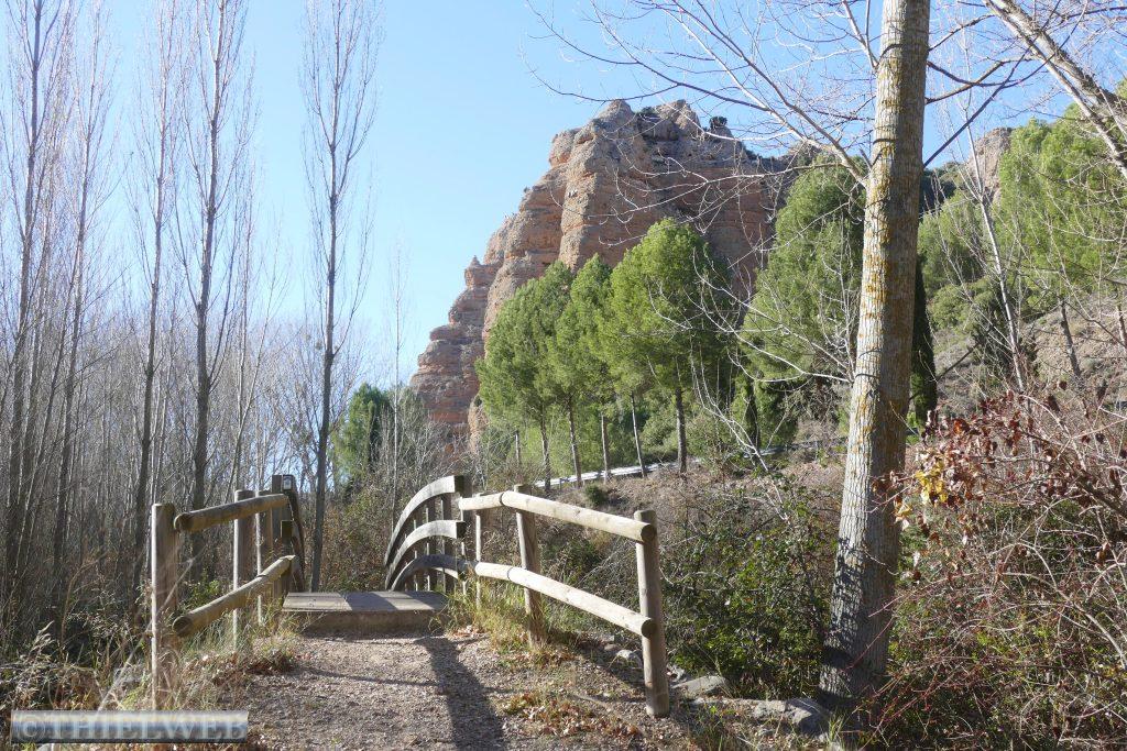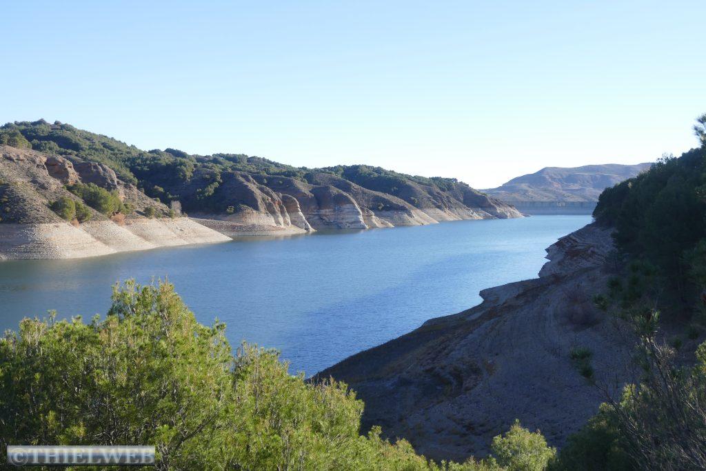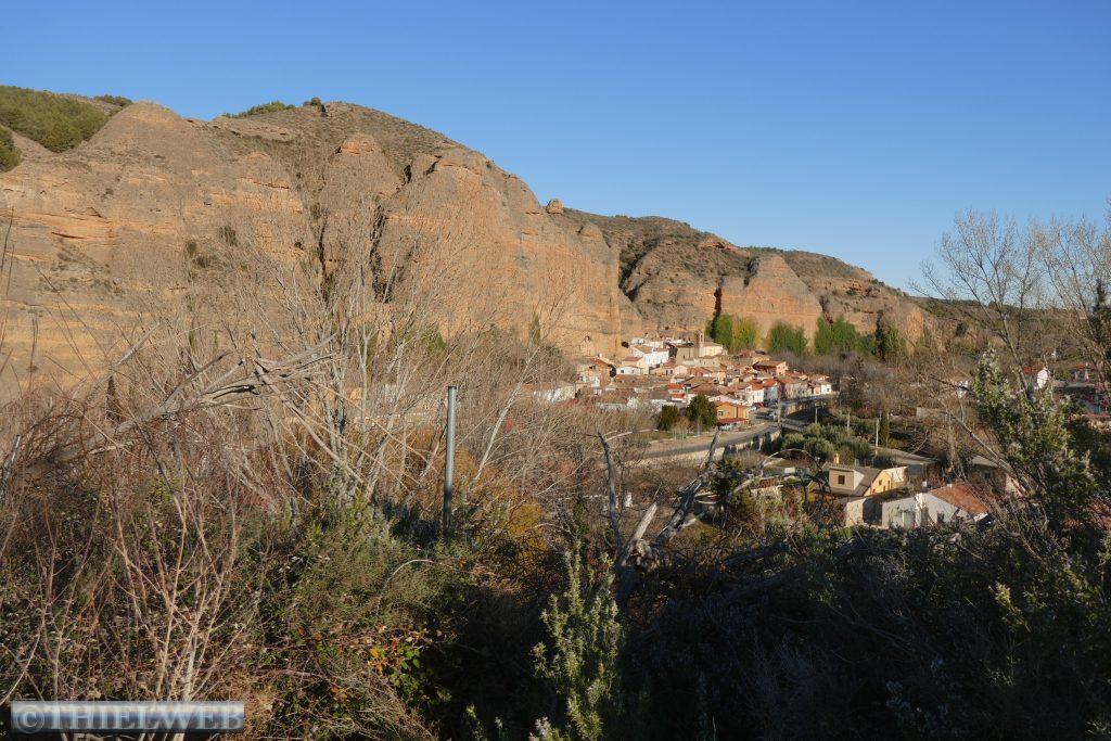 5 km von Tarazona entfernt liegt der kleine Ort Los Fayos. Hier starten wir zu unserer Wanderung zunĂ€chst auf einem Forstweg am linken Ufer des El-Val-Stausees. Am Abzweig des ornithologischen Wanderweges entscheiden wir uns, weiter um den See zu laufen. Am Ende des Sees endet der Weg auf einer Wiese und ĂŒber den kleinen Zufluss finden wir im GestrĂŒpp eine abenteuerliche BrĂŒcke aus gefĂ€llten BaumstĂ€mmen. Der Weg dahinter ist nicht zu erkennen. So entscheiden wir zum Abzweig zurĂŒckzugehen und auf dem stetig ansteigenden Weg den Barrera auf 803 m Höhe zu erklimmen. Zwischen den BĂ€umen erhaschen wir ab und an einen Blick bis zu den PyrenĂ€en. Wieder im Tal kommen wir an den Mallos vorĂŒber, die als Zufluchtsort fĂŒr zahlreiche Felsenvögel wie GĂ€nsegeier, Uhus oder Schmutzgeier dienen. Aus den ursprĂŒnglich geplanten 12 km sind nun 19 km geworden, sodass wir keine Lust mehr haben noch zu den Höhlen von Los Fayos aufzusteigen.