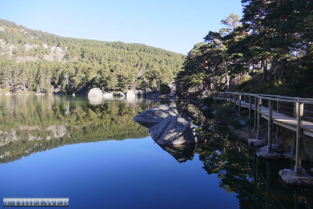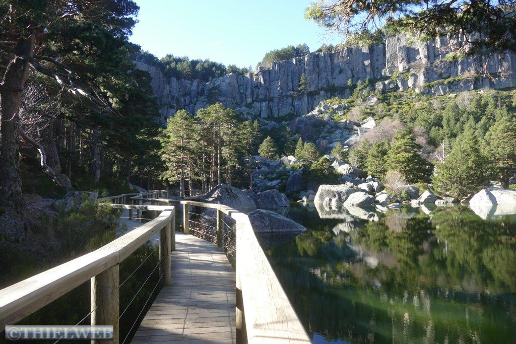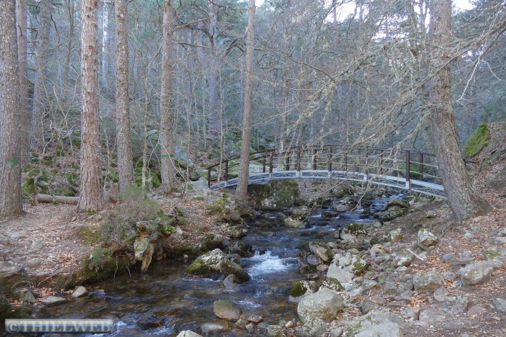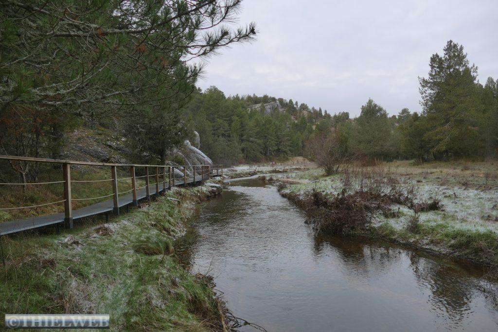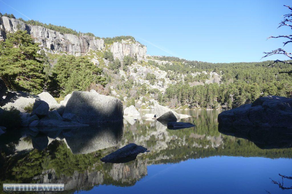 Am Morgen glitzern die Eiskristalle bei den ersten Sonnenstrahlen. – 1° C, zum GlĂŒck nicht die vorhergesagten -6 °C. Wir lassen uns Zeit und fahren ĂŒber Vinuesa zur Laguna Negra, auf einer landschaftlich sehr schönen StraĂe klettern wir immer weiter bergan bis zum Parkplatz Paso de la SerrĂĄ. Die restlichen ca. 2 km zur Lagune gehen wir auf einem sehr schönen Wanderweg entlang des plĂ€tschernden FlĂŒsschens. Der See liegt auf ca. 2.000 m ĂŒ. d. Meeresspiegel inmitten von Pinienwald und umgeben von FelswĂ€nden aus Granit in einer der schönsten Landschaften der Provinz Soria. Der Wanderweg steigt hinter dem See weiter bergauf und man könnte an 2 weiteren Lagunen vorbei bis zum Gipfel des UrbiĂłn auf 2.228 m, einer der höchsten des Iberischen Gebirges, wandern. In dessen NĂ€he entspringt auch der Duoro. Wir klettern ca. 2/3 hinauf, dann kommen wir zu immer mehr ĂŒberfrohrenen Stellen. Das wird uns fĂŒr den RĂŒckweg zu heikel und wir kehren um.