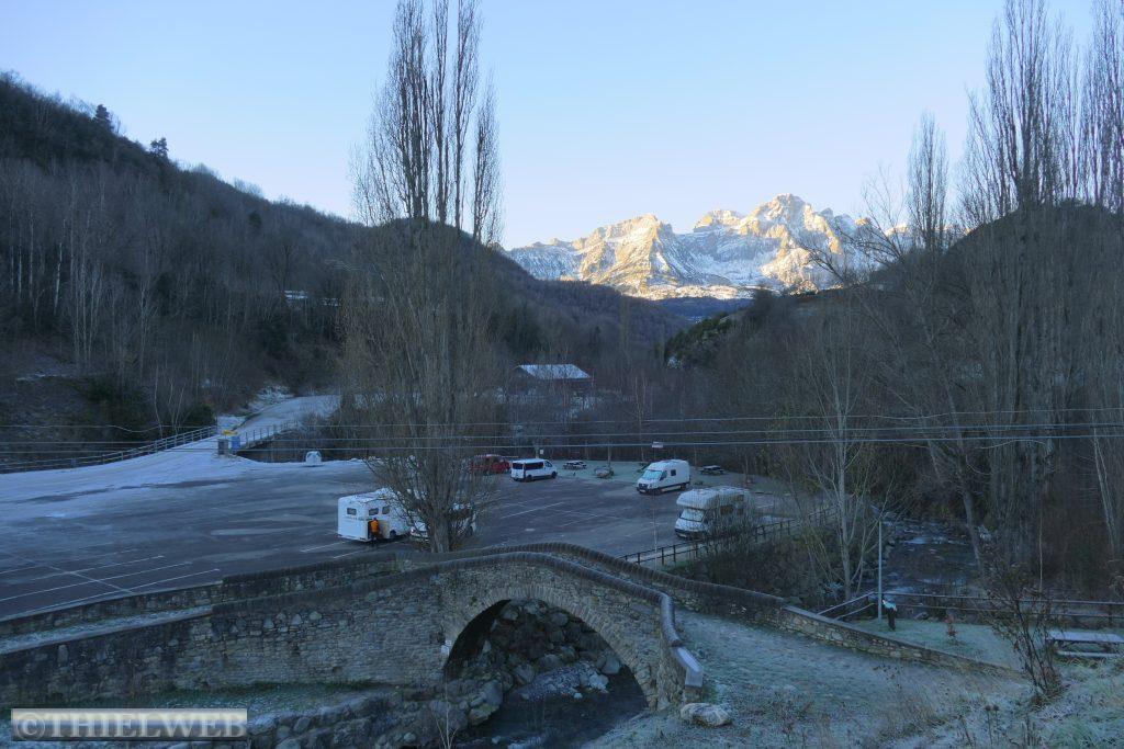 – 1 °C und dichter Nebel. Nach einer kalten Nacht geht es heute weiter Richtung Spanien, nachdem wir nochmal etwas getankt haben. Der Nebel will sich heute einfach nicht auflösen. Erst gegen Mittag ist er urplötzlich verschwunden und die Sonne strahlt vom blauen Himmel. Als wir Pau bei 14 °C erreichen, sehen wir am Horizont das grandiose Panorama der PyrenĂ€en. Immer weiter klettern wir von 200 m bis zum Portalet Pass auf 1.794 m. Hier ĂŒberqueren wir auch die Grenze zwischen Frankreich und Spanien. Danach geht es wieder hinunter auf 1.184 m, wo wir an der Seilbahn in Panticosa unseren Ăbernachtungsplatz haben.