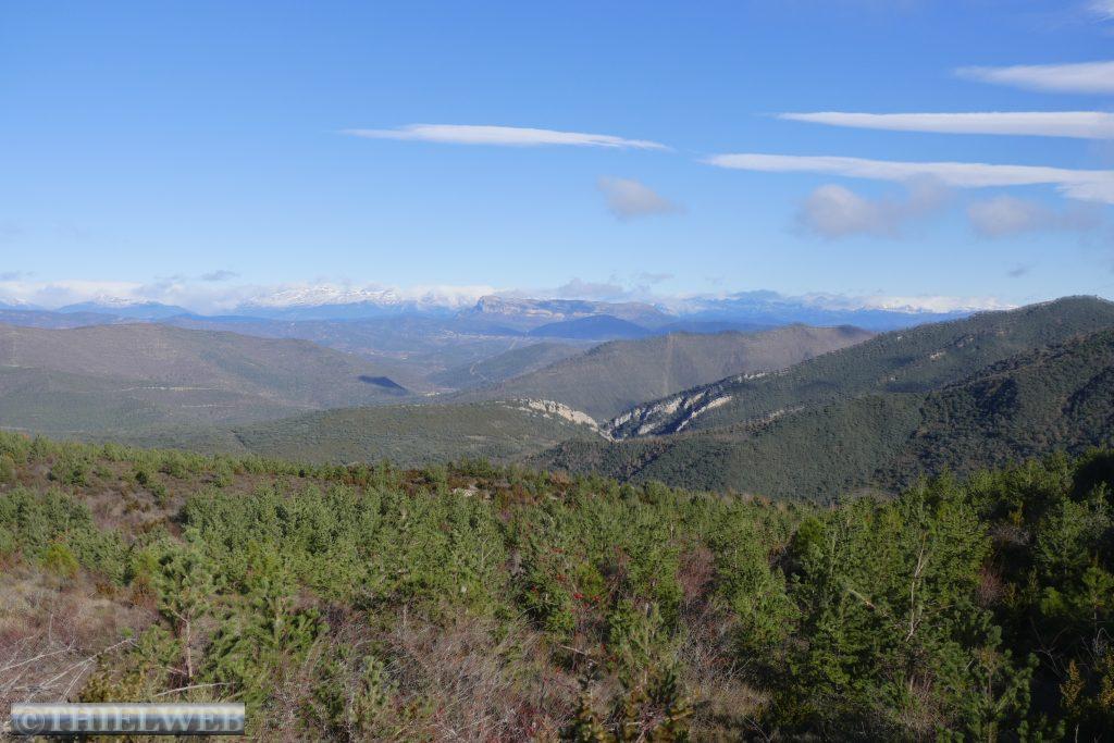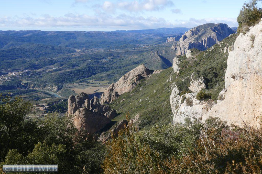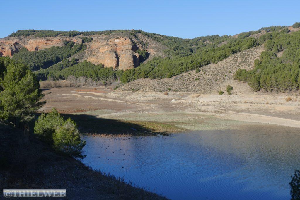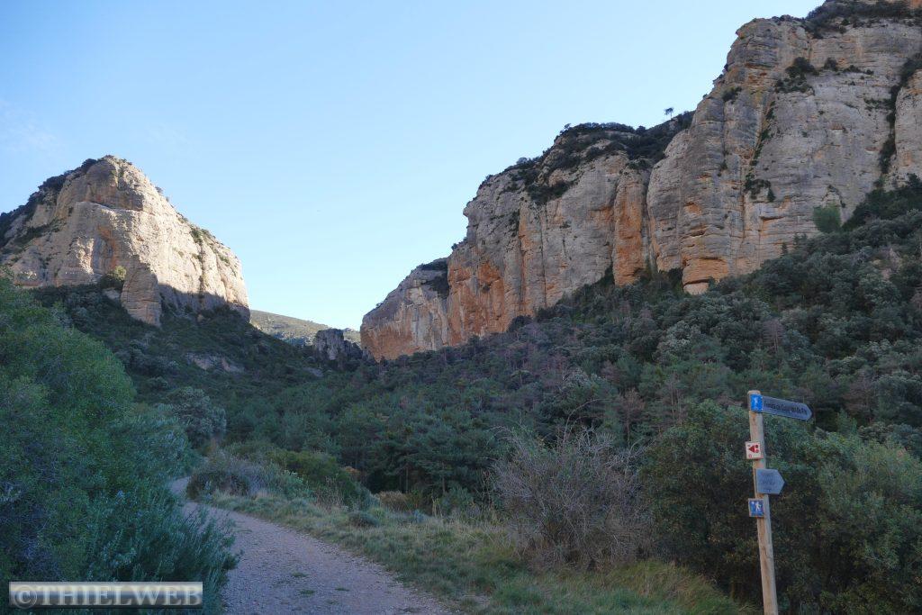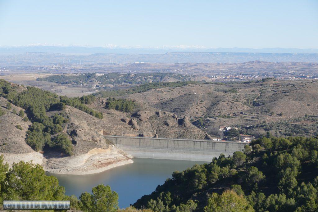 5 km von Tarazona entfernt liegt der kleine Ort Los Fayos. Hier starten wir zu unserer Wanderung zunĂ€chst auf einem Forstweg am linken Ufer des El-Val-Stausees. Am Abzweig des ornithologischen Wanderweges entscheiden wir uns, weiter um den See zu laufen. Am Ende des Sees endet der Weg auf einer Wiese und ĂŒber den kleinen Zufluss finden wir im GestrĂŒpp eine abenteuerliche BrĂŒcke aus gefĂ€llten BaumstĂ€mmen. Der Weg dahinter ist nicht zu erkennen. So entscheiden wir zum Abzweig zurĂŒckzugehen und auf dem stetig ansteigenden Weg den Barrera auf 803 m Höhe zu erklimmen. Zwischen den BĂ€umen erhaschen wir ab und an einen Blick bis zu den PyrenĂ€en. Wieder im Tal kommen wir an den Mallos vorĂŒber, die als Zufluchtsort fĂŒr zahlreiche Felsenvögel wie GĂ€nsegeier, Uhus oder Schmutzgeier dienen. Aus den ursprĂŒnglich geplanten 12 km sind nun 19 km geworden, sodass wir keine Lust mehr haben noch zu den Höhlen von Los Fayos aufzusteigen.