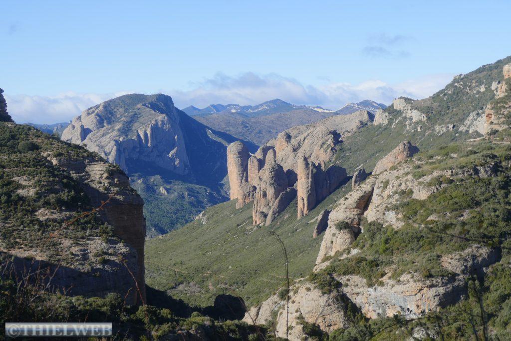Nach einer stĂŒrmischen Nacht fahren wir weiter in das verschlafene Riglos, was durch seine imposanten, durch Wind und Wetter geformten Felsen vor allem unter Kletterern bekannt ist. Wir wandern auf dem Camino del Solano de Riglos im Königreich Mallos zunĂ€chst steil bergan zum Aussichtspunkt hinter dem Colorado Mallo mit Blick auf Riglos. Ăber den ParedĂłn de los Buitres kommen wir zum Abzweig auf dem Camino del Solano. Wir folgen dem Weg ein StĂŒck bergauf und haben einen Panoramablick auf die PyrenĂ€en. Rosmarin blĂŒht in Blau- und WeiĂtönen und die Geier lassen sich von der Thermik tragen. An einer Wegkreuzung gehen wir noch zum Mirador Torre y Ermita Murcuello zu einem tollen Aussichtspunkt an der Ruine. Wir halten uns nicht lange auf, denn die Windböen blasen uns fast um. Danach verlassen wir den Camino del Solano und nehmen den Weg GR 1, der zur La Mota-Schlucht und zurĂŒck nach Riglos fĂŒhrt.