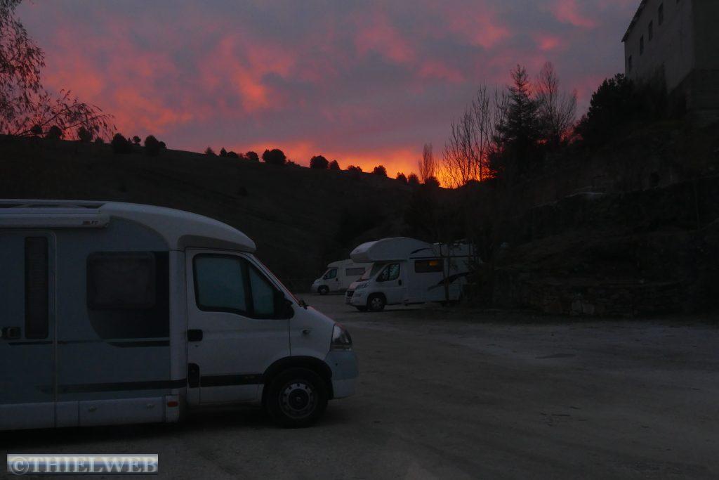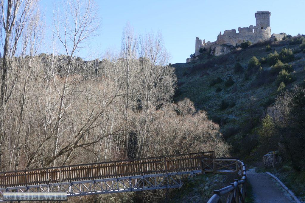 Das war die bisher kĂ€lteste Nacht mit -3,3° C. Als die Sonne endlich ĂŒber den Berg kommt, fahren wir in den Cañón del RĂo Lobos, einen Kalkstein-Canyon mit senkrechten WĂ€nden und Raubvögeln wie Uhus, Schmutzgeiern und Steinadlern. Wir wandern auf dem Senda del Castillo, einem Rundweg, der am Ucero-Fluss hinauf zur alten Festung Castillo de Ucero fĂŒhrt. Die Festung aus dem 12. und 13. Jahrhundert steht im Zusammenhang mit den Templern. Wir besichtigen die Festung und steigen wieder hinab nach Ucero. Bevor wir den Ort erreichen, gehen wir durch den Tunnel des Canal-Romano, einer spektakulĂ€ren Konstruktion eines römischen Kanals.