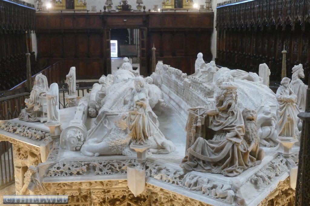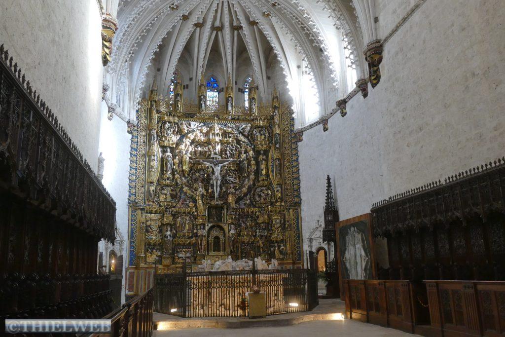 In der Nacht hat es geregnet und am Morgen ist es kalt und trĂŒb. Wir erledigen noch den letzten Einkauf und tanken fĂŒr 1.299 âŹ/l. Mittlerweile hat sich der Himmel aufgeklart und wir fahren zum ca. 3 km entfernten KartĂ€userkloster Santa MarĂa de Miraflores. Besondere SehenswĂŒrdigkeit ist die GrabstĂ€tte des Königs von Kastilien Juan II. und seiner Frau Isabella von Portugal. Im Anschluss geht es weiter Richtung SĂŒden nach Lerma, einem weiteren Pueblo mas bonito, dessen Silhouette schon bei der Anfahrt neugierig macht. Wir parken gleich neben der Puente Medieval und laufen zuerst zur Iglesia Colegiata de San Pedro. Hauptzugang zur Altstadt ist das Stadttor Arco de la CĂĄrcel. Die Calle Mayor fĂŒhrt uns zum Plaza Mayor, der zu den gröĂten Spaniens zĂ€hlt. Dominiert wird der Platz durch den Palacio Ducal, der heute ein Luxushotel beherbergt. Vom Mirador de los Arcos haben wir einen schönen Blick auf die Umgebung. Rechts und links vom Aussichtspunkt befinden sich die Kirche Juan de San Bautista und das Kloster AscensiĂłn de Nuestro Señor.