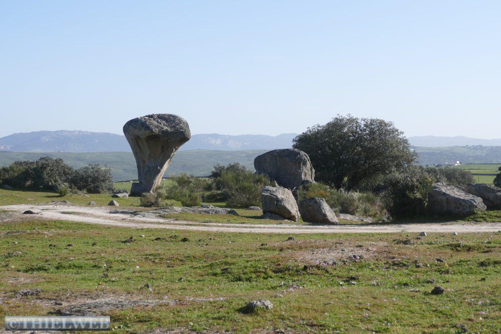 Unser heutiger Wanderweg ist der PPR-CC 98 Salto de Caballo . Erstes Ziel ist die Einsiedelei unserer Lieben Frau von Remedios, der Schutzpatronin von Valencia de Alcántara. Der Salto de Caballo verläuft zwischen Steinmauern und Olivenhainen. Unser Blick schweift in die endlose Landschaft der Extremadura, mit Viehweiden und bis hinüber nach Marvão in Portugal. Dann biegen wir ab und gelangen in Granitlandschaft, ein Material, das die alten Siedler zum Bau von Dolmen wie dem Caballo-Dolmen verwendeten, von dem nur noch ein großer aufrecht stehender Steinblock erhalten ist. Kurz danach erblicken wir den Porra del Burro, eine merkwürdige geologische Formation. Uralte Korkeichen säumen den Weg, der uns zum Schluss auf einer Asphaltstraße zurück nach Valencia de Alcántara bringt.