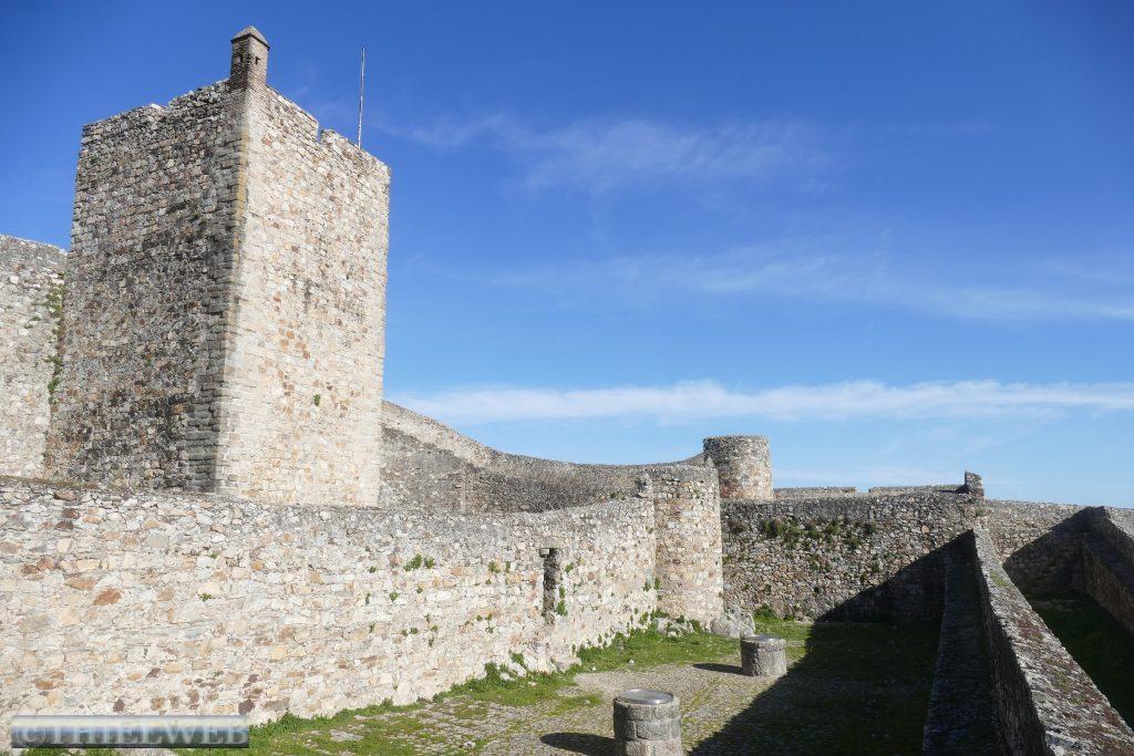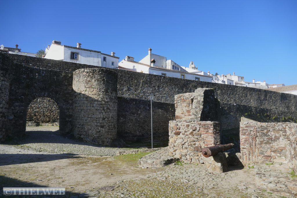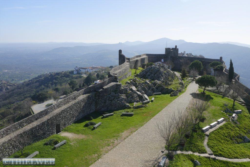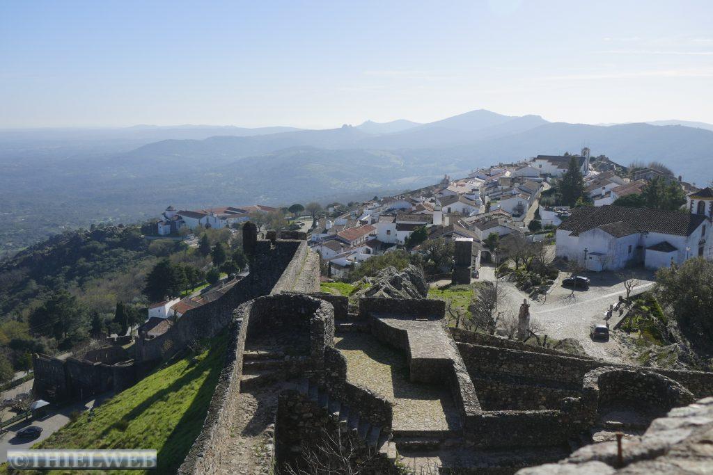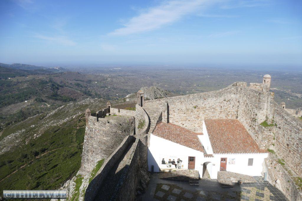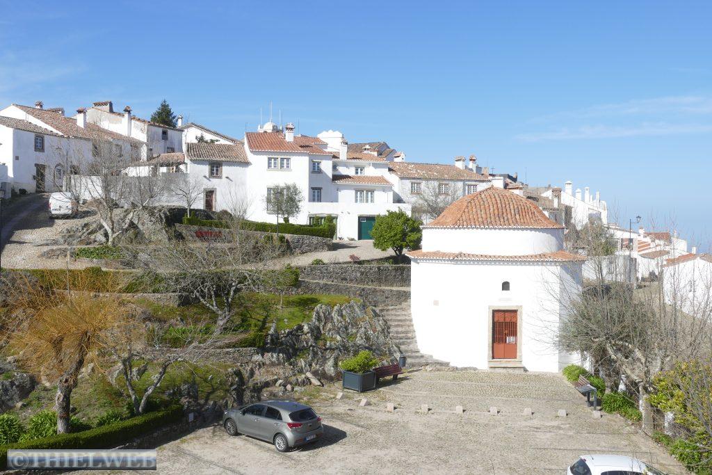 Am Morgen gehen wir zum Haupteingang, der Portas de Rodão, zum mittelalterlichen Stadtzentrum von Marvão und suchen zuerst das Touristenbüro auf. Wir schauen uns dann ein kleines Museum in der Casa Cultura an und gehen anschließend zum Castelo auf dem sogenannten Sapoio-Berg, der eine günstige natürliche Verteidigungsstellung bot. Das sehr gut erhaltene Bauwerk können wir fast rundum auf den Wehrmauern erkunden. Wir erklimmen den Fahnenturm und klettern auf den Hauptturm hinauf. Von hier haben wir einen Rundumblick auf das Dorf bis nach Spanien und auf die Serra de Estrela sowie bis nach Castelo de Vide und die Serra de São Mamede. Eine riesigen Zisterne sicherte für 6 Monate das Wasser im Fall einer Belagerung. Wir kommen zum Kirche Santa Maria, mit einem wunderschönen Gartenbereich. Entlang der schmalen Gassen erreichen wir die Igreja de Santiago und am Ende das Calvaro. Wir genießen es durch die Gassen mit den weißen Blumen geschmückten Häusern zu gehen und erreichen zum Schluss das Convento de Nossa Senhora da Estrela mit dem Cruzeiro Manuelino, welches sich gleich neben unserem Stellplatz befindet.