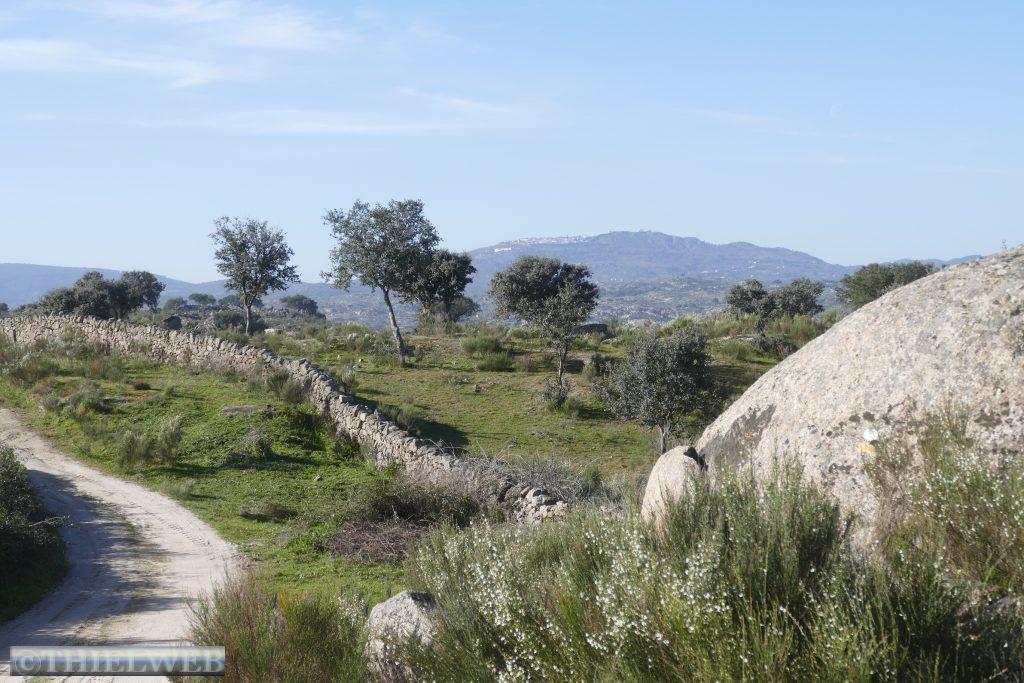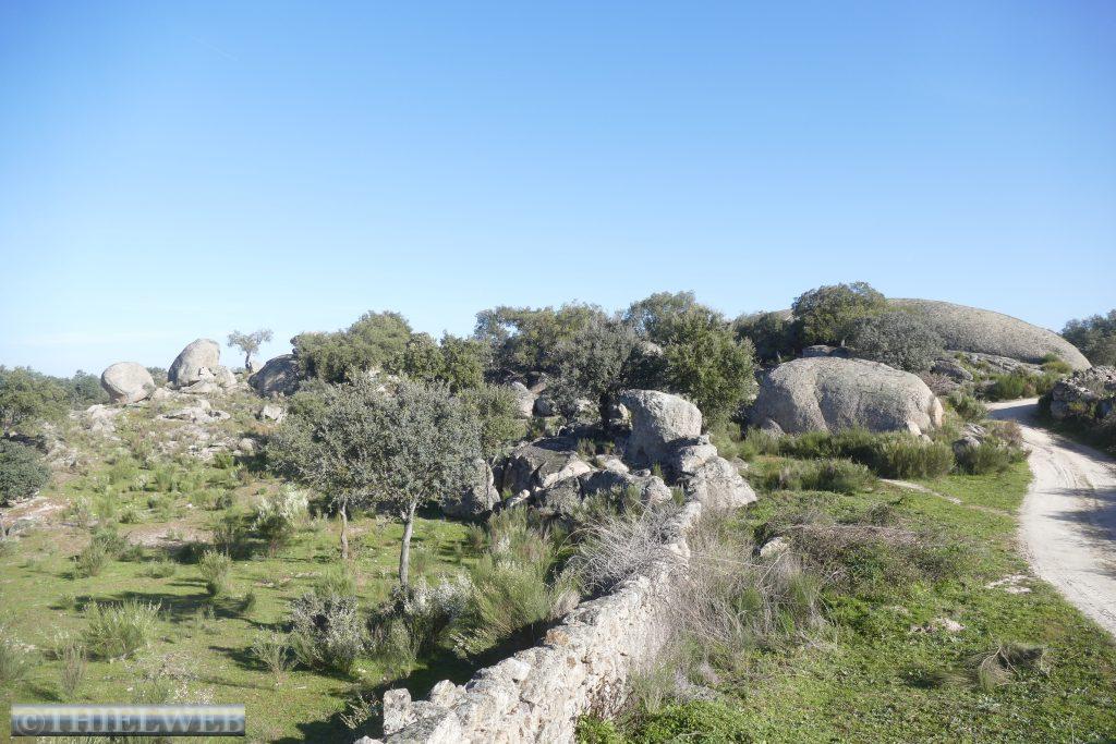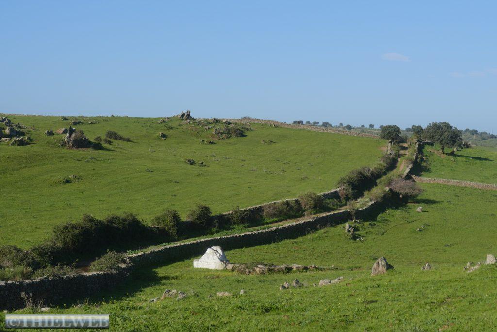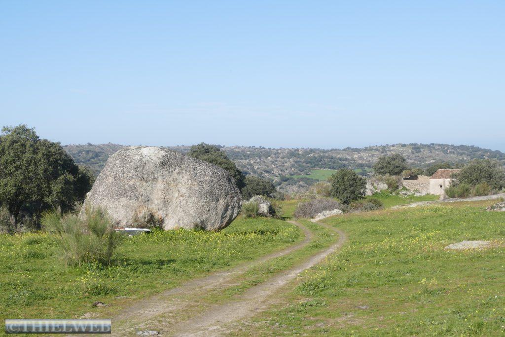 Unser heutiger Wanderweg ist der PPR-CC 98 Salto de Caballo . Erstes Ziel ist die Einsiedelei unserer Lieben Frau von Remedios, der Schutzpatronin von Valencia de Alcántara. Der Salto de Caballo verläuft zwischen Steinmauern und Olivenhainen. Unser Blick schweift in die endlose Landschaft der Extremadura, mit Viehweiden und bis hinüber nach Marvão in Portugal. Dann biegen wir ab und gelangen in Granitlandschaft, ein Material, das die alten Siedler zum Bau von Dolmen wie dem Caballo-Dolmen verwendeten, von dem nur noch ein großer aufrecht stehender Steinblock erhalten ist. Kurz danach erblicken wir den Porra del Burro, eine merkwürdige geologische Formation. Uralte Korkeichen säumen den Weg, der uns zum Schluss auf einer Asphaltstraße zurück nach Valencia de Alcántara bringt.