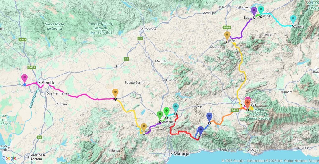 Heute nehmen wir den zweiten Anlauf für unsere Wanderung Los Cahorros de Monachil, die die enge Schlucht des Monachil River durchquert, mit den gigantischen Bergen des Sierra Nevada Nationalparks im Hintergrund. Wir folgen dem Monachil-Fluss bis zum Eingang der Schlucht. Hier wechselt der Weg über 4 Hängebrücken, die letzte ist 65 m lang, die Flussseiten. Nach oben haben wir atemberaubende Ausblicke auf eine einfach beeindruckende Naturkulisse der kolossalen Berge. In der Schlucht gibt es Bereiche, die so eng sind, dass wir uns eng an die Felsen lehnen müssen. An den nahe vertikalen Wänden des Canyons gibt es manchmal eingelassene Metallklammern, an denen wir uns festhalten können. Je weiter wir in die Schlucht kommen, desto enger wird sie, bis zu einem Punkt, an dem die gesamte Schlucht vom Flussbett des Monachil eingenommen wird. An der engsten Stellen ist ein Vorankommen nur möglich, indem man „auf allen Vieren“ geht. Ein Höhepunkt ist die Querung des Taubentunnels (Tunel de las Palomas), ein natürlicher Durchgang unter kolossalen Felsblöcken, die von den Wänden des Canyons fielen und im Canyon hängen blieben, ohne das Bett des Tals vollständig zu blockieren. Dann beginnen sich die Wände des Canyons zu weiten und wir befinden uns in einem wunderschönen Tal umgeben von den rot schimmernden Bergen. Wir folgen weiter der Schlucht und kommen auf die andere Seite zum Gipfel der Schlucht (Cahorros de Cima), von dem wir einen atemberaubenden Blick zurück in die Schlucht und auf Granada haben. Nach dieser schönen Wanderung fahren wir weiter in südwestliche Richtung, entlang von Oliven- und Obstplantagen nach Alhama de Granada.