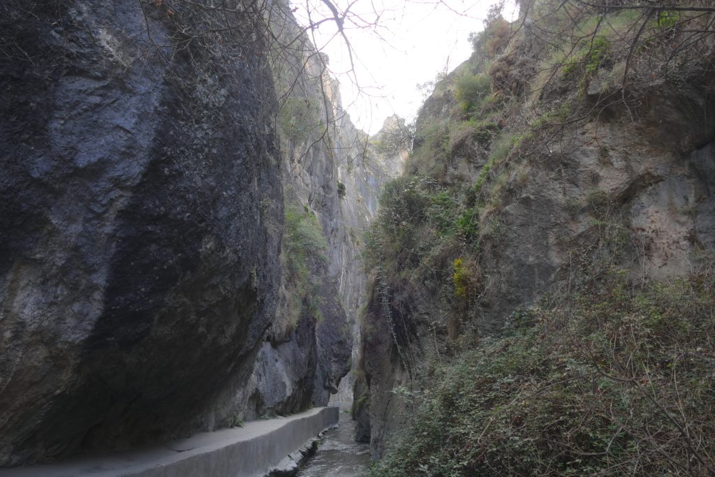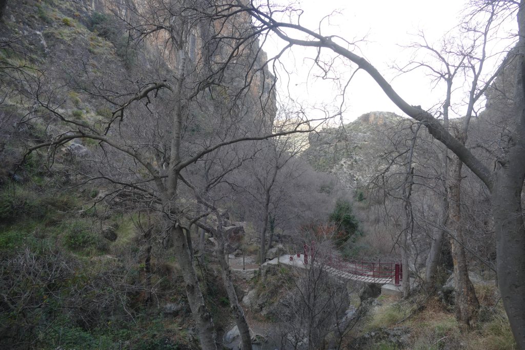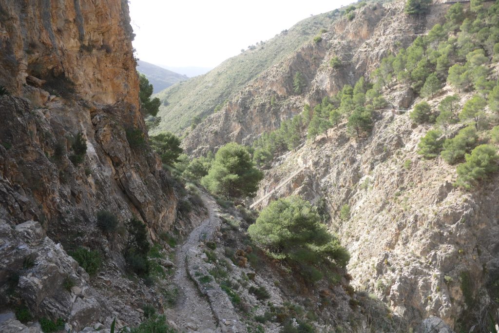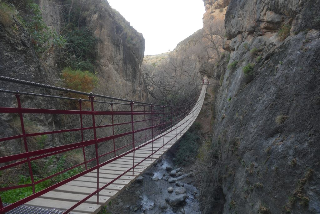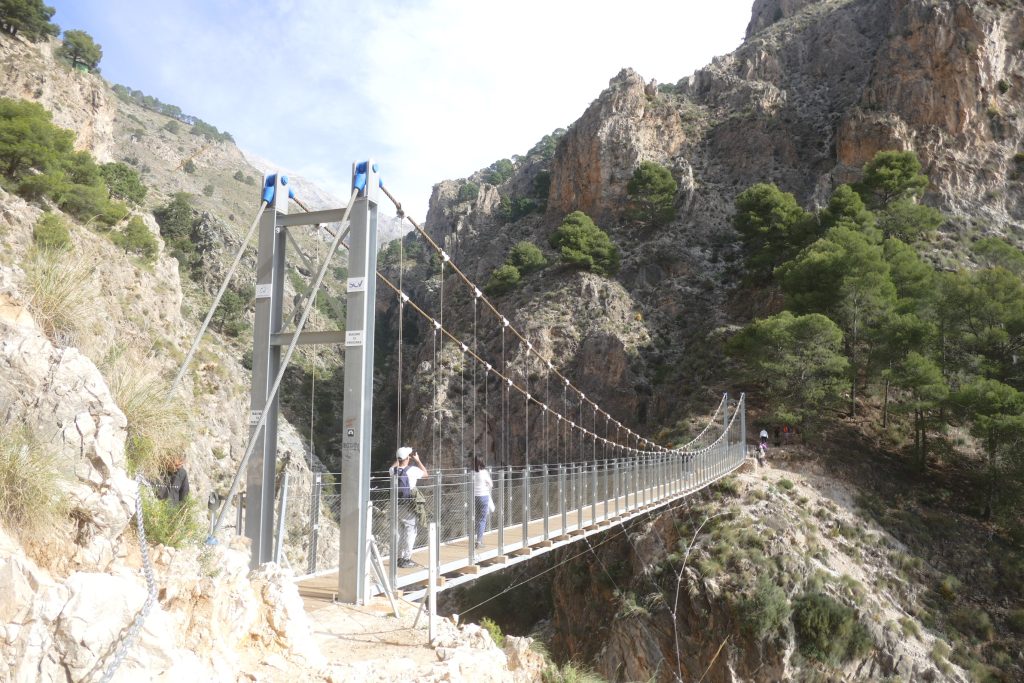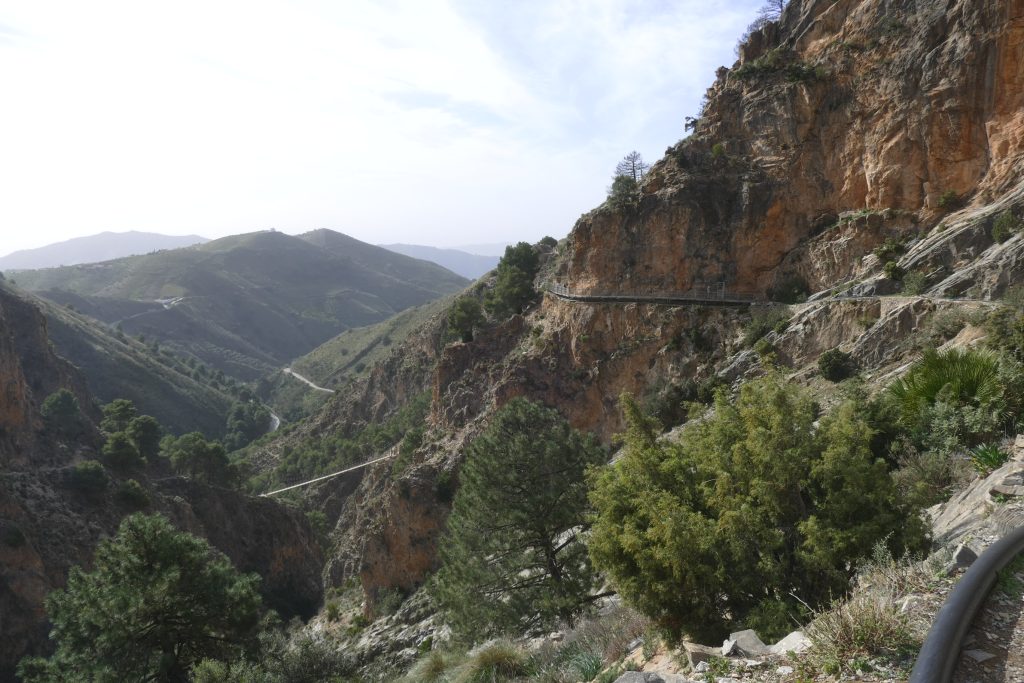 Weiter geht unsere Reise in südliche Richtung. Die Bora hat uns über Nacht warme Luftmassen geschickt, doch auch die milchige Luft. Auf einer landschaftlich schönen Straße mit unendlichen Serpentinen fahren wir an der Sierra de Alhama entlang, verlassen die Provinz Granada und kommen in die Provinz Málaga. Wir klettern auf 1190 Höhenmeter, die wir entlang der Sierra de Tejeda auf kurvenreicher Straße wieder hinunterfahren auf unter 200 m. Für die 47 km benötigen wir über 2 Stunden. In Canillas de Aceituno holen wir uns noch Brot bevor wir uns auf den Sendero el Saltillo Wanderweg begeben, der mit dem Camino del Rey verglichen wird. Er besteht aus einer wunderschönen Wasserkanal Wanderung mit tollen Ausblicken und einer abenteuerlichen Schluchtenwanderung in einzigartiger Natur. Zu Beginn ist der alte Wasserkanal noch sichtbar, dann kommen wir immer weiter in die imposante Schlucht hinein. An senkrechten Felswänden sind Stahlstege. angehängt. Von oben sehen wir schon die Hängebrücke, doch noch geht der Weg weiter geradeaus bis zum Wasserfall El Saltillo. Wir kehren zum Abzweig zur Hängebrücke zurück und nehmen die Stufen hinunter. Nachdem wir die 50 m lange Hängebrücke über den Almanchares überquert haben, wird der Weg abenteuerlich. Der ausgesetzte Pfad, der mit vielen steinernen Treppenstufen steil aufwärts führt, ist mit angebrachten Ketten gesichert. Auf dem Grat angekommen, folgen wir dem Pfad am Hang entlang und gelangen auf einen Wirtschaftsweg und eine Teerstraße, von der bald eine steile Furth abwärts geht. Zum Schluss folgt ein ordentlich steiler Wirtschaftsweg, der uns nach Canillas de Aceitungo zurückbringt.