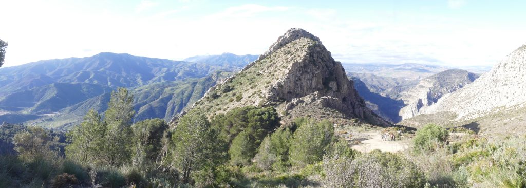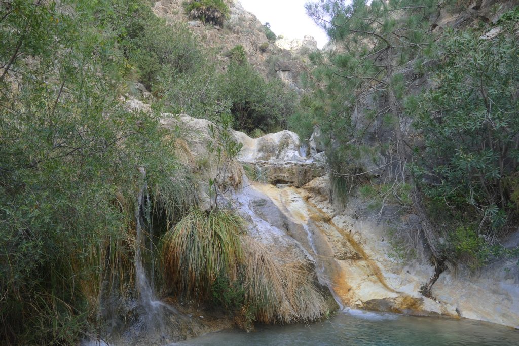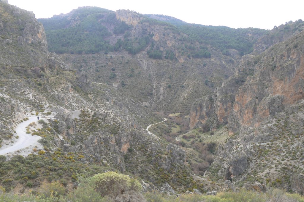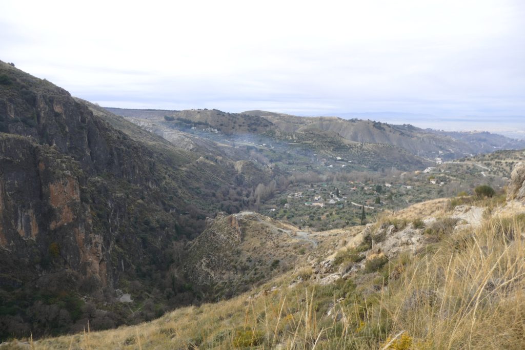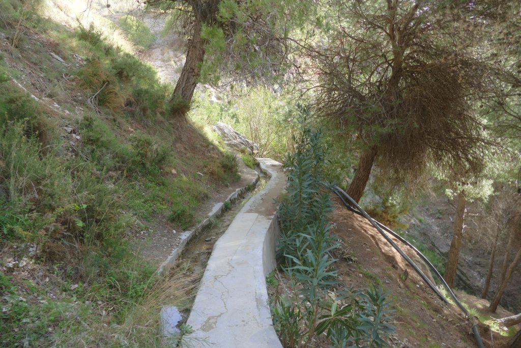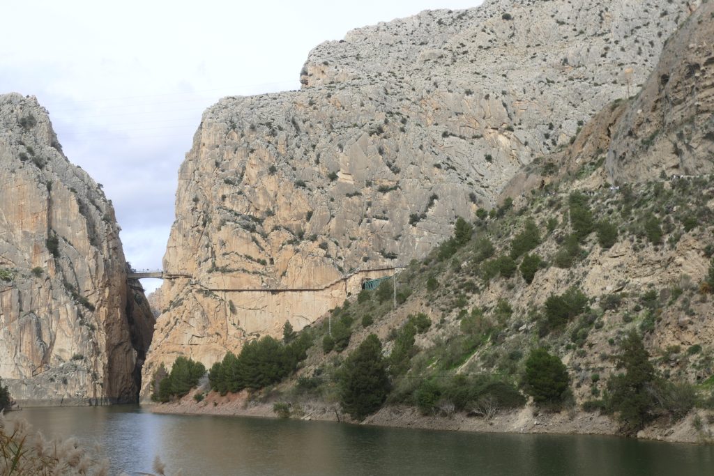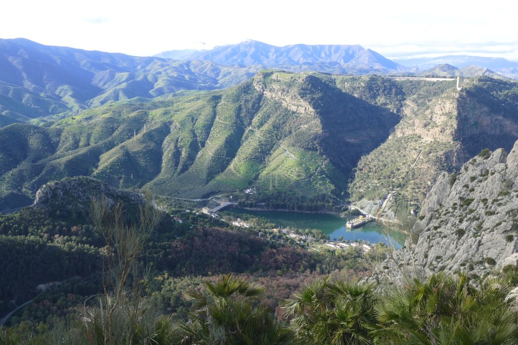 Weiter geht unsere Reise in südliche Richtung. Die Bora hat uns über Nacht warme Luftmassen geschickt, doch auch die milchige Luft. Auf einer landschaftlich schönen Straße mit unendlichen Serpentinen fahren wir an der Sierra de Alhama entlang, verlassen die Provinz Granada und kommen in die Provinz Málaga. Wir klettern auf 1190 Höhenmeter, die wir entlang der Sierra de Tejeda auf kurvenreicher Straße wieder hinunterfahren auf unter 200 m. Für die 47 km benötigen wir über 2 Stunden. In Canillas de Aceituno holen wir uns noch Brot bevor wir uns auf den Sendero el Saltillo Wanderweg begeben, der mit dem Camino del Rey verglichen wird. Er besteht aus einer wunderschönen Wasserkanal Wanderung mit tollen Ausblicken und einer abenteuerlichen Schluchtenwanderung in einzigartiger Natur. Zu Beginn ist der alte Wasserkanal noch sichtbar, dann kommen wir immer weiter in die imposante Schlucht hinein. An senkrechten Felswänden sind Stahlstege. angehängt. Von oben sehen wir schon die Hängebrücke, doch noch geht der Weg weiter geradeaus bis zum Wasserfall El Saltillo. Wir kehren zum Abzweig zur Hängebrücke zurück und nehmen die Stufen hinunter. Nachdem wir die 50 m lange Hängebrücke über den Almanchares überquert haben, wird der Weg abenteuerlich. Der ausgesetzte Pfad, der mit vielen steinernen Treppenstufen steil aufwärts führt, ist mit angebrachten Ketten gesichert. Auf dem Grat angekommen, folgen wir dem Pfad am Hang entlang und gelangen auf einen Wirtschaftsweg und eine Teerstraße, von der bald eine steile Furth abwärts geht. Zum Schluss folgt ein ordentlich steiler Wirtschaftsweg, der uns nach Canillas de Aceitungo zurückbringt.
