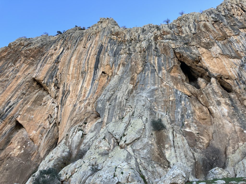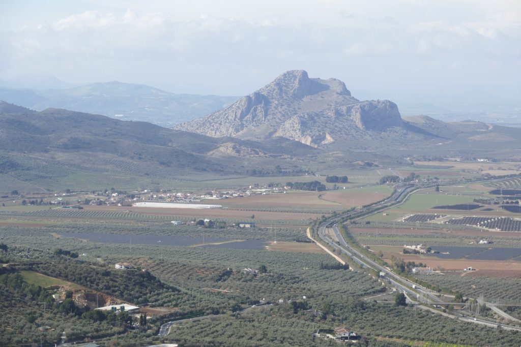 Der Peña de los Enamorados wirkt aus der südwestlichen Perspektive wie der Kopf eines Indianerhäuptlings mit nach oben liegenden Federn. Es gibt eine Wanderung auf den Berg, die wir heute unternehmen wollen. Vom Parkplatz gehen wir auf den Bahngleisen und über eine Brücke. Dann in Richtung Fluss Guadalhorce und aufwärts am Hang. Hier müssen wir einen Zaun überwinden und später ein eisernes Tor. Der Pfad ist eher ein Tierpfad und nur ab und an sehen wir Steinmännchen. An der Steilwand, die wir schon bald erreichen, sind mehrere Höhlen zu erkennen. Nun können wir nur noch dem Navi folgen, müssen über Steine hinaufklettern und immer wieder den Weg suchen. Wir sind schon fast zur Hälfte um den Peña de los Enamorados herumgelaufen und am Kinn angekommen. Eigentlich wollten wir nun nach oben zum Gipfel gelangen. Doch hier wird uns die Kletterei zu viel. Unten sehen wir die Bahngleise und steigen hinab. Eine große Herde der Iberischen Ziegen läuft den Hang hinauf. Vom Parkplatz fahren wir danach weiter nach Antequera, und haben Glück, dass gerade ein Platz frei wird.