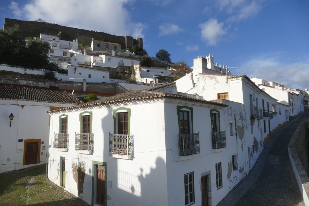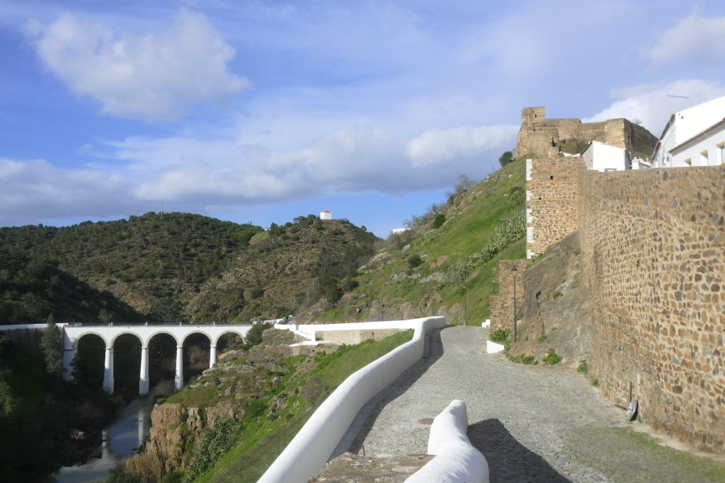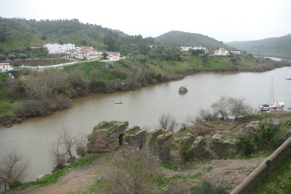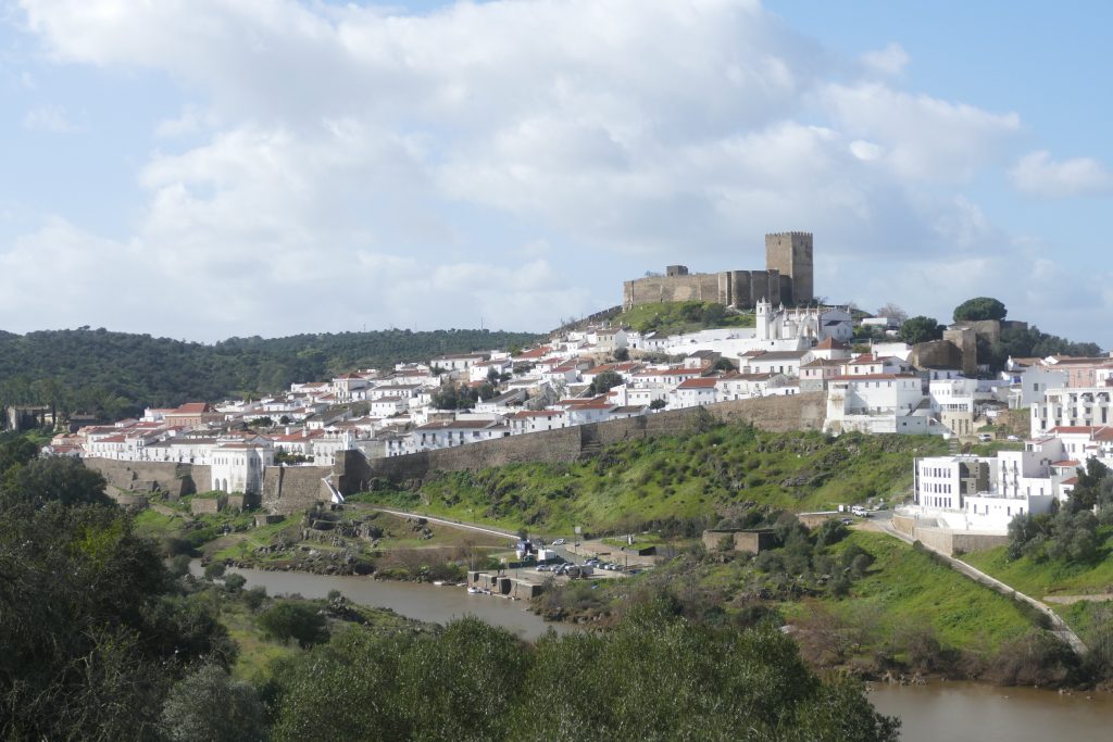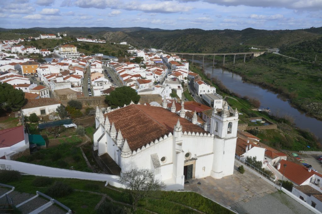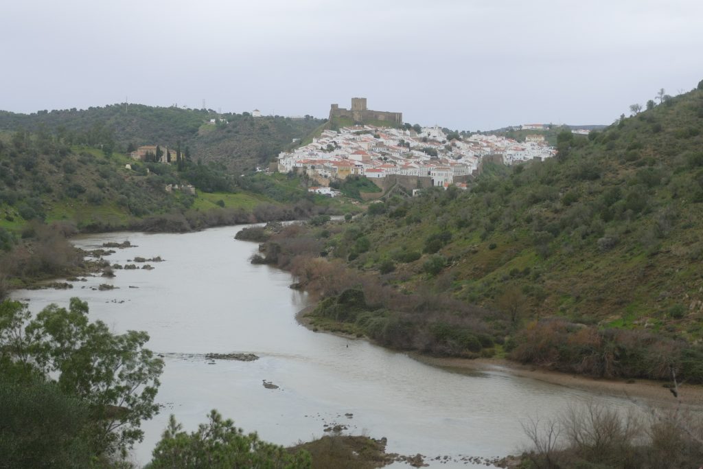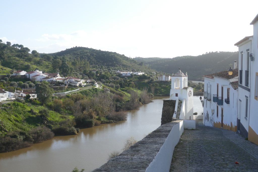 Es ist immer noch recht kühl und einzelne Wolken schütten sich aus, als wir Richtung Huelva fahren, das wir jedoch liegen lassen und weiter nach Portugal, nach Mertola fahren. Eigentlich wollten wir schon längst hier sein, doch waren die Nationalparks und die Wanderungen in Spanien einfach zu grandios. Am frühen Nachmittag erreichen wir Mertola und müssen unsere Uhren um eine Stunde zurückstellen. Nach einer Pause sehen wir uns den Ort mit den weiß getünchten Häusern am Hang des Rio Guadiana an. Spuren von maurischen und römischen Einflüssen sind noch heute in den typisch portugiesischen Gassen sichtbar. Neben der Touristinformation im Mértola-Haus ist in einer kleinen Wohnung zu sehen, wie man vor ca. 30 Jahren mit 7 Personen lebte. Wir gehen hinauf zur Igreja Matriz, deren Dekorationen, Ornamente und der Mirhab sowie die Zinnen davon zeugen, dass es früher eine Moschee war. Es gibt mehrere kleine, liebevoll eingerichtete Museen, die das frühere Handwerk darstellen. Hoch oben über der Stadt ist das Castelo mit der mächtigen Stadtmauer, die vor Invasoren schützte und der Reiterstatue von Ibn Qasi davor. Von oben haben wir eine schöne Aussicht über die Landschaft und den Rio Guadiana. Wir umrunden die Stadt und kommen noch zum Uhrturm, dem fotogensten Element der Stadt.