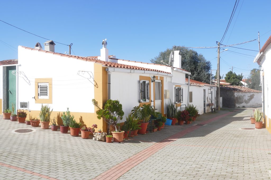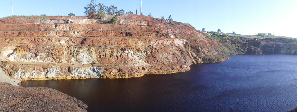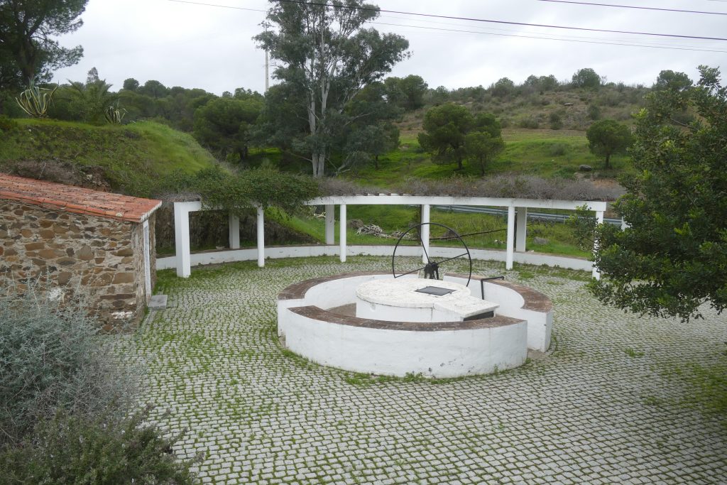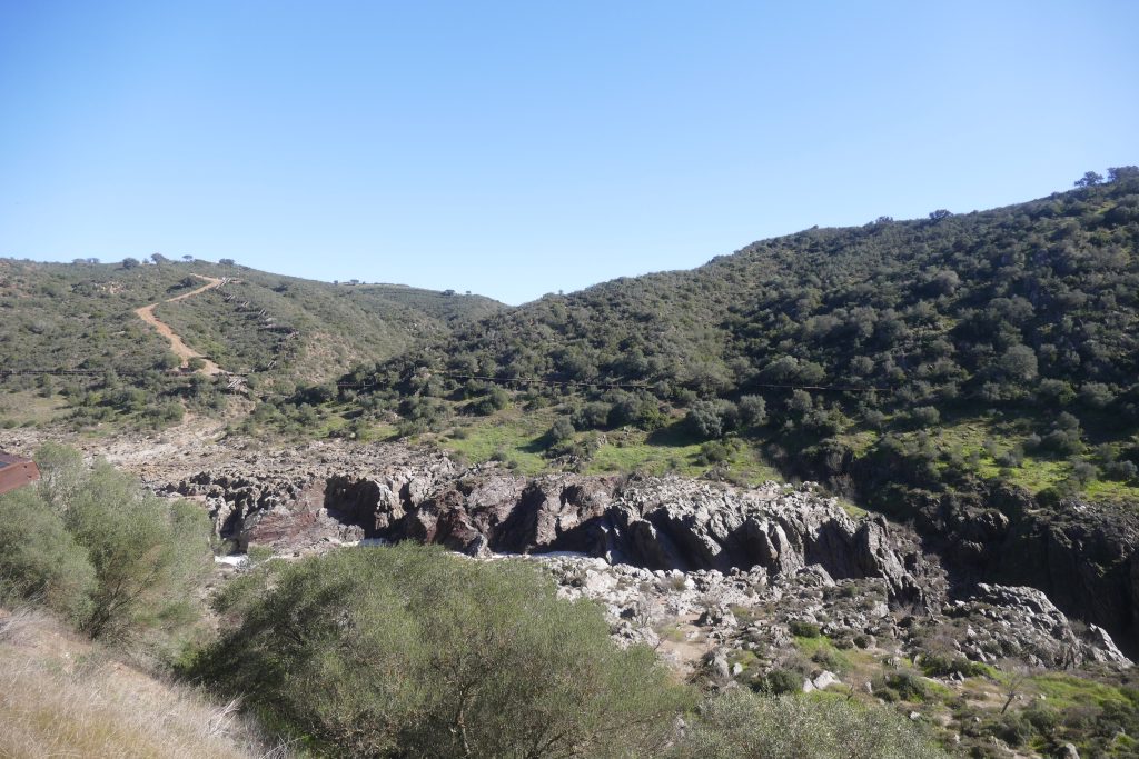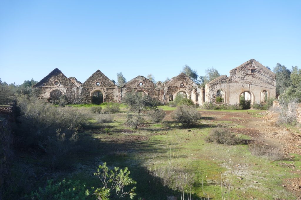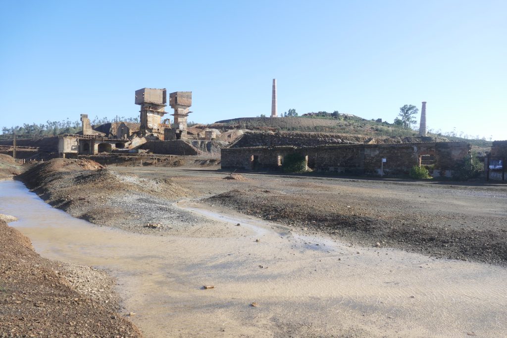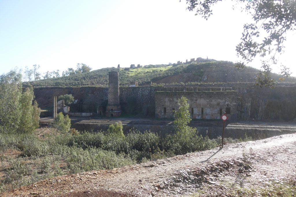 In den Minas de São Domingos gewannen bereits die Phönizier aus dem Erz neben Kupfer auch Gold und Silber. In römischer Zeit wurde das Bergwerk bis in eine Tiefe von 40 m ausgebaut. Die industrielle Ausbeutung der Lagerstätte durch die Firma Manson and Barry, die die Sabina Mining Company gründete, begann 1858 bis zur Schließung 1966. Es wurde keine Sanierung der Umweltschäden durchgeführt, was im Hinblick auf die Grundwasserverschmutzung beunruhigend war. Die Halden des Bergwerkes werden auf mehrere 100.000 Tonnen geschätzt und enthalten neben einem hohen Sulfidanteil auch Mauerreste und sonstige Bergbauabfälle. Mittlerweile ist das Gebiet saniert. Ausblühungen von Sulfaten wie Melanterit und Jarosit sind jedoch heute an vielen Stellen offen sichtbar. Heute besichtigen wir das weitläufige Minengelände auf einer Wanderung, vorbei an Resten der Hochöfen, Förderanlagen und Gebäuden. Wir wandern bis zum kleinen Dorf Santana de Cambas, wo wir auf die Schmugglerroute nach Montes Altos abbiegen. Im leichten Auf und Ab haben wir einen weiten Blick auf die schöne Landschaft. Wieder zurück am Wohnmobil fahren wir nach Mértola zum bereits bekannten Parkplatz.