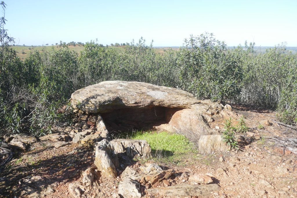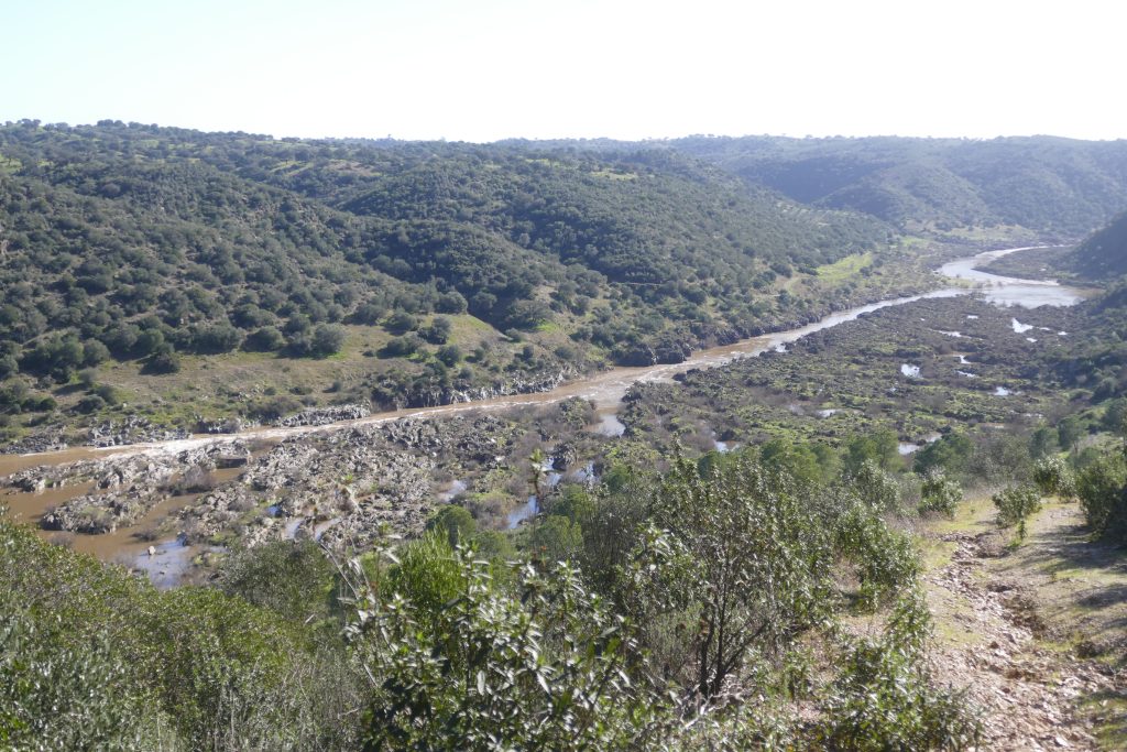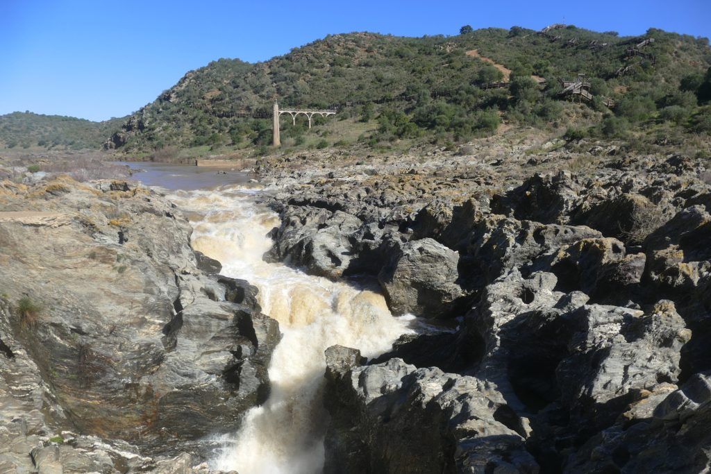 Heute wollen wir eine weite Wanderung im 70.000 Hektar großen Parque Natural do Vale do Guadiana unternehmen. Wir fahren zum Ausgangspunkt der Wanderung zu den Stromschnellen am Guadiana über das Dorf Amendoeira nach Pulo do Lobo. „Cascata do Pulo do Lobo“ bedeutet so viel wie „Wasserfall am Wolfsprung“, wo sich an einer engen Stelle zwischen den Felsen der Rio Guadiana hindurchquetscht. Er ist der größte Wasserfall im Süden von Portugal und fällt aus mehr als 20 m Höhe in die felsige Schlucht hinab. Wir wandern zuerst die kleine Straße aufwärts bis zu dem Megalith Anta das Pias. Etwas enttäuschend klein wirkt er nach den Fotos im Netz. Ein breiter Weg führt hinunter zum Guadiana wo wir schon die ersten Stromschnellen sehen. An einer Ruine biegt der Weg steil bergab und wird zu einem schmalen Pfad. Jetzt wird es etwas kniffelig, den Weg am Fluss entlang durch Wiesen und über Steine zu folgen. Schon bald sehen wir die Rauchfahne des Wasserfalls. Da es in den letzten Tagen geregnet hat, führt der Fluss viel Wasser, sodass es ein ansehnlicher Wasserfall ist. Gegenüber erkennen wir einen Holzsteg mit vielen Treppen. Da müssen wir uns erkundigen, wie wir dorthin kommen. Vom Wasserfall führt dann ein steiler Weg wieder hinauf zum Parkplatz. Nach einer Pause fahren wir weiter nach Beja.