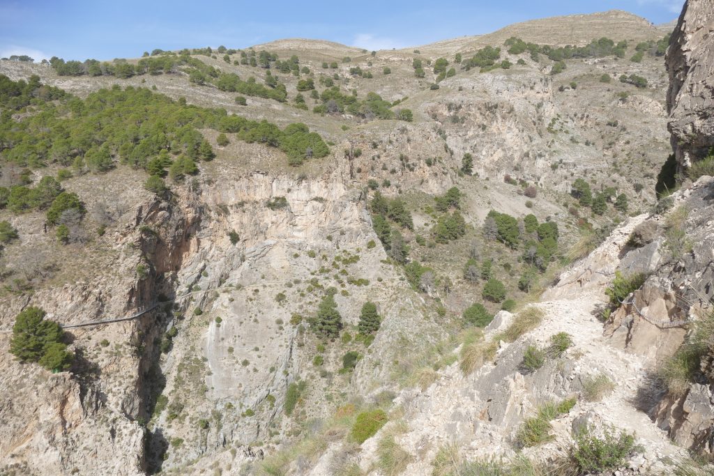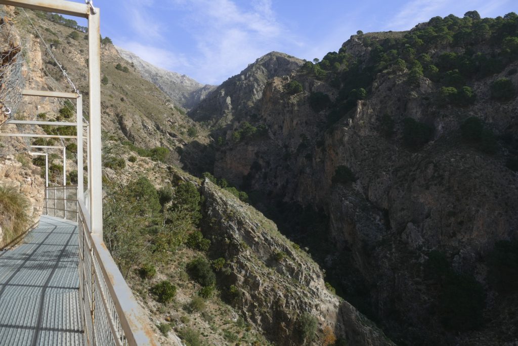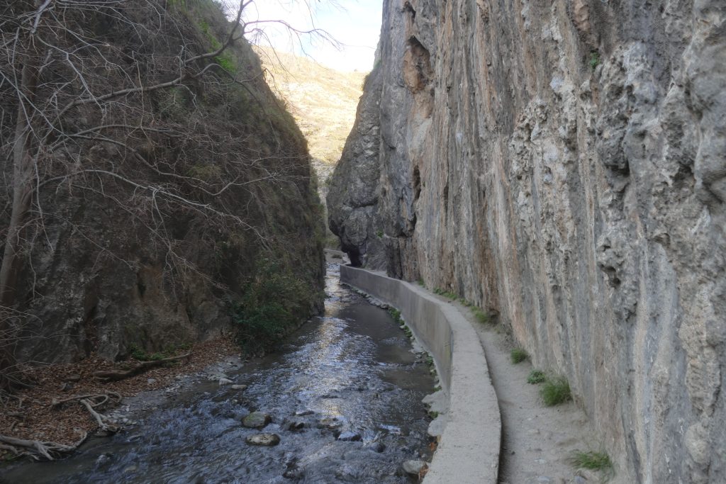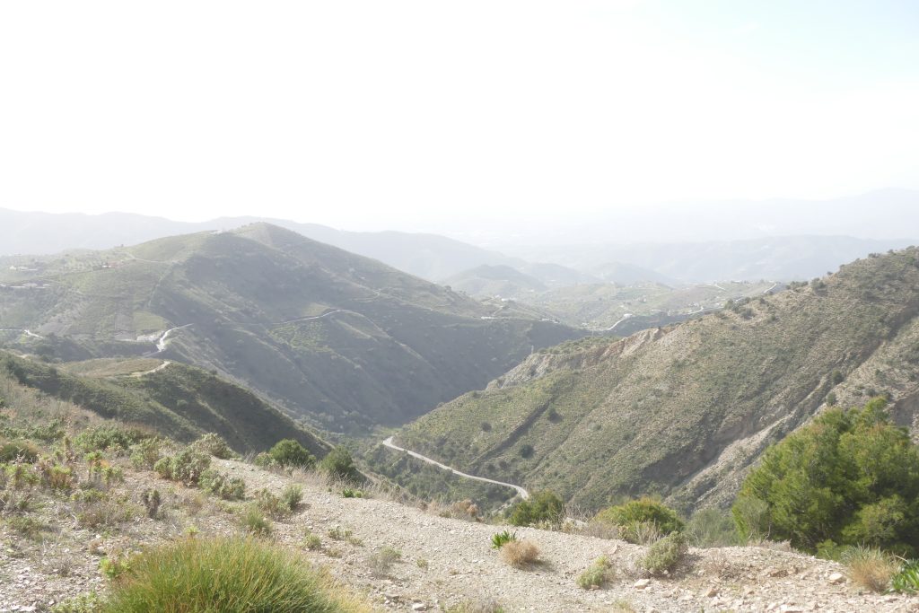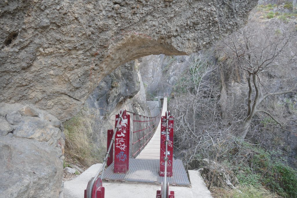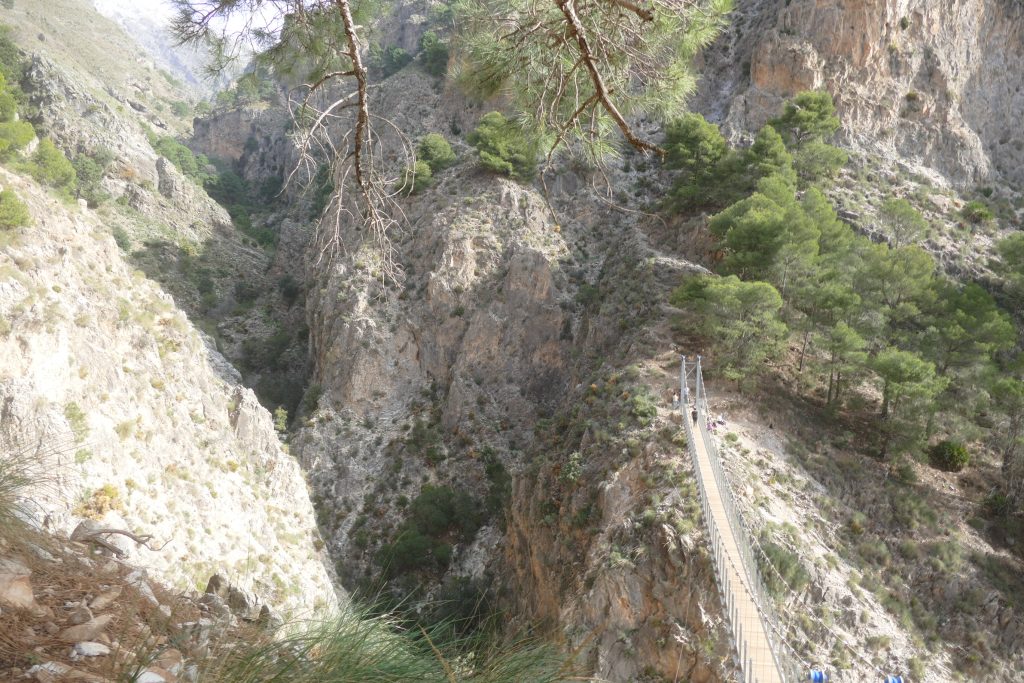 Weiter geht unsere Reise in südliche Richtung. Die Bora hat uns über Nacht warme Luftmassen geschickt, doch auch die milchige Luft. Auf einer landschaftlich schönen Straße mit unendlichen Serpentinen fahren wir an der Sierra de Alhama entlang, verlassen die Provinz Granada und kommen in die Provinz Málaga. Wir klettern auf 1190 Höhenmeter, die wir entlang der Sierra de Tejeda auf kurvenreicher Straße wieder hinunterfahren auf unter 200 m. Für die 47 km benötigen wir über 2 Stunden. In Canillas de Aceituno holen wir uns noch Brot bevor wir uns auf den Sendero el Saltillo Wanderweg begeben, der mit dem Camino del Rey verglichen wird. Er besteht aus einer wunderschönen Wasserkanal Wanderung mit tollen Ausblicken und einer abenteuerlichen Schluchtenwanderung in einzigartiger Natur. Zu Beginn ist der alte Wasserkanal noch sichtbar, dann kommen wir immer weiter in die imposante Schlucht hinein. An senkrechten Felswänden sind Stahlstege. angehängt. Von oben sehen wir schon die Hängebrücke, doch noch geht der Weg weiter geradeaus bis zum Wasserfall El Saltillo. Wir kehren zum Abzweig zur Hängebrücke zurück und nehmen die Stufen hinunter. Nachdem wir die 50 m lange Hängebrücke über den Almanchares überquert haben, wird der Weg abenteuerlich. Der ausgesetzte Pfad, der mit vielen steinernen Treppenstufen steil aufwärts führt, ist mit angebrachten Ketten gesichert. Auf dem Grat angekommen, folgen wir dem Pfad am Hang entlang und gelangen auf einen Wirtschaftsweg und eine Teerstraße, von der bald eine steile Furth abwärts geht. Zum Schluss folgt ein ordentlich steiler Wirtschaftsweg, der uns nach Canillas de Aceitungo zurückbringt.