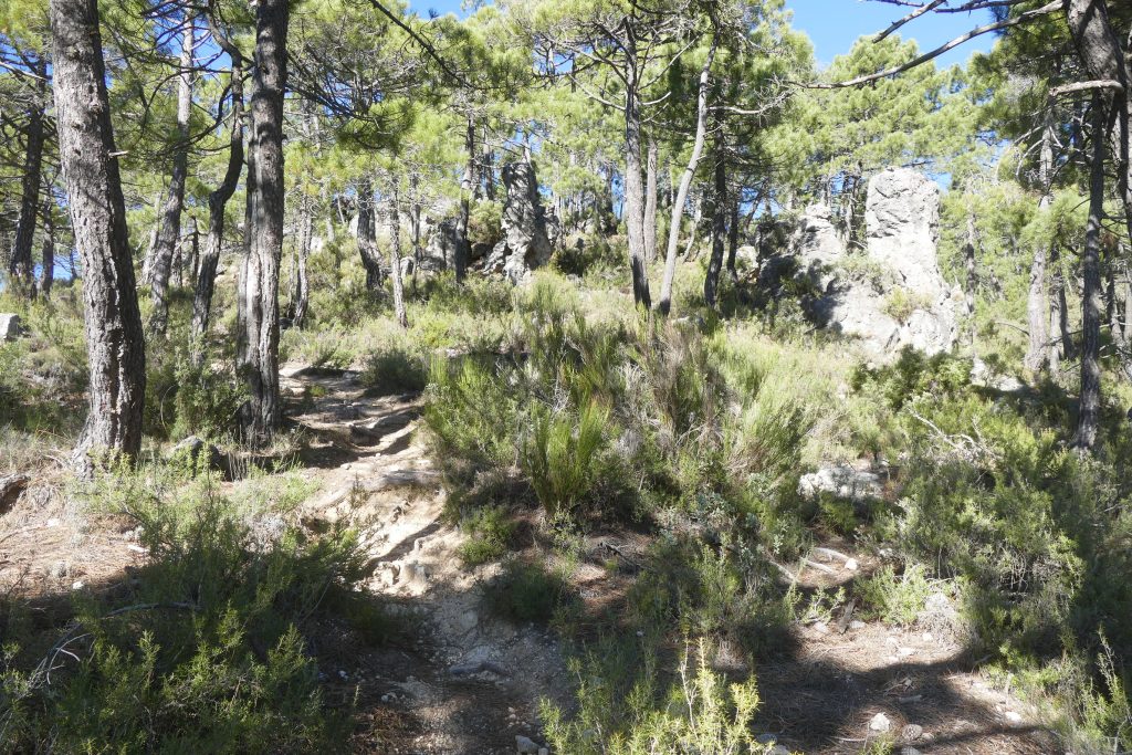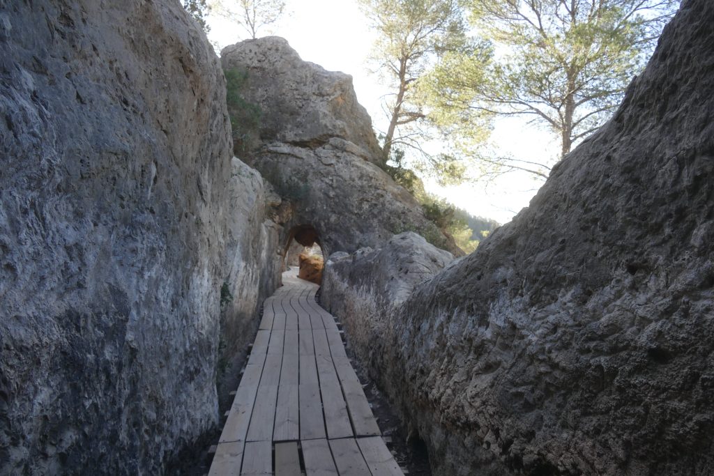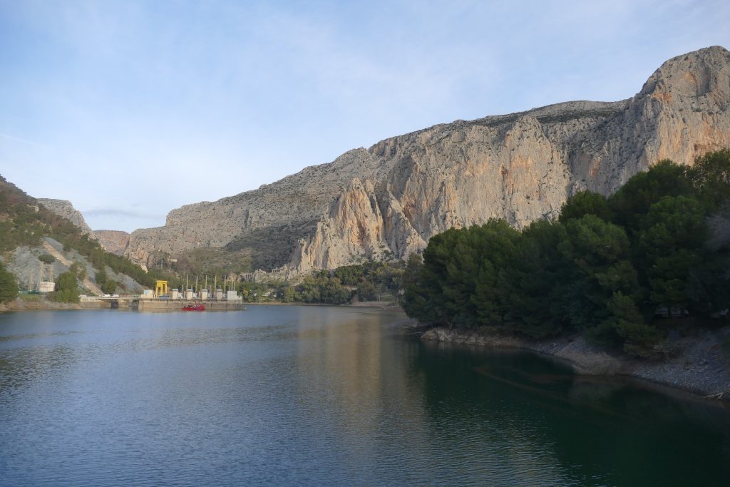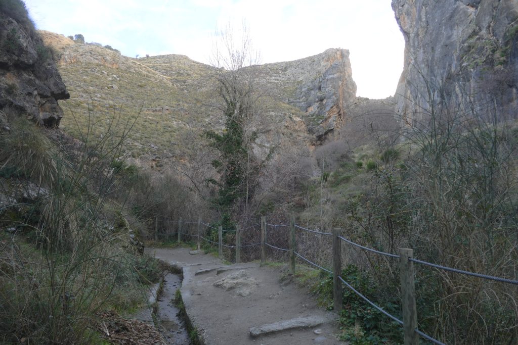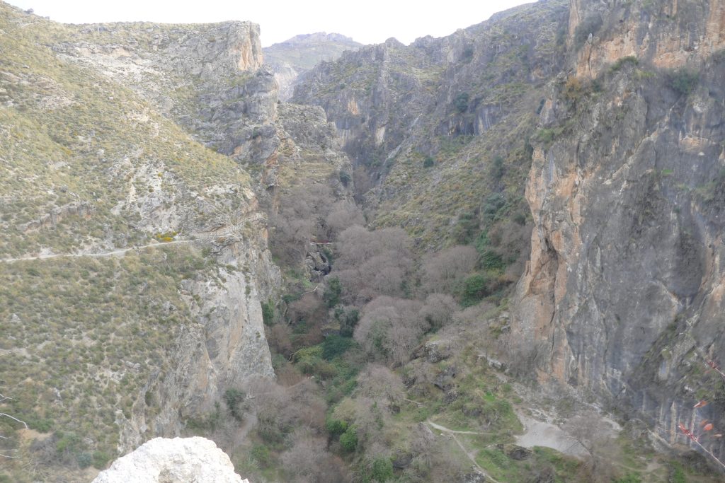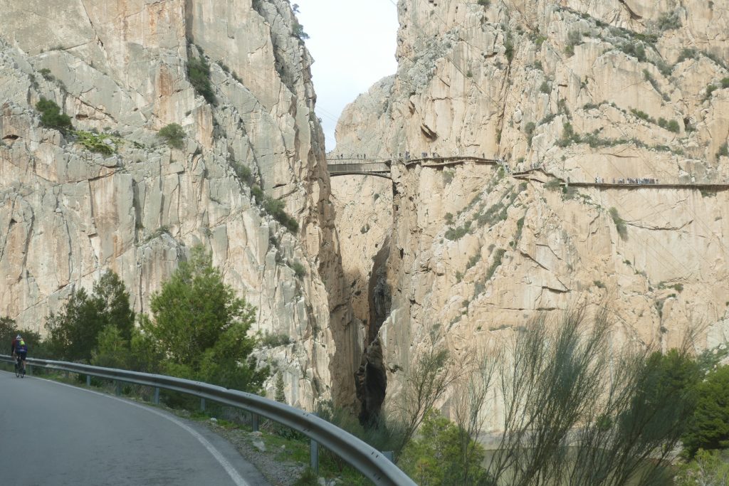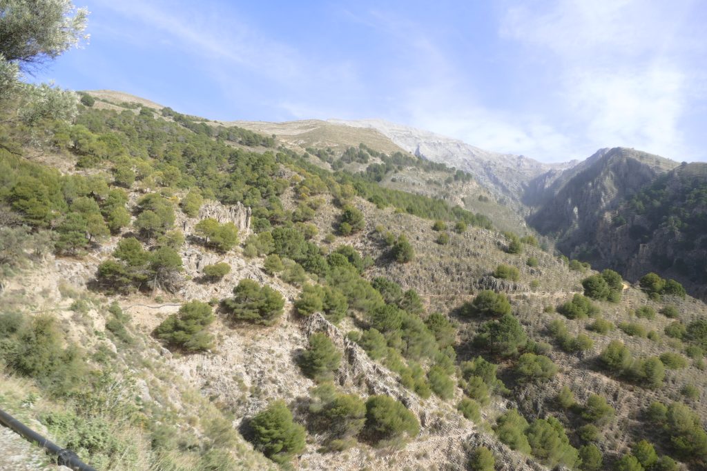 Weiter geht unsere Reise in südliche Richtung. Die Bora hat uns über Nacht warme Luftmassen geschickt, doch auch die milchige Luft. Auf einer landschaftlich schönen Straße mit unendlichen Serpentinen fahren wir an der Sierra de Alhama entlang, verlassen die Provinz Granada und kommen in die Provinz Málaga. Wir klettern auf 1190 Höhenmeter, die wir entlang der Sierra de Tejeda auf kurvenreicher Straße wieder hinunterfahren auf unter 200 m. Für die 47 km benötigen wir über 2 Stunden. In Canillas de Aceituno holen wir uns noch Brot bevor wir uns auf den Sendero el Saltillo Wanderweg begeben, der mit dem Camino del Rey verglichen wird. Er besteht aus einer wunderschönen Wasserkanal Wanderung mit tollen Ausblicken und einer abenteuerlichen Schluchtenwanderung in einzigartiger Natur. Zu Beginn ist der alte Wasserkanal noch sichtbar, dann kommen wir immer weiter in die imposante Schlucht hinein. An senkrechten Felswänden sind Stahlstege. angehängt. Von oben sehen wir schon die Hängebrücke, doch noch geht der Weg weiter geradeaus bis zum Wasserfall El Saltillo. Wir kehren zum Abzweig zur Hängebrücke zurück und nehmen die Stufen hinunter. Nachdem wir die 50 m lange Hängebrücke über den Almanchares überquert haben, wird der Weg abenteuerlich. Der ausgesetzte Pfad, der mit vielen steinernen Treppenstufen steil aufwärts führt, ist mit angebrachten Ketten gesichert. Auf dem Grat angekommen, folgen wir dem Pfad am Hang entlang und gelangen auf einen Wirtschaftsweg und eine Teerstraße, von der bald eine steile Furth abwärts geht. Zum Schluss folgt ein ordentlich steiler Wirtschaftsweg, der uns nach Canillas de Aceitungo zurückbringt.