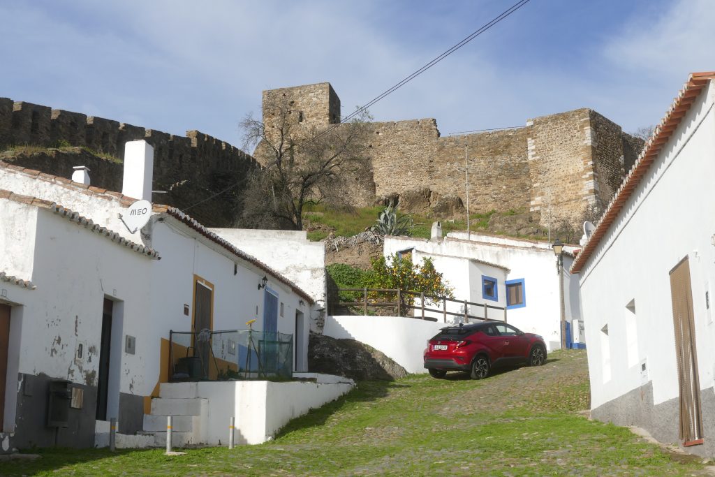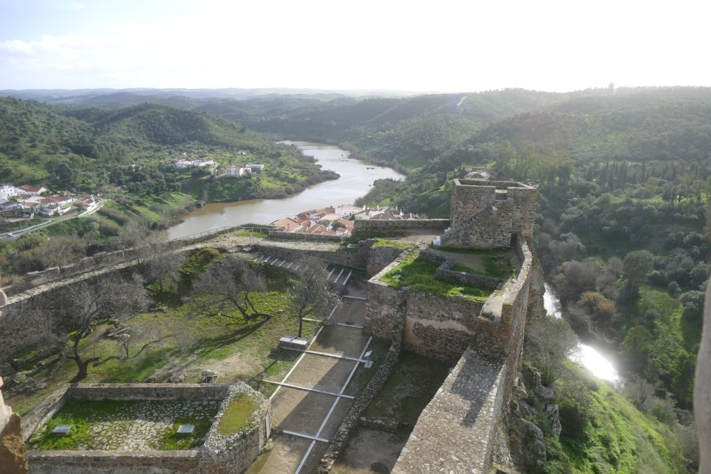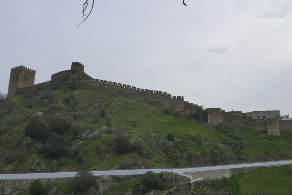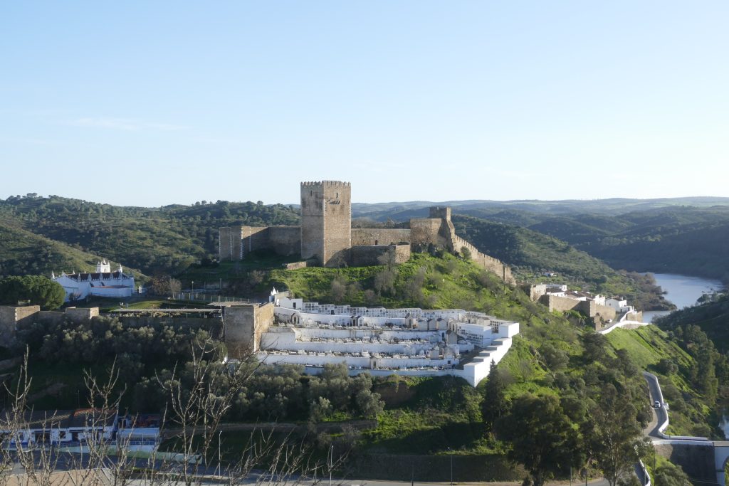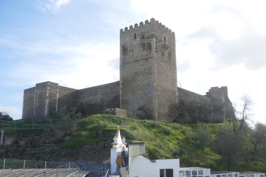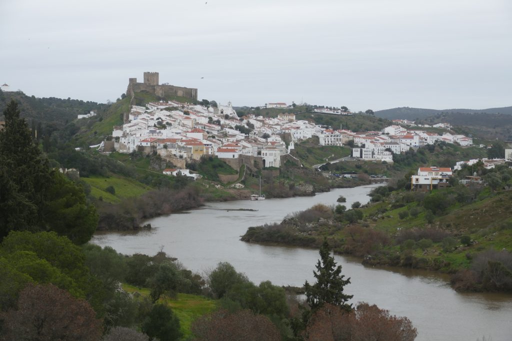 Es ist immer noch recht kühl und einzelne Wolken schütten sich aus, als wir Richtung Huelva fahren, das wir jedoch liegen lassen und weiter nach Portugal, nach Mertola fahren. Eigentlich wollten wir schon längst hier sein, doch waren die Nationalparks und die Wanderungen in Spanien einfach zu grandios. Am frühen Nachmittag erreichen wir Mertola und müssen unsere Uhren um eine Stunde zurückstellen. Nach einer Pause sehen wir uns den Ort mit den weiß getünchten Häusern am Hang des Rio Guadiana an. Spuren von maurischen und römischen Einflüssen sind noch heute in den typisch portugiesischen Gassen sichtbar. Neben der Touristinformation im Mértola-Haus ist in einer kleinen Wohnung zu sehen, wie man vor ca. 30 Jahren mit 7 Personen lebte. Wir gehen hinauf zur Igreja Matriz, deren Dekorationen, Ornamente und der Mirhab sowie die Zinnen davon zeugen, dass es früher eine Moschee war. Es gibt mehrere kleine, liebevoll eingerichtete Museen, die das frühere Handwerk darstellen. Hoch oben über der Stadt ist das Castelo mit der mächtigen Stadtmauer, die vor Invasoren schützte und der Reiterstatue von Ibn Qasi davor. Von oben haben wir eine schöne Aussicht über die Landschaft und den Rio Guadiana. Wir umrunden die Stadt und kommen noch zum Uhrturm, dem fotogensten Element der Stadt.