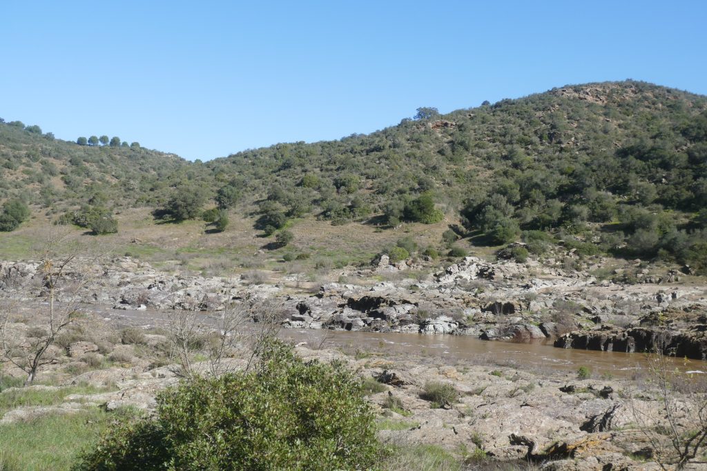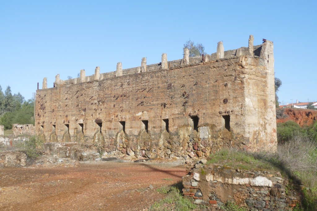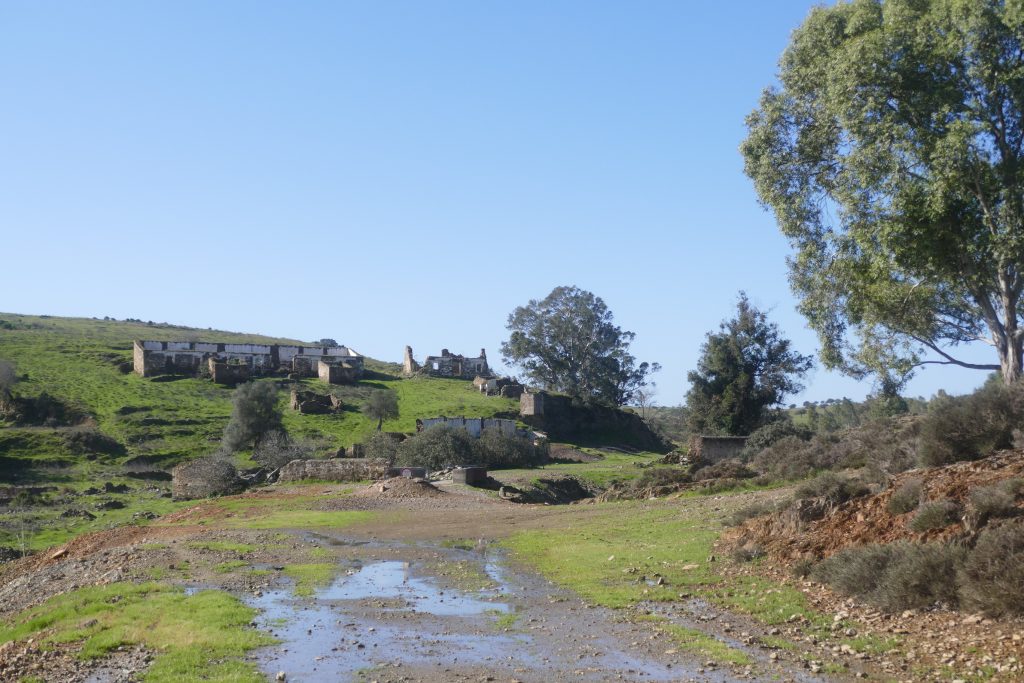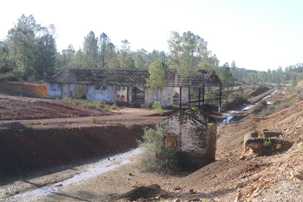 In den Minas de São Domingos gewannen bereits die Phönizier aus dem Erz neben Kupfer auch Gold und Silber. In römischer Zeit wurde das Bergwerk bis in eine Tiefe von 40 m ausgebaut. Die industrielle Ausbeutung der Lagerstätte durch die Firma Manson and Barry, die die Sabina Mining Company gründete, begann 1858 bis zur Schließung 1966. Es wurde keine Sanierung der Umweltschäden durchgeführt, was im Hinblick auf die Grundwasserverschmutzung beunruhigend war. Die Halden des Bergwerkes werden auf mehrere 100.000 Tonnen geschätzt und enthalten neben einem hohen Sulfidanteil auch Mauerreste und sonstige Bergbauabfälle. Mittlerweile ist das Gebiet saniert. Ausblühungen von Sulfaten wie Melanterit und Jarosit sind jedoch heute an vielen Stellen offen sichtbar. Heute besichtigen wir das weitläufige Minengelände auf einer Wanderung, vorbei an Resten der Hochöfen, Förderanlagen und Gebäuden. Wir wandern bis zum kleinen Dorf Santana de Cambas, wo wir auf die Schmugglerroute nach Montes Altos abbiegen. Im leichten Auf und Ab haben wir einen weiten Blick auf die schöne Landschaft. Wieder zurück am Wohnmobil fahren wir nach Mértola zum bereits bekannten Parkplatz.
