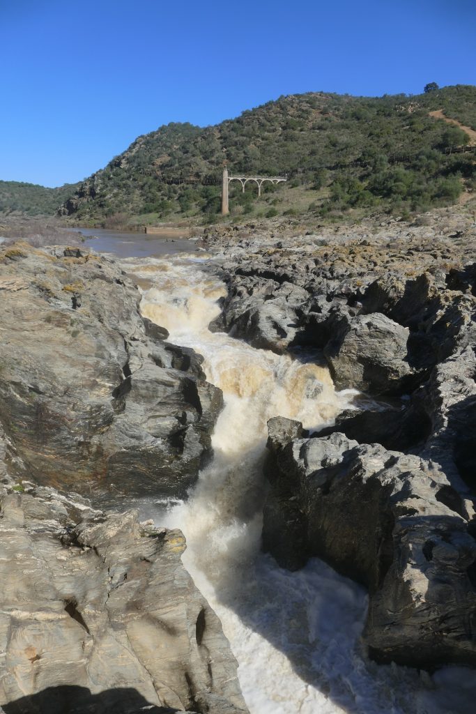 Heute wollen wir eine weite Wanderung im 70.000 Hektar großen Parque Natural do Vale do Guadiana unternehmen. Wir fahren zum Ausgangspunkt der Wanderung zu den Stromschnellen am Guadiana über das Dorf Amendoeira nach Pulo do Lobo. „Cascata do Pulo do Lobo“ bedeutet so viel wie „Wasserfall am Wolfsprung“, wo sich an einer engen Stelle zwischen den Felsen der Rio Guadiana hindurchquetscht. Er ist der größte Wasserfall im Süden von Portugal und fällt aus mehr als 20 m Höhe in die felsige Schlucht hinab. Wir wandern zuerst die kleine Straße aufwärts bis zu dem Megalith Anta das Pias. Etwas enttäuschend klein wirkt er nach den Fotos im Netz. Ein breiter Weg führt hinunter zum Guadiana wo wir schon die ersten Stromschnellen sehen. An einer Ruine biegt der Weg steil bergab und wird zu einem schmalen Pfad. Jetzt wird es etwas kniffelig, den Weg am Fluss entlang durch Wiesen und über Steine zu folgen. Schon bald sehen wir die Rauchfahne des Wasserfalls. Da es in den letzten Tagen geregnet hat, führt der Fluss viel Wasser, sodass es ein ansehnlicher Wasserfall ist. Gegenüber erkennen wir einen Holzsteg mit vielen Treppen. Da müssen wir uns erkundigen, wie wir dorthin kommen. Vom Wasserfall führt dann ein steiler Weg wieder hinauf zum Parkplatz. Nach einer Pause fahren wir weiter nach Beja.