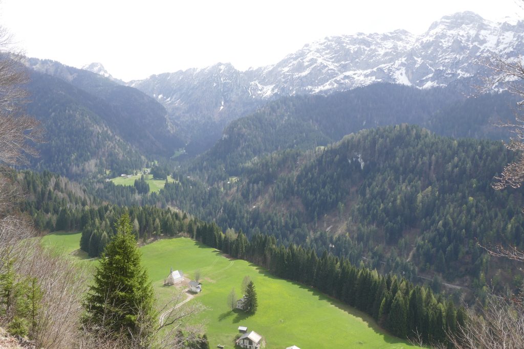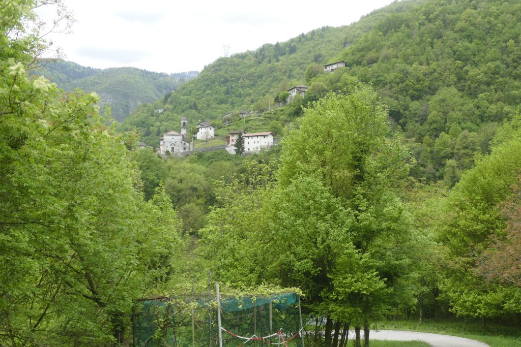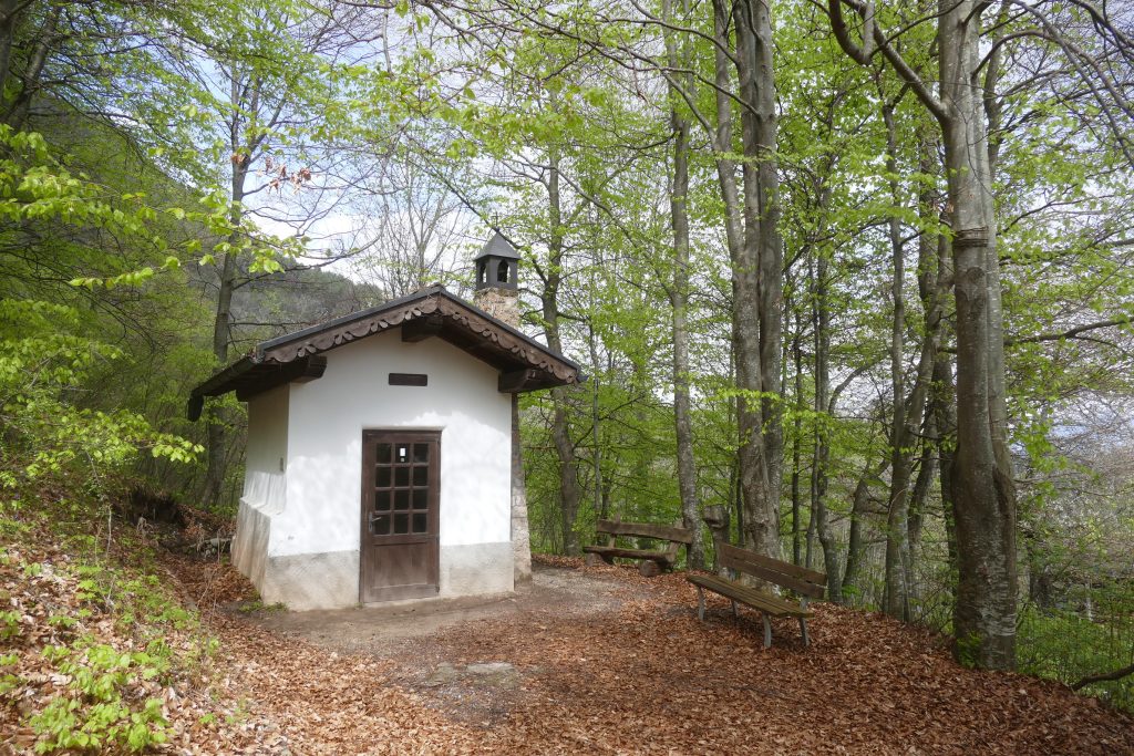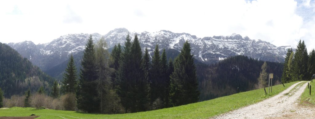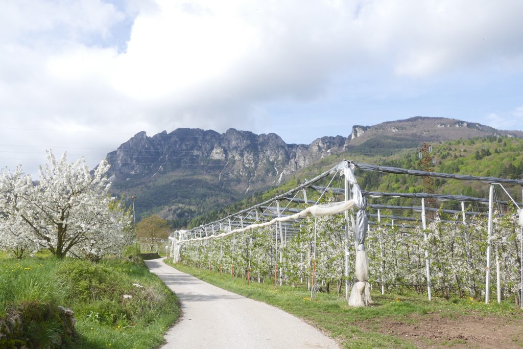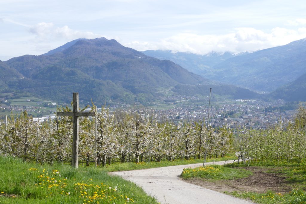 Heute begeben wir uns auf die Wanderung zwischen Cimirlo und Pergine. Eine steile Straße führt uns bis Susa durch blühende Obstplantagen und immer weiter hinauf auf einem Waldweg zum Spiaz dei Quettro Soldi, unserem höchsten Punkt auf 990 m Höhe. Von hier aus folgen wir dem Wanderschild nach Malga Tomba immer weiter bergab an einer Hütte vorbei zur kleinen Kapelle. Weiter auf dem Waldweg, der nun steil bergab führt, gehen wir zum Passo del Cimirlo auf 730 m Höhe. Danach wechselt der Weg zum Teil in eine Asphaltstraße, eine grob gepflasterte Straße und einen Schotterweg bis wir über den Ort Roncogno wieder Pergine Valsugana erreichen.