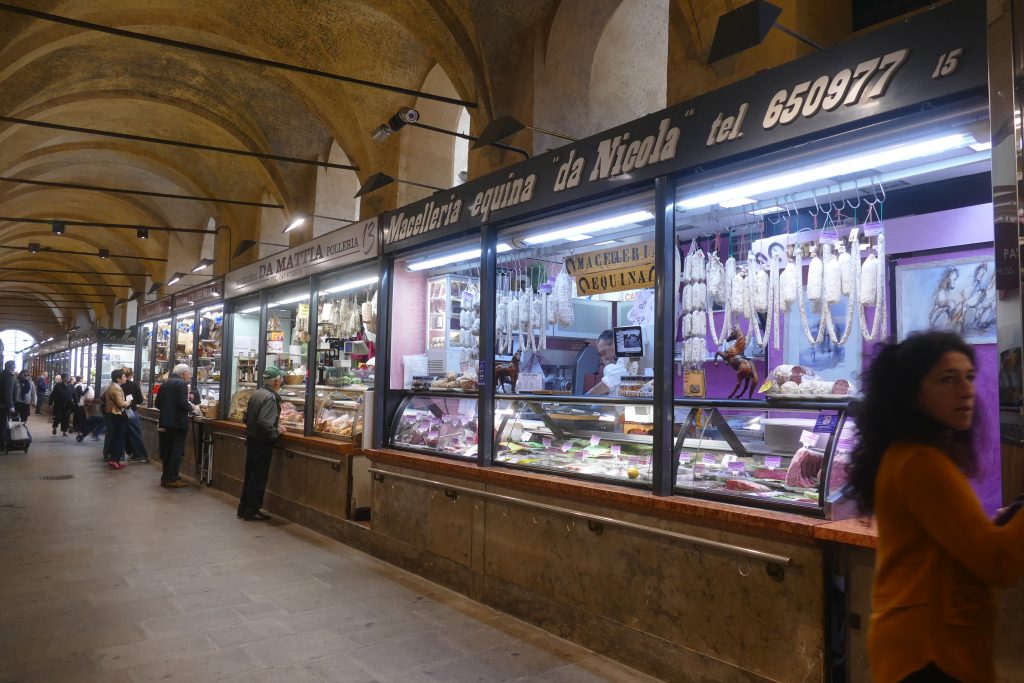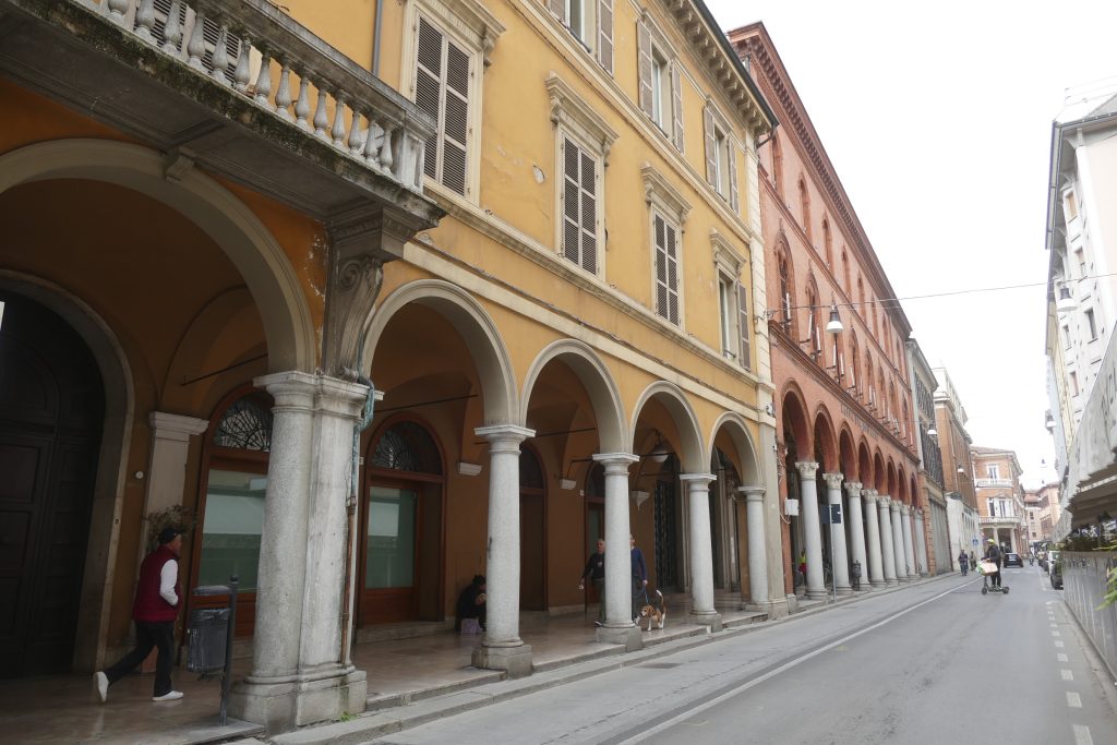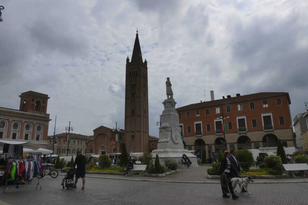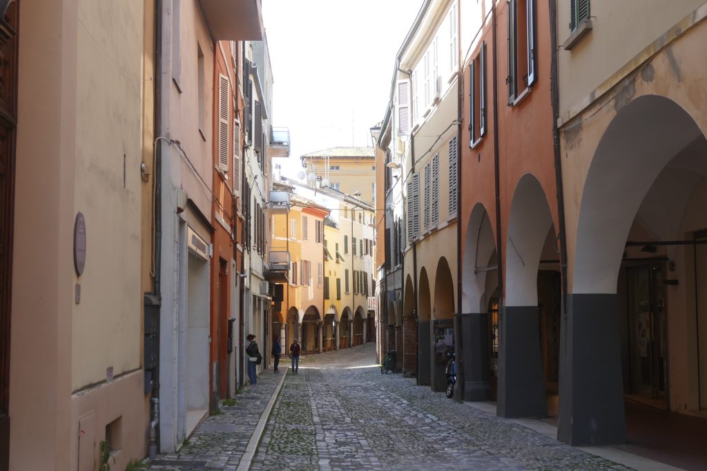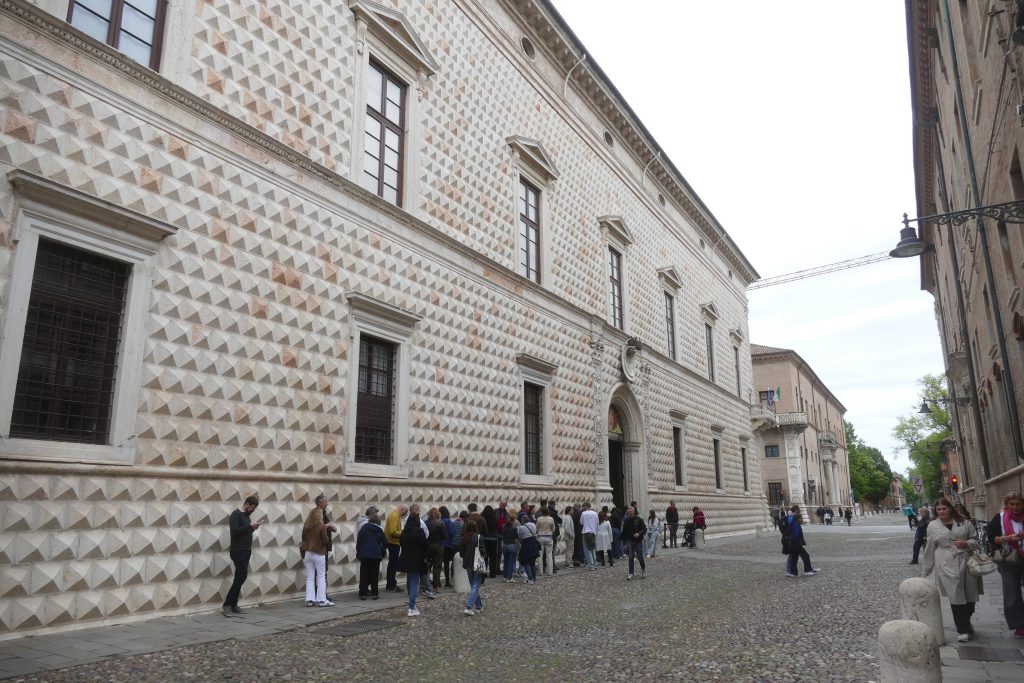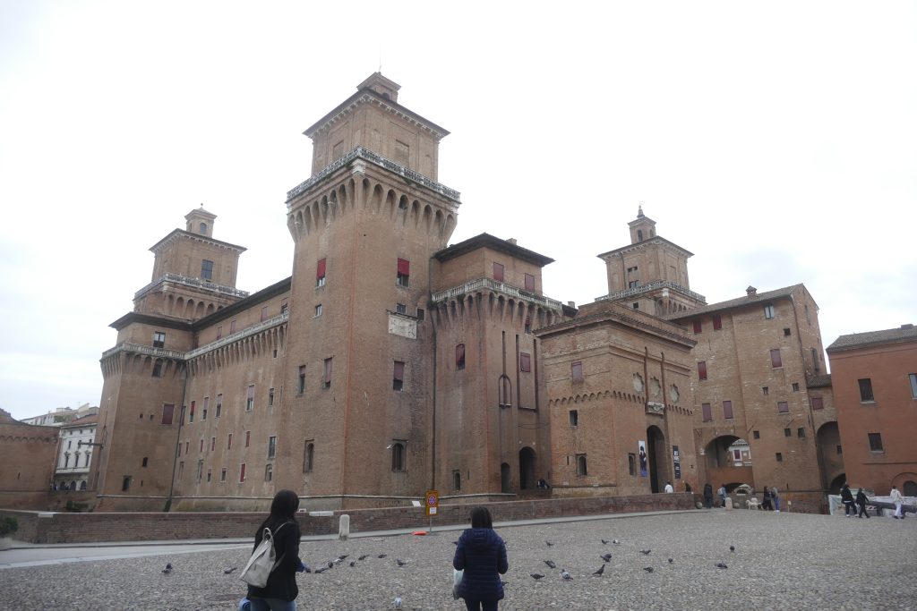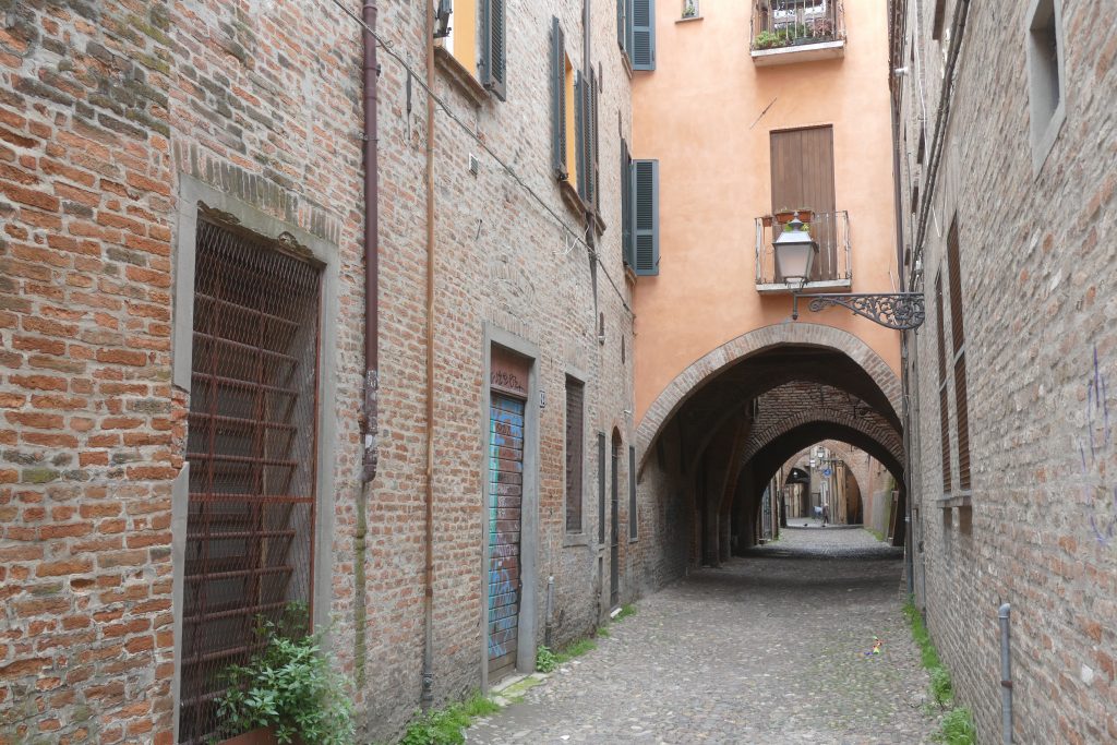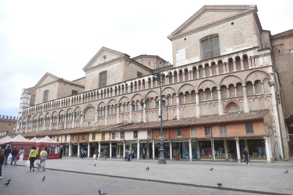 Auch heute ist kein Fahrradwetter, so fahren wir weiter nach Ferrara, mit einer wunderschön erhaltenen historischen Altstadt. Wir gehen zuerst zum Castello Estense, wo sich auch die Touristeninformation befindet. Die lange Schlange für die Besichtigung des Castellos schreckt uns ab. So steuern wir die Kathedrale an, die von außen restauriert wird, wodurch ihr großes Eingangsportal mit den Reliefs nicht zu sehen ist. An der Seite, die sich an der Piazza Trento Trieste befindet, ist die sogenannte Loggia dei Merciai, in der schon im Mittelalter einige Händler ihre Läden hatten. Über diesem sonderbaren Anbau sieht man zwei merkwürdige dekorative Bogenreihen, die auf fantasievoll bearbeiteten kleinen Säulen ruhen. Wir biegen in das jüdische Viertel ein, dessen Häuser durch schmiedeeiserne Balkone und spanischer Tradition gekennzeichnet sind. Eine enge mittelalterliche Gasse ist die Via delle Volte deren Hausreihen in regelmäßigen Abständen durch überbaute Bögen verbunden sind. Von der Kathedrale führt der Corso Ercole I d’Este mit Gebäuden der Renaissance zum prächtigen Palazzo dei Diamanti. Schon etwas außerhalb befindet sich das im 15. Jahrhundert erbaute Kloster Tempio die San Cristoforo alle Certosa, das seit dem 19. Jahrhundert als Friedhof dient. Bei der neun Kilometer langen Mauer, die fast ganz Ferrara umschließt, handelt es sich um einen der vollständigsten und interessantesten Mauerringe Italiens. Hinter einem breiten grünen Stadtgraben befindet sich eine langgestreckte rote Backsteinmauer, die hier und da von Toren und Turmruinen unterbrochen wird und die alle bedeutenden Perioden der italienischen Militärarchitektur aufweist.