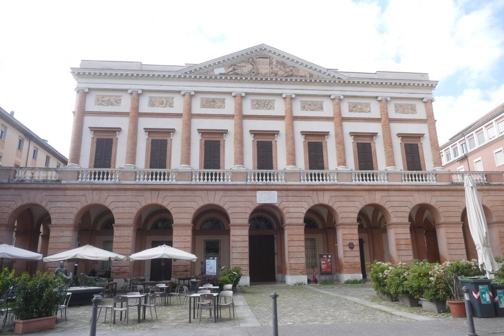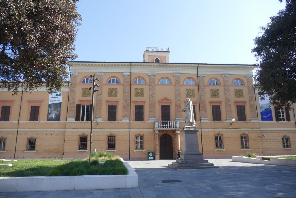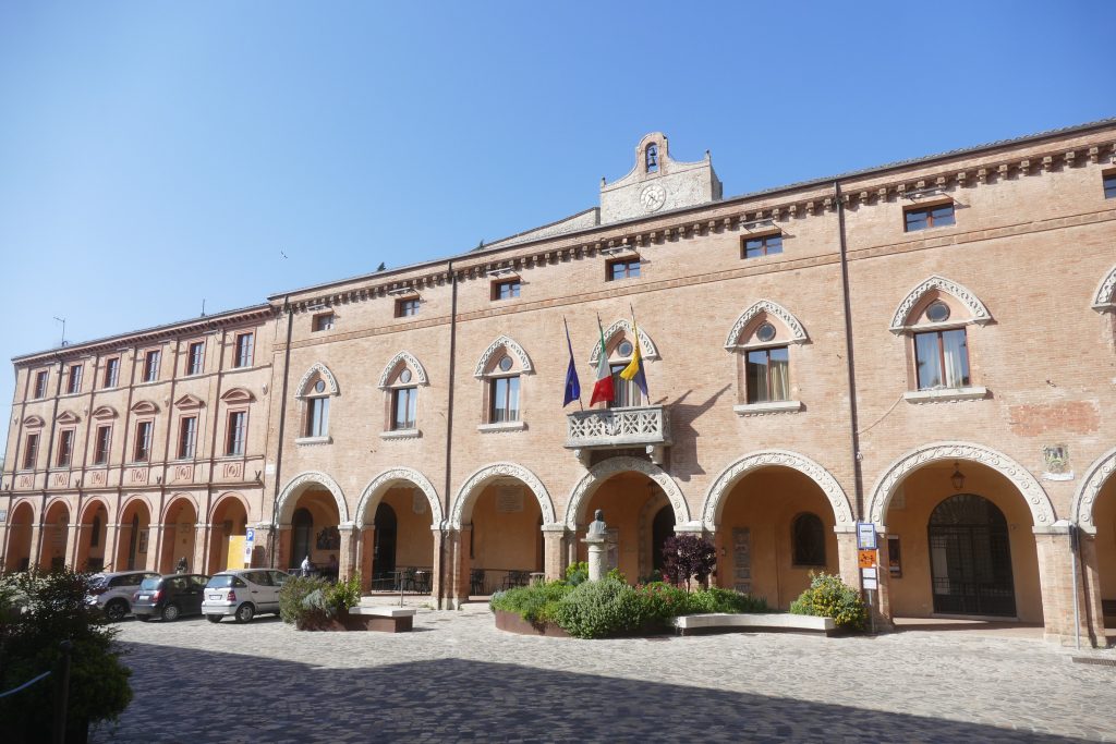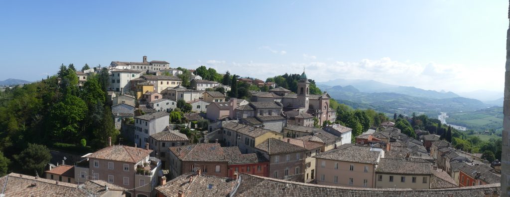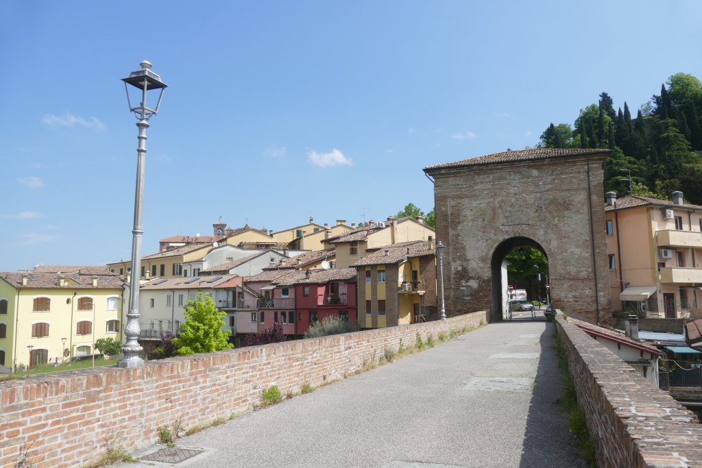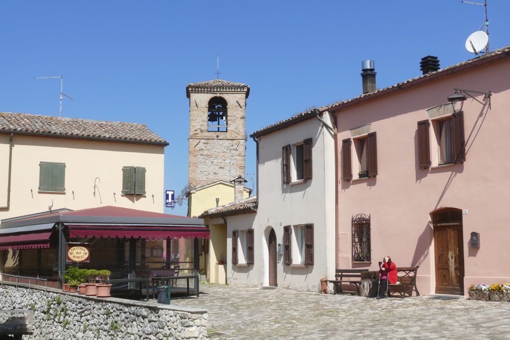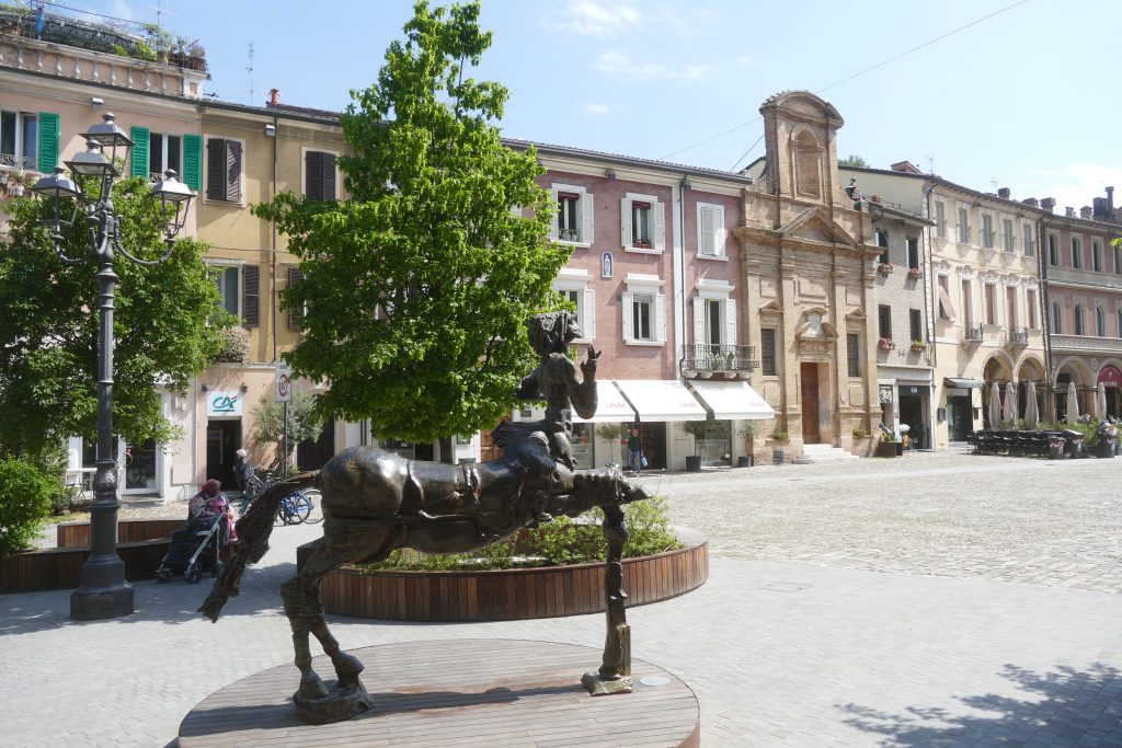 Cesena ist noch ein recht ursprüngliches, gemütliches Städtchen. Wir gehen ins Zentrum von Cesena zur Piazza del Popolo mit der Fontana Masini sowie der Loggia dei Mercanti, einst ein Treffpunkt für Händler und Kaufleute. Hier befindet sich auch das Touristenbüro. Etwas weiter hinten steht das moderne Kunstwerk des kleinen Zentaur, der zwar originell ist, jedoch „sein bestes Stück“ an einer etwas ungewöhnlichen Stelle zur Schau stellt. Dann gehen wir zum Palazzo del Ridotto, der von der Bronzestatue von Papst Pius VI. Braschi (einem der beiden aus Cesena stammenden Päpste) dominiert wird. Gegenüber in dem etwas unspektakulären Gebäude befindet sich die Biblioteca Malatestiana, eine der ältesten öffentlichen Bibliotheken Europas und UNESCO-Weltdokumentenerbe. Leider öffnet sie heute erst um 15 Uhr. Die Cattedrale di San Giovanni Battista ist ein weiteres Meisterwerk der romanischen Architektur mit ihrem hohen Turm. Wir kommen zum Alessandro Bonci Theater, eines der renommiertesten historischen Theater Italiens mit einer neoklassizistischen Fassade. Wieder zurück an der Piazza del Popolo erklimmen wir über eine Treppe die imposante Burg Rocca Malatestiana, die majestätisch auf dem kleinen Hügel über der Stadt thront. Sie ist ein Symbol für die Macht und den Einfluss der Malatesta-Familie aus dem 15. Jahrhundert. Wir umrunden die massiven Mauern und Türme, leider ist die Besichtigung der Terrassen und Innenräume nur mit Voranmeldung möglich. Zum Schluss gehen wir noch zur Chiesa di S. Domenico und schauen uns an der Ponte San Martino die Porta Fiume an. Dann fahren wir weiter nach Verucchio, einem Ort auf einem Hügel, 16 km von Rimini und 10 km von der Republik San Marino entfernt.