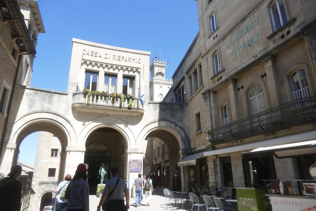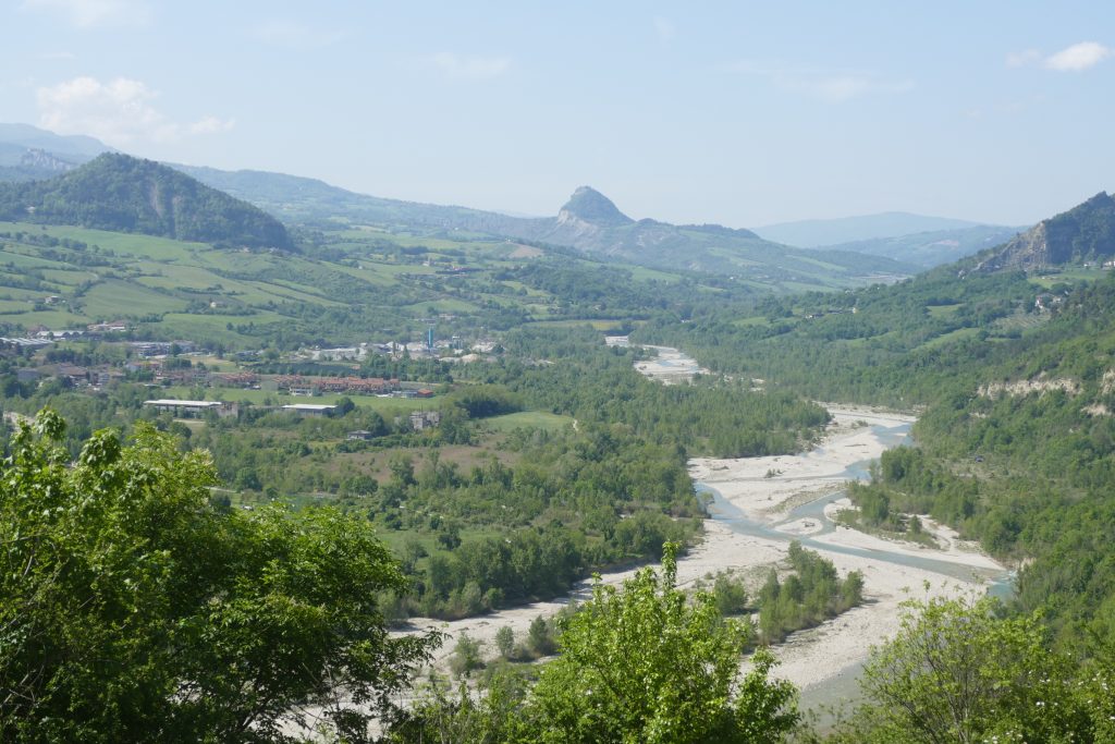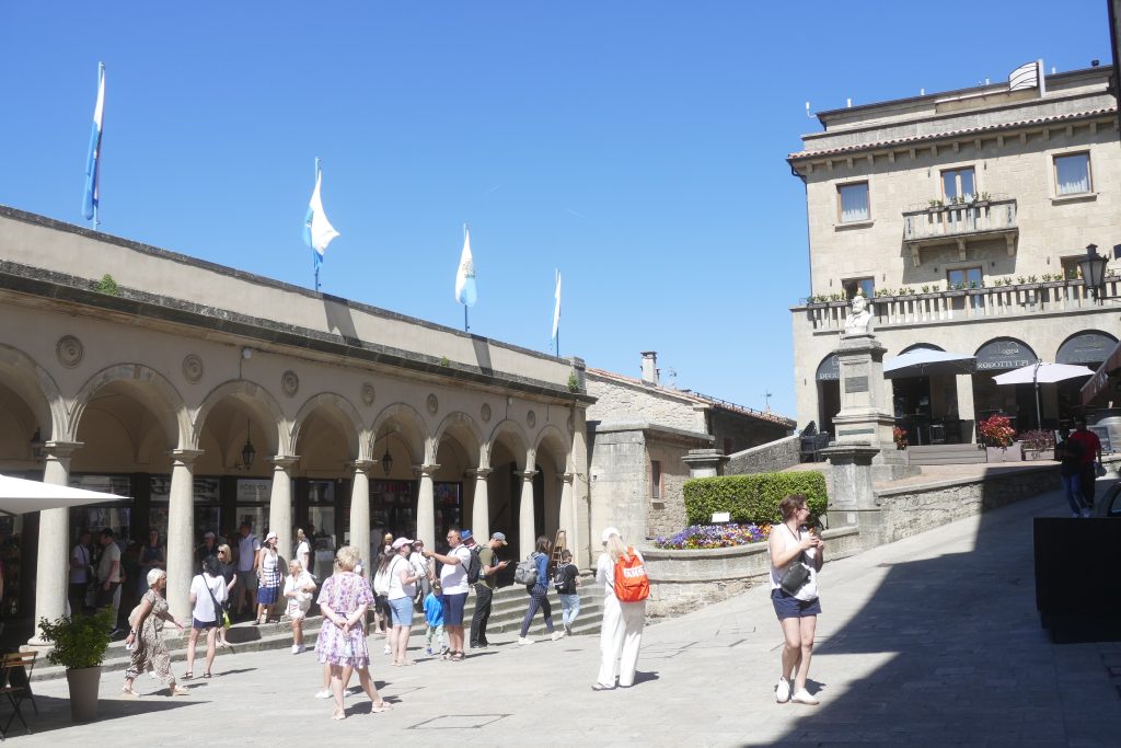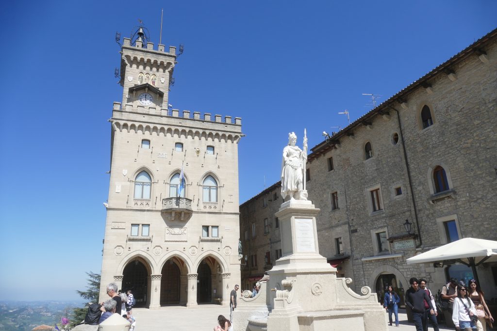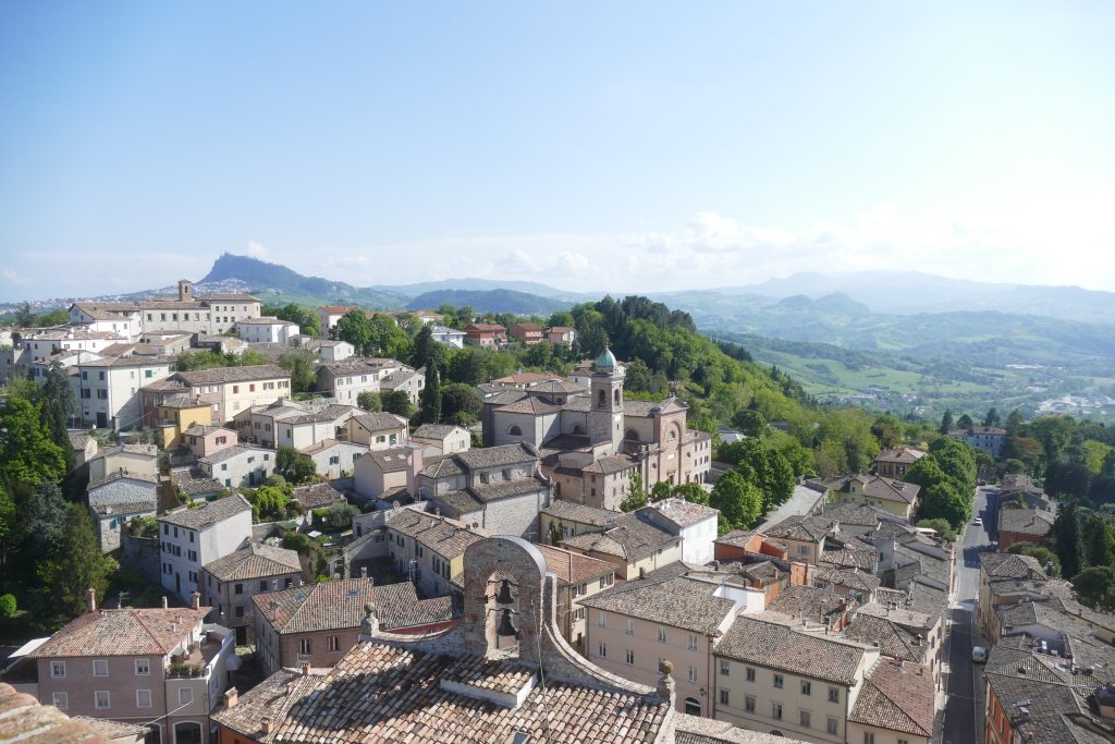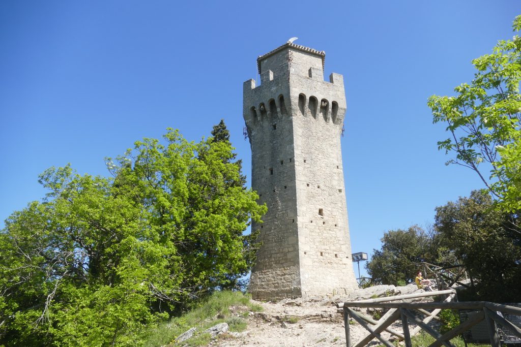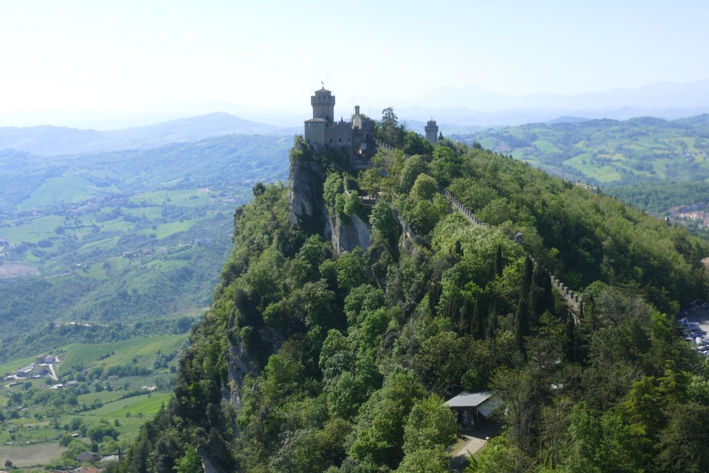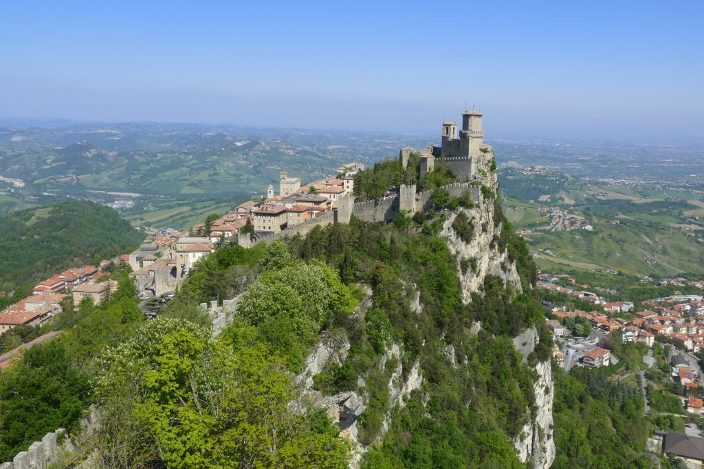 Wir fahren wieder hinunter nach Ponte Verucchio, um von hier die Wanderung Ponte Verucchio – Saiano – Montebello – Torriana – Ponte Verucchio zu unternehmen. Zuerst laufen wir entlang des Flusses Marecchia bis wir hoch oben auf einem Felsvorsprung auf 260 m Höhe das Heiligtum von Saiano erblicken in einer strategischen Position zwischen Montebello, Pietracuta, Verucchio und San Marino. Nun geht es auf einem breiten Schotterweg hinauf zum Castello di Montebello, auch Castello di Guidi di Bagno genannt. Es ist eine mittelalterliche Burg auf einem Hügel über Montebello di Torriana, deren Fundamente direkt auf dem Gipfel eines Berges liegen. Die Burg befindet sich an der früheren Hauptverbindung zum Montefeltro und zur Toskana. Auf einer kleinen Straße müssen wir jetzt ein Stück bergab, um dann wieder hinauf nach Poggio Torriana zu steigen, mit den Überresten der Malatesta-Burg und einem Turm. Von hier haben wir bei unserem Picknick einen herrlichen Panoramablick auf die Täler des Valmarecchia, Verucchio und San Marino. Im Anschluss fahren wir weiter nach San Marino. Die Republik San Marino gehört zu den kleinsten Staaten der Erde und ist gleichzeitig auch die älteste bestehende Republik der Welt.