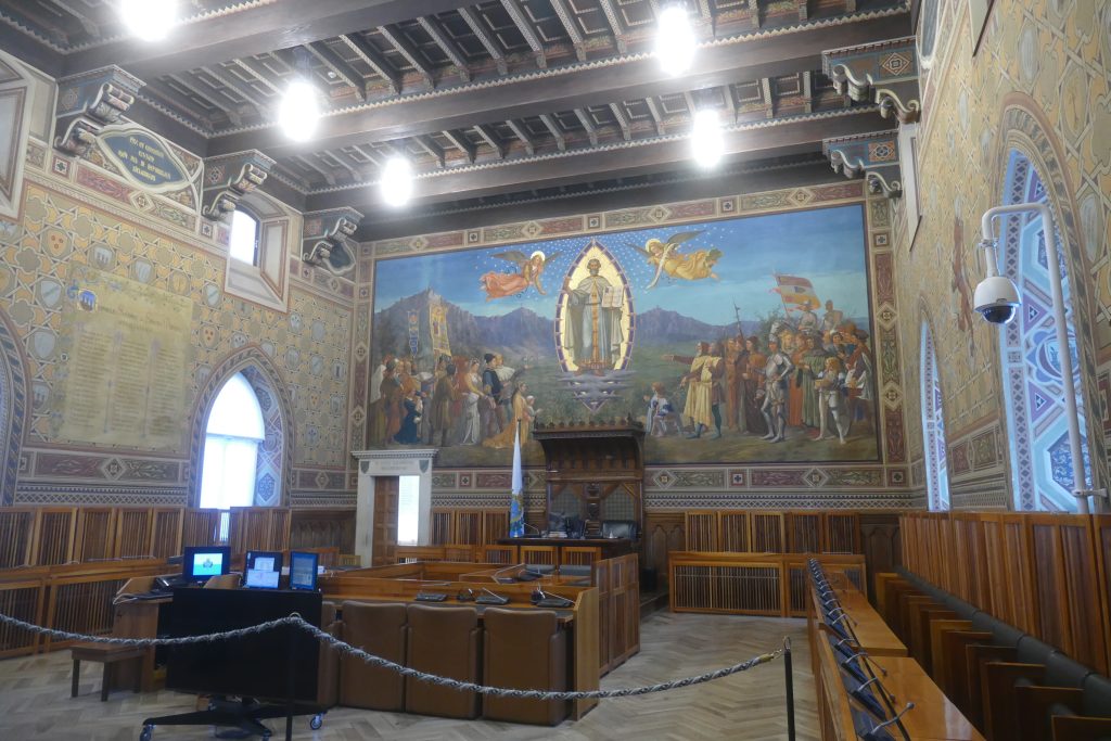 Von Borgo Maggiore am Fuße des Monte Titano steigen wir über die Costa dell`Arnella, einer gepflasterten Straße hinauf ins Zentrum von San Marino und gehen als Erstes zur Basilica del Santo Marino. Im Moment hat der Touristenansturm noch nicht die Stadt erreicht. Weiter gehen wir zum ersten der drei Türme auf dem Felskamm Monte Titano, dem Guaita oder Rocca, von dem sich ein beeindruckender Panoramablick in alle vier Himmelsrichtungen bietet. Danach nehmen wir den Hexenpfad zur Festung Cesta, in der Waffen ausgestellt sind. Schließlich laufen wir noch zum dritten der drei Türme, dem Montale. Danach steigen wir hinab zum alten Eisenbahntunnel bei Borgo Maggiore. Nun müssen wir wieder hinauf auf den Felsen zur Piazza Garibaldi und zur Piazza Titano. Der Palazzo Pubblico ist nicht nur Rathaus, sondern auch Sitz des „Consiglio Grande e Generale“ und beherbergt das Parlament sowie die Regierung. Er befindet sich auf der Piazza della Libertà mit der Freiheitsstatue. Im Anschluss fahren wir weiter in das nahe gelegene San Leo, das wegen seiner außergewöhnlichen Attraktivität bereits häufiger als Filmkulisse diente und als schönstes Dorf des Landes gekürt wurde.