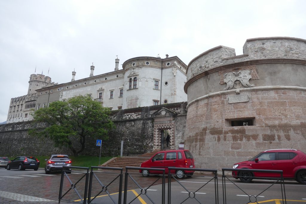 Schon um 5 Uhr stehen wir heute auf, um über den Brenner nach Italien zu fahren. Wie erwartet ist es auf der Strecke durch Österreich und den Brenner zäh fließend. Aber was macht das schon, es regnet sowieso. Als wir in Italien ankommen, strahlt die Sonne. Erster Anlaufpunkt ist Mezzolombardo, wo wir zum Skywalk wollen. Eine sehr steile und enge Straße geht es hinauf – wir haben den falschen Stellplatz ins Navi eingegeben. Am Friedhof angekommen fällt uns ein, dass es bei der Abfahrt eine Höhenbeschränkung auf 2 m gibt. Achim rennt hinunter – eng und überhängende Balkone. Könnte zu schaffen sein. Also wieder hinunter zum Parkplatz am Sportgeschäft. Zu kurze Parkplätze. Nach einer Pause beschließen wir nach Pergine Valsugana (Fersen im Suganertal) einer lebhaften Stadt am Tor zum berühmten Fersentals zu fahren. Am Nachmittag sehen wir uns den kleinen Ort an, über dem die Schlossanlage Castel Pergine thront.