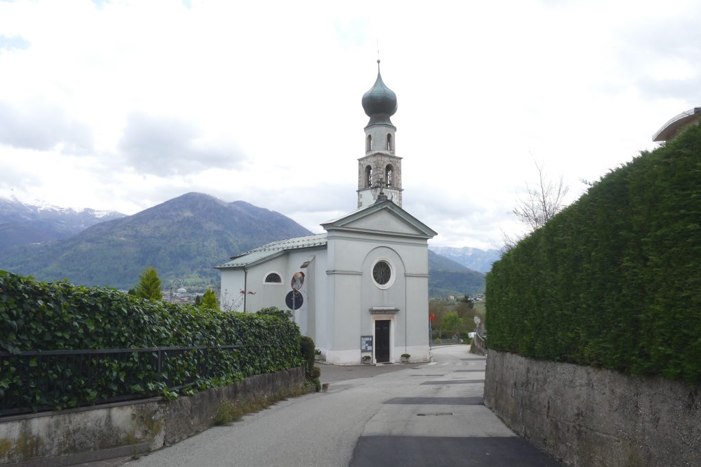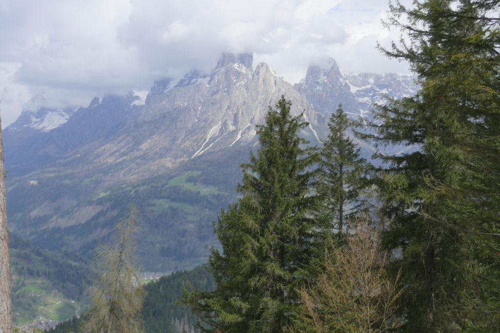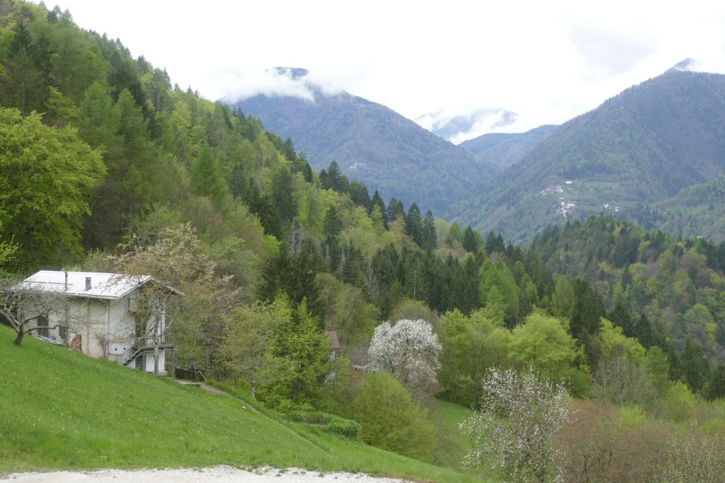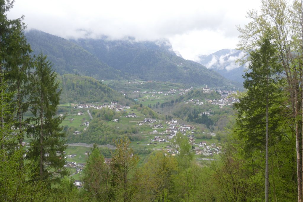 Heute begeben wir uns auf die Wanderung zwischen Cimirlo und Pergine. Eine steile Straße führt uns bis Susa durch blühende Obstplantagen und immer weiter hinauf auf einem Waldweg zum Spiaz dei Quettro Soldi, unserem höchsten Punkt auf 990 m Höhe. Von hier aus folgen wir dem Wanderschild nach Malga Tomba immer weiter bergab an einer Hütte vorbei zur kleinen Kapelle. Weiter auf dem Waldweg, der nun steil bergab führt, gehen wir zum Passo del Cimirlo auf 730 m Höhe. Danach wechselt der Weg zum Teil in eine Asphaltstraße, eine grob gepflasterte Straße und einen Schotterweg bis wir über den Ort Roncogno wieder Pergine Valsugana erreichen.