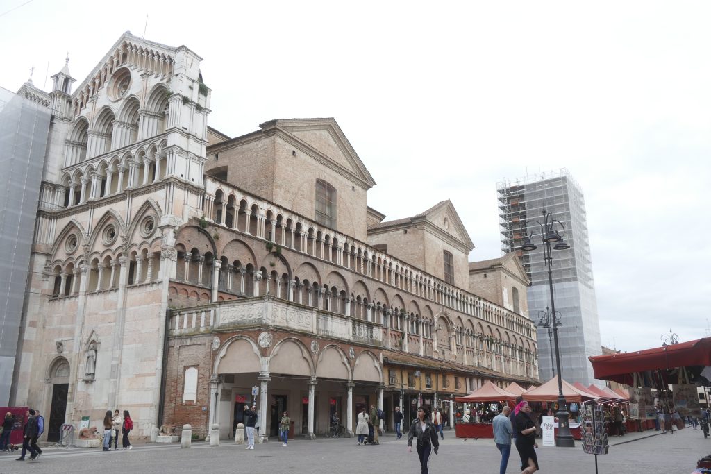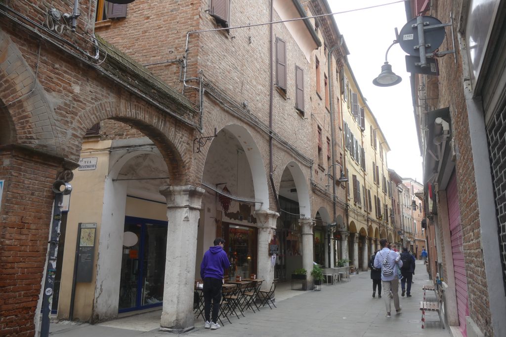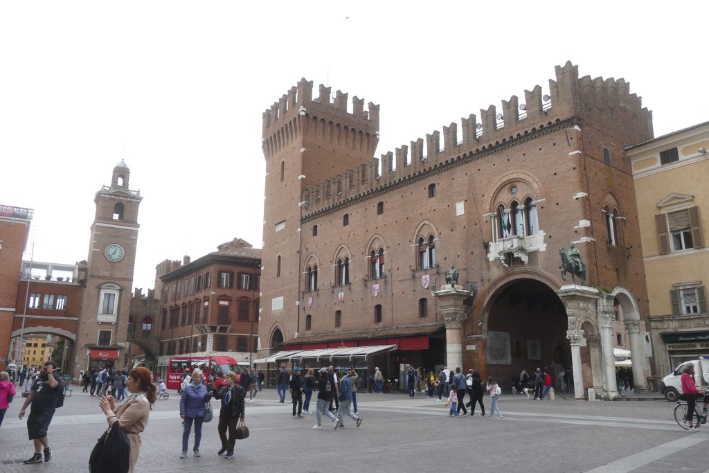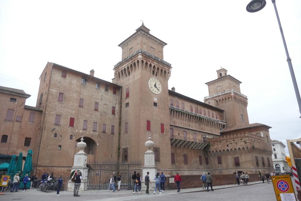 Auch heute ist kein Fahrradwetter, so fahren wir weiter nach Ferrara, mit einer wunderschön erhaltenen historischen Altstadt. Wir gehen zuerst zum Castello Estense, wo sich auch die Touristeninformation befindet. Die lange Schlange für die Besichtigung des Castellos schreckt uns ab. So steuern wir die Kathedrale an, die von außen restauriert wird, wodurch ihr großes Eingangsportal mit den Reliefs nicht zu sehen ist. An der Seite, die sich an der Piazza Trento Trieste befindet, ist die sogenannte Loggia dei Merciai, in der schon im Mittelalter einige Händler ihre Läden hatten. Über diesem sonderbaren Anbau sieht man zwei merkwürdige dekorative Bogenreihen, die auf fantasievoll bearbeiteten kleinen Säulen ruhen. Wir biegen in das jüdische Viertel ein, dessen Häuser durch schmiedeeiserne Balkone und spanischer Tradition gekennzeichnet sind. Eine enge mittelalterliche Gasse ist die Via delle Volte deren Hausreihen in regelmäßigen Abständen durch überbaute Bögen verbunden sind. Von der Kathedrale führt der Corso Ercole I d’Este mit Gebäuden der Renaissance zum prächtigen Palazzo dei Diamanti. Schon etwas außerhalb befindet sich das im 15. Jahrhundert erbaute Kloster Tempio die San Cristoforo alle Certosa, das seit dem 19. Jahrhundert als Friedhof dient. Bei der neun Kilometer langen Mauer, die fast ganz Ferrara umschließt, handelt es sich um einen der vollständigsten und interessantesten Mauerringe Italiens. Hinter einem breiten grünen Stadtgraben befindet sich eine langgestreckte rote Backsteinmauer, die hier und da von Toren und Turmruinen unterbrochen wird und die alle bedeutenden Perioden der italienischen Militärarchitektur aufweist.