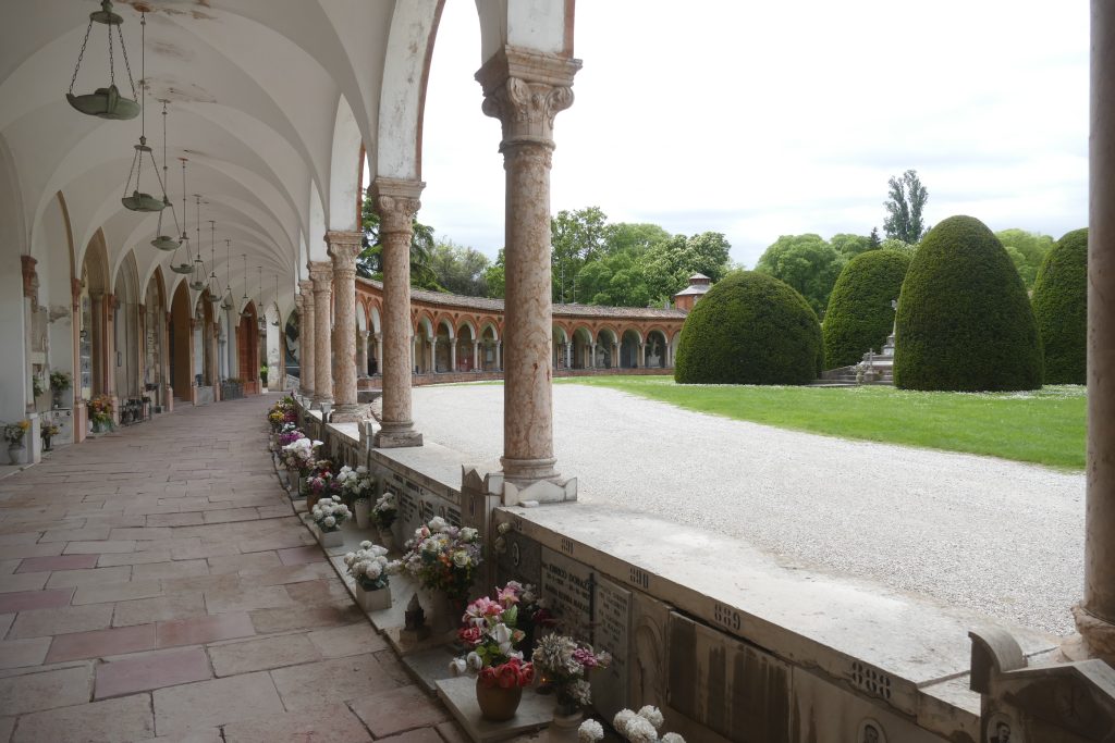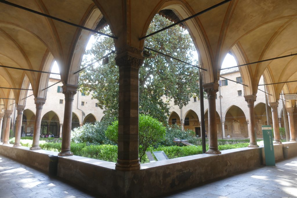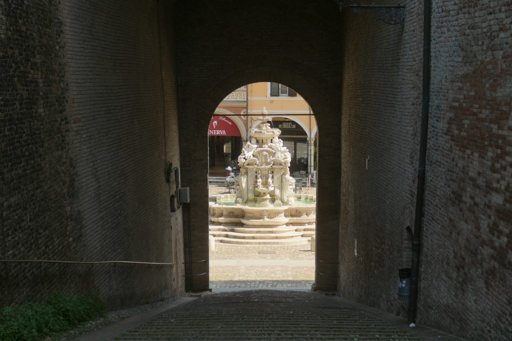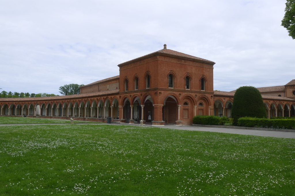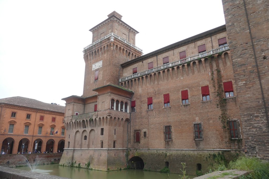 Auch heute ist kein Fahrradwetter, so fahren wir weiter nach Ferrara, mit einer wunderschön erhaltenen historischen Altstadt. Wir gehen zuerst zum Castello Estense, wo sich auch die Touristeninformation befindet. Die lange Schlange für die Besichtigung des Castellos schreckt uns ab. So steuern wir die Kathedrale an, die von außen restauriert wird, wodurch ihr großes Eingangsportal mit den Reliefs nicht zu sehen ist. An der Seite, die sich an der Piazza Trento Trieste befindet, ist die sogenannte Loggia dei Merciai, in der schon im Mittelalter einige Händler ihre Läden hatten. Über diesem sonderbaren Anbau sieht man zwei merkwürdige dekorative Bogenreihen, die auf fantasievoll bearbeiteten kleinen Säulen ruhen. Wir biegen in das jüdische Viertel ein, dessen Häuser durch schmiedeeiserne Balkone und spanischer Tradition gekennzeichnet sind. Eine enge mittelalterliche Gasse ist die Via delle Volte deren Hausreihen in regelmäßigen Abständen durch überbaute Bögen verbunden sind. Von der Kathedrale führt der Corso Ercole I d’Este mit Gebäuden der Renaissance zum prächtigen Palazzo dei Diamanti. Schon etwas außerhalb befindet sich das im 15. Jahrhundert erbaute Kloster Tempio die San Cristoforo alle Certosa, das seit dem 19. Jahrhundert als Friedhof dient. Bei der neun Kilometer langen Mauer, die fast ganz Ferrara umschließt, handelt es sich um einen der vollständigsten und interessantesten Mauerringe Italiens. Hinter einem breiten grünen Stadtgraben befindet sich eine langgestreckte rote Backsteinmauer, die hier und da von Toren und Turmruinen unterbrochen wird und die alle bedeutenden Perioden der italienischen Militärarchitektur aufweist.