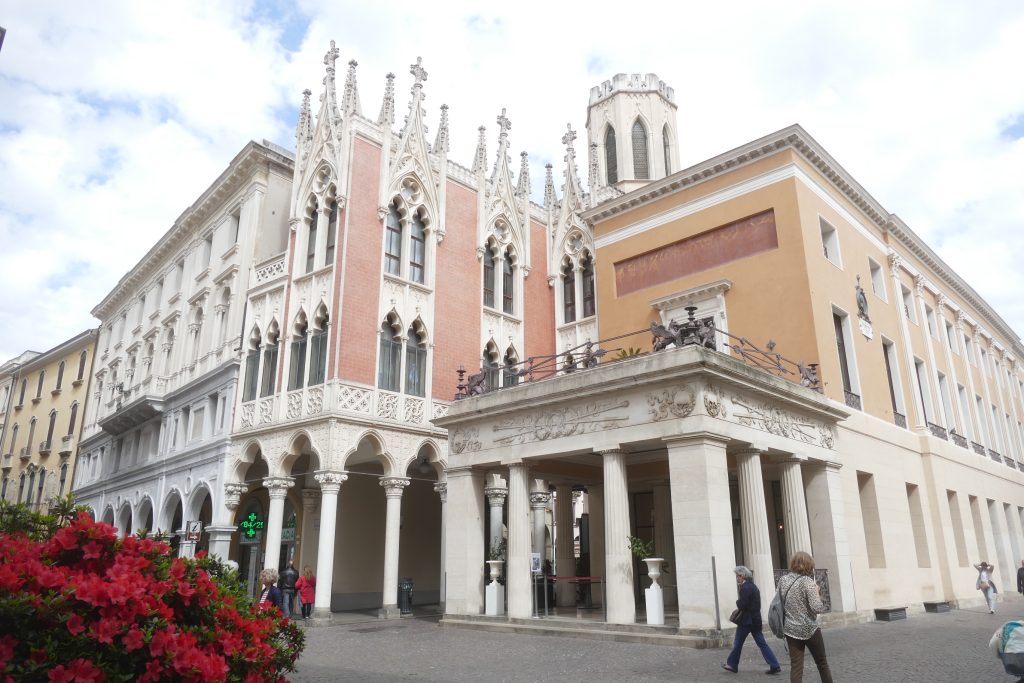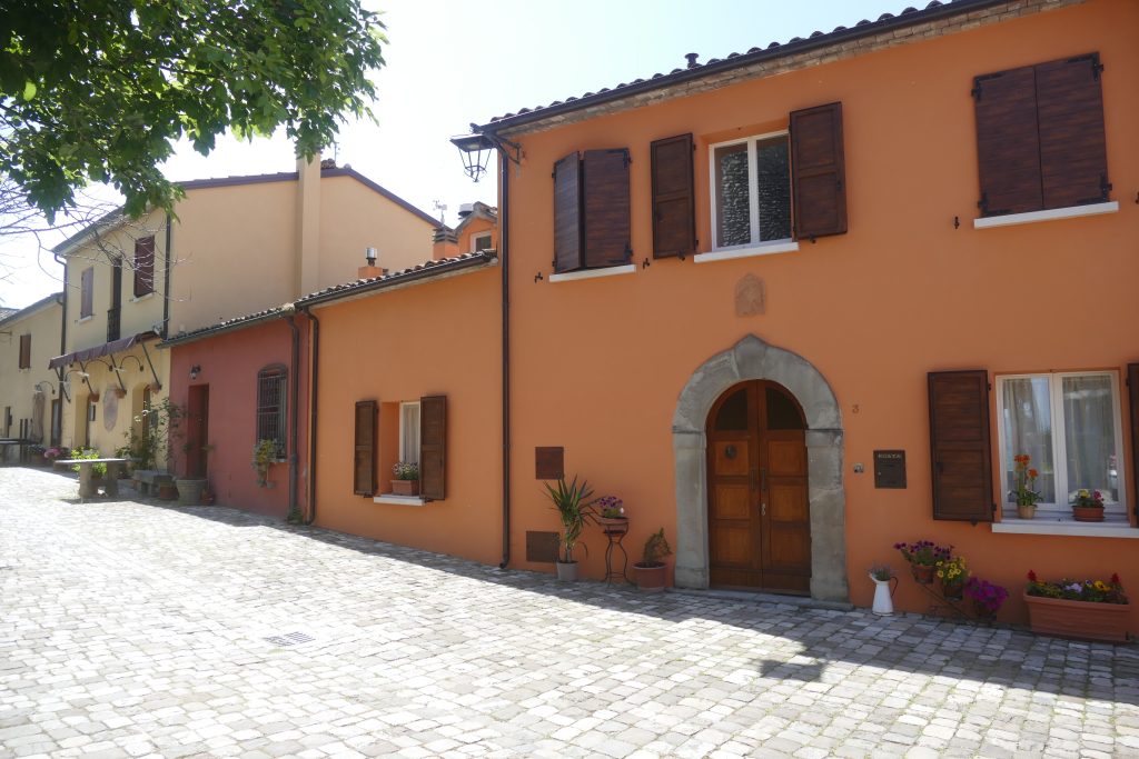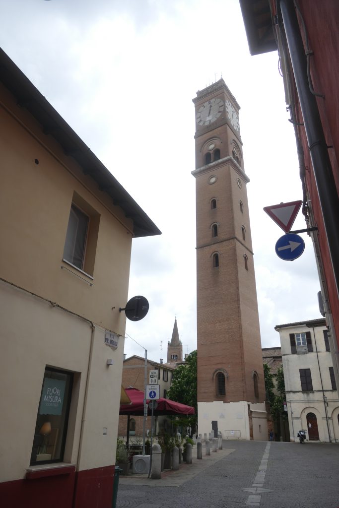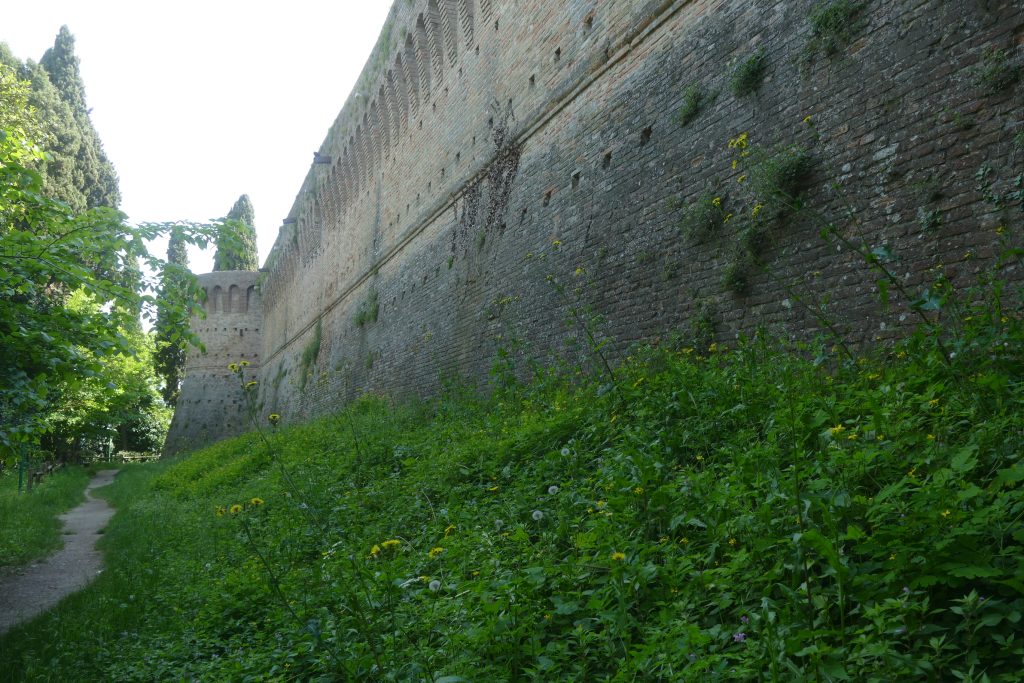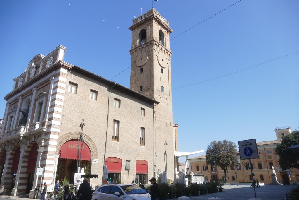 Cesena ist noch ein recht ursprüngliches, gemütliches Städtchen. Wir gehen ins Zentrum von Cesena zur Piazza del Popolo mit der Fontana Masini sowie der Loggia dei Mercanti, einst ein Treffpunkt für Händler und Kaufleute. Hier befindet sich auch das Touristenbüro. Etwas weiter hinten steht das moderne Kunstwerk des kleinen Zentaur, der zwar originell ist, jedoch „sein bestes Stück“ an einer etwas ungewöhnlichen Stelle zur Schau stellt. Dann gehen wir zum Palazzo del Ridotto, der von der Bronzestatue von Papst Pius VI. Braschi (einem der beiden aus Cesena stammenden Päpste) dominiert wird. Gegenüber in dem etwas unspektakulären Gebäude befindet sich die Biblioteca Malatestiana, eine der ältesten öffentlichen Bibliotheken Europas und UNESCO-Weltdokumentenerbe. Leider öffnet sie heute erst um 15 Uhr. Die Cattedrale di San Giovanni Battista ist ein weiteres Meisterwerk der romanischen Architektur mit ihrem hohen Turm. Wir kommen zum Alessandro Bonci Theater, eines der renommiertesten historischen Theater Italiens mit einer neoklassizistischen Fassade. Wieder zurück an der Piazza del Popolo erklimmen wir über eine Treppe die imposante Burg Rocca Malatestiana, die majestätisch auf dem kleinen Hügel über der Stadt thront. Sie ist ein Symbol für die Macht und den Einfluss der Malatesta-Familie aus dem 15. Jahrhundert. Wir umrunden die massiven Mauern und Türme, leider ist die Besichtigung der Terrassen und Innenräume nur mit Voranmeldung möglich. Zum Schluss gehen wir noch zur Chiesa di S. Domenico und schauen uns an der Ponte San Martino die Porta Fiume an. Dann fahren wir weiter nach Verucchio, einem Ort auf einem Hügel, 16 km von Rimini und 10 km von der Republik San Marino entfernt.