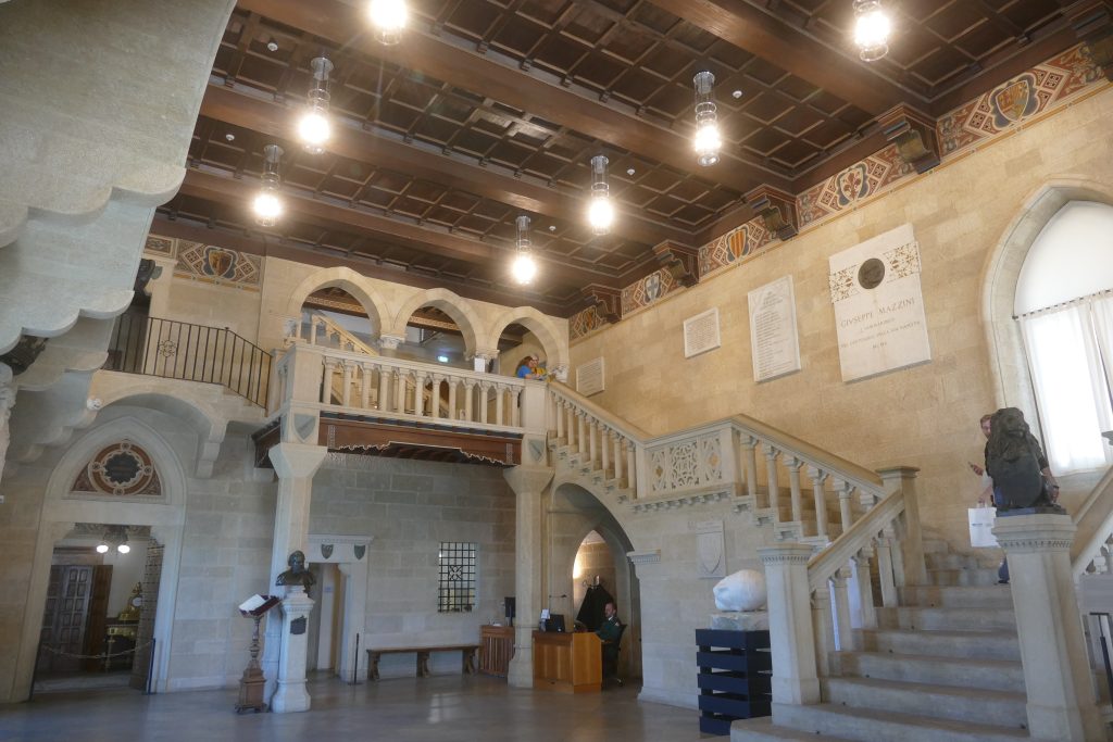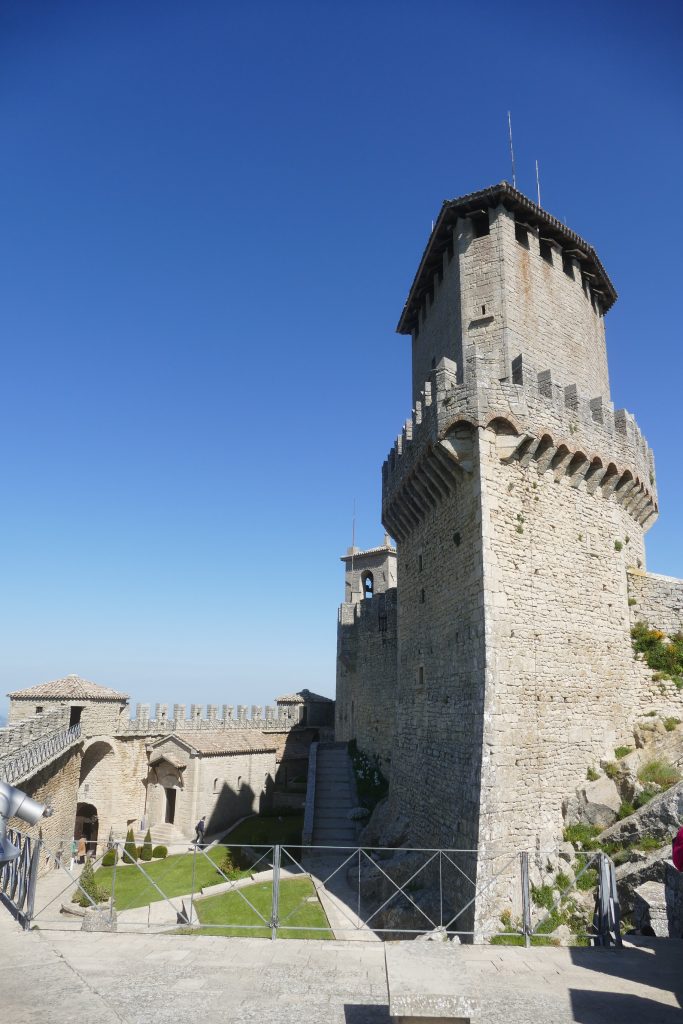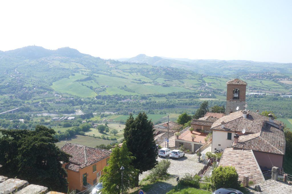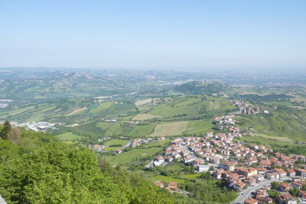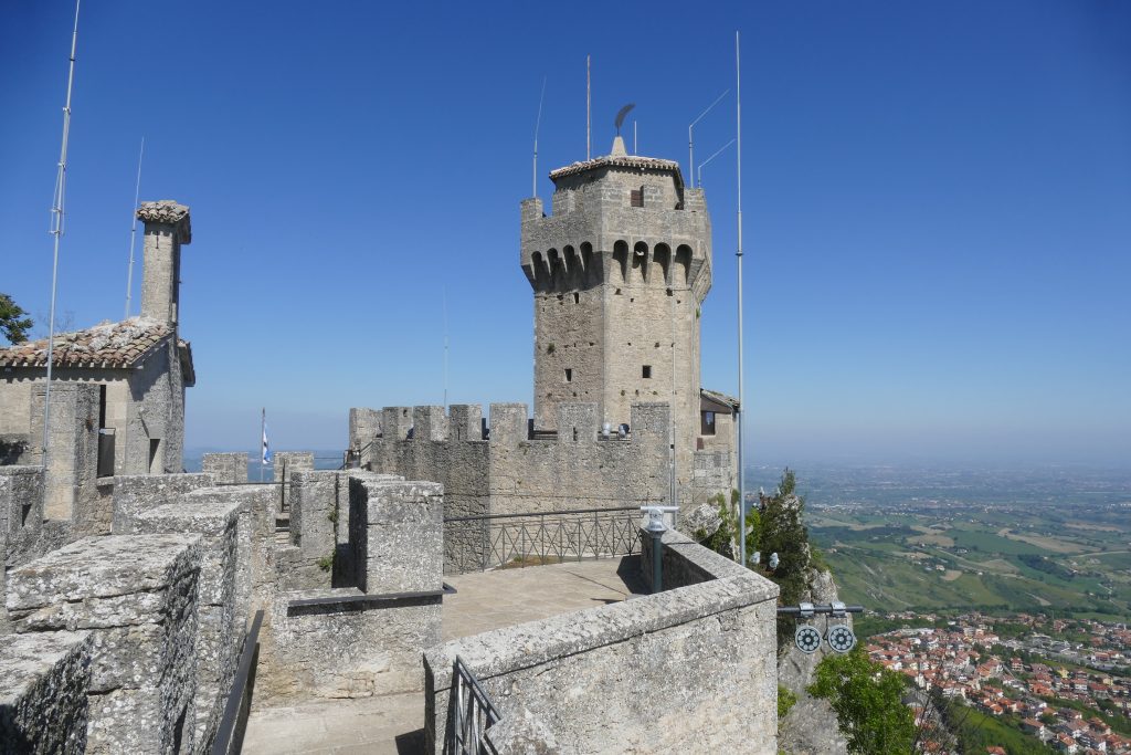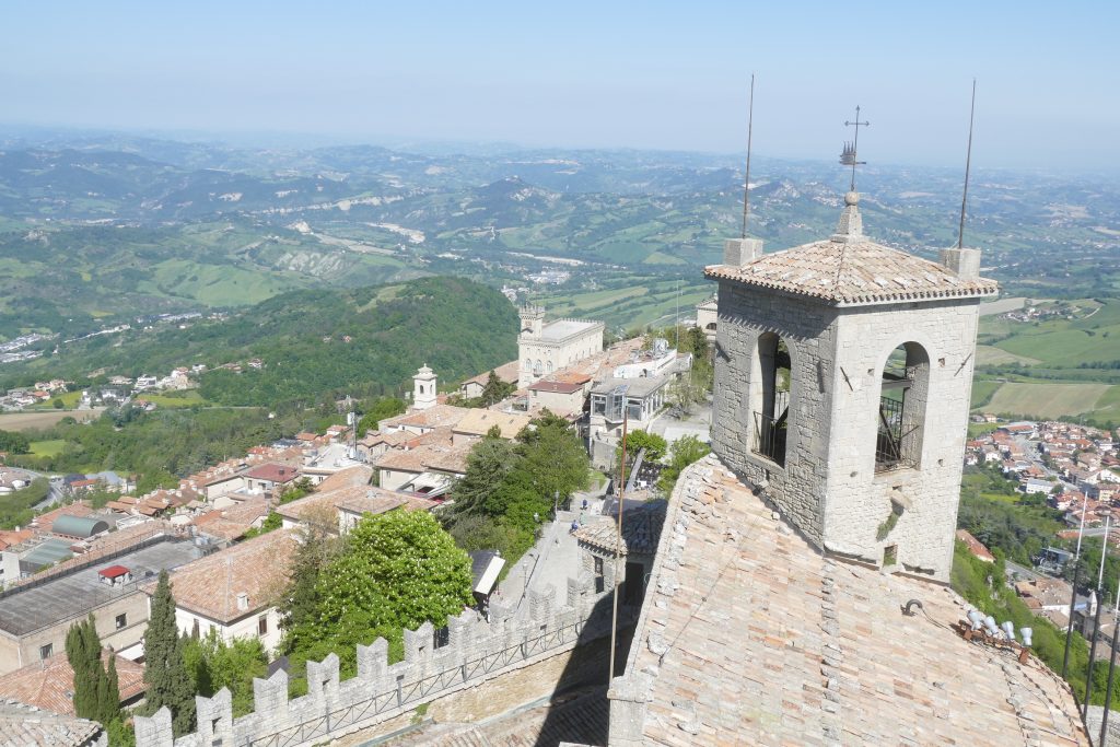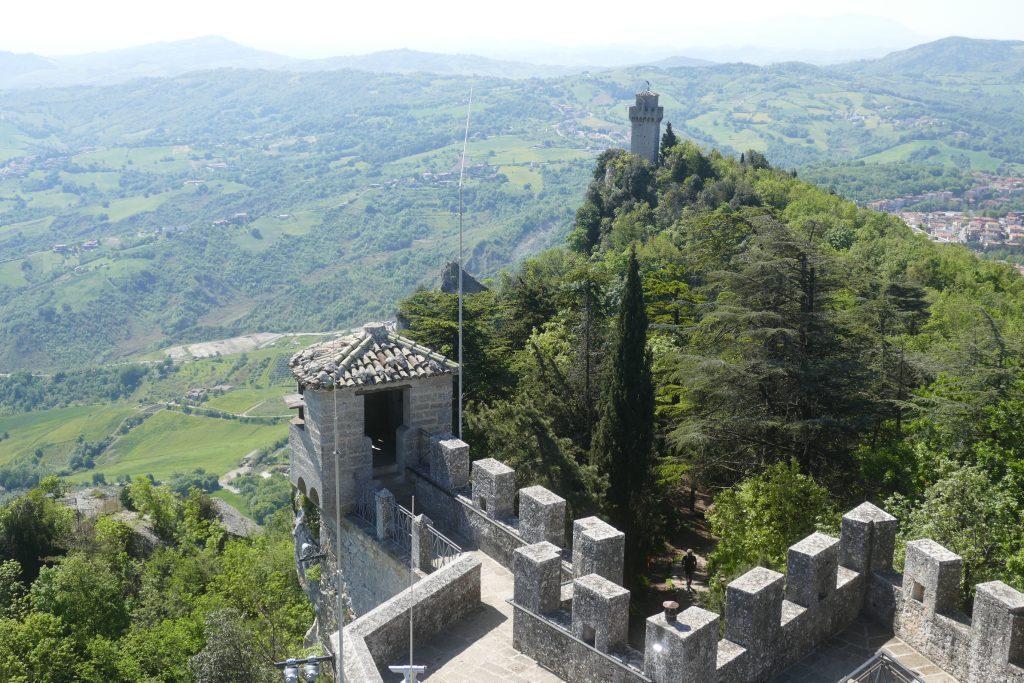 Wir fahren wieder hinunter nach Ponte Verucchio, um von hier die Wanderung Ponte Verucchio – Saiano – Montebello – Torriana – Ponte Verucchio zu unternehmen. Zuerst laufen wir entlang des Flusses Marecchia bis wir hoch oben auf einem Felsvorsprung auf 260 m Höhe das Heiligtum von Saiano erblicken in einer strategischen Position zwischen Montebello, Pietracuta, Verucchio und San Marino. Nun geht es auf einem breiten Schotterweg hinauf zum Castello di Montebello, auch Castello di Guidi di Bagno genannt. Es ist eine mittelalterliche Burg auf einem Hügel über Montebello di Torriana, deren Fundamente direkt auf dem Gipfel eines Berges liegen. Die Burg befindet sich an der früheren Hauptverbindung zum Montefeltro und zur Toskana. Auf einer kleinen Straße müssen wir jetzt ein Stück bergab, um dann wieder hinauf nach Poggio Torriana zu steigen, mit den Überresten der Malatesta-Burg und einem Turm. Von hier haben wir bei unserem Picknick einen herrlichen Panoramablick auf die Täler des Valmarecchia, Verucchio und San Marino. Im Anschluss fahren wir weiter nach San Marino. Die Republik San Marino gehört zu den kleinsten Staaten der Erde und ist gleichzeitig auch die älteste bestehende Republik der Welt.