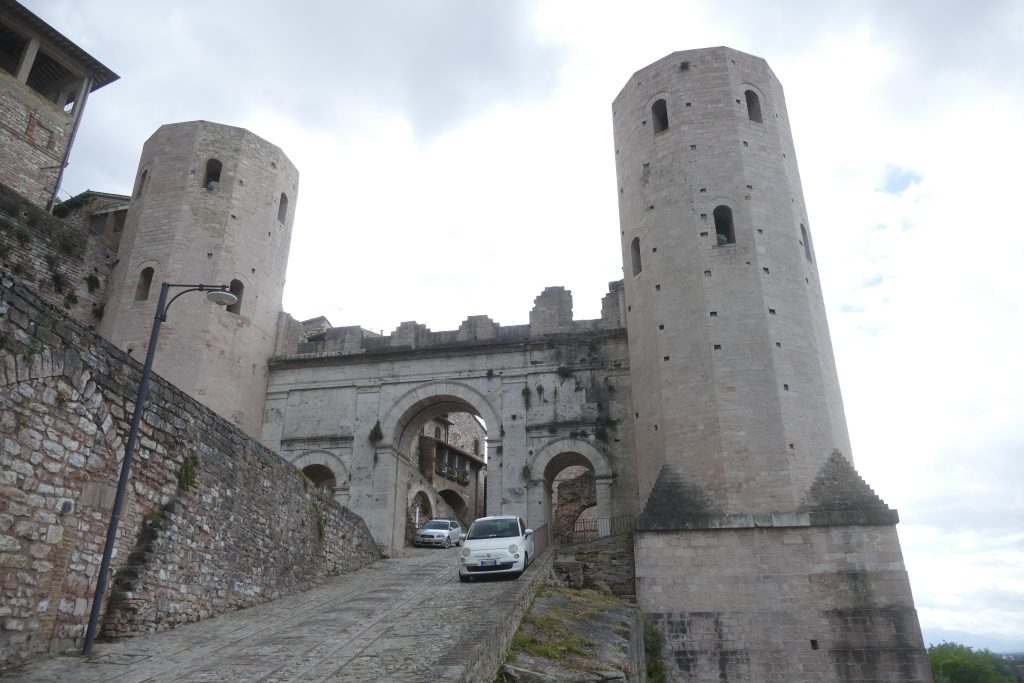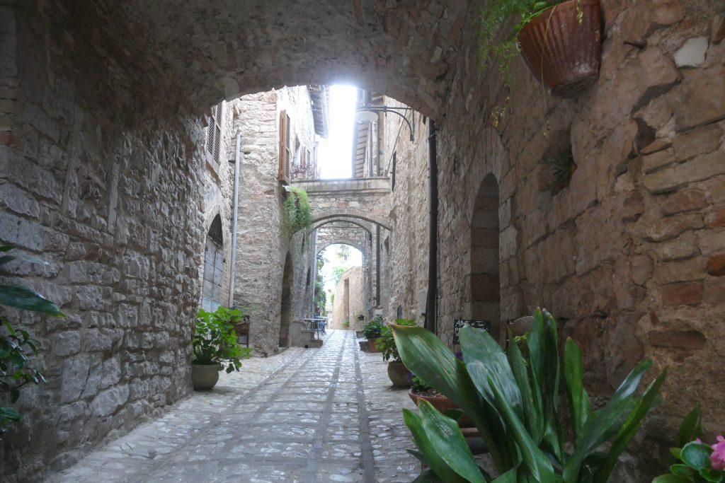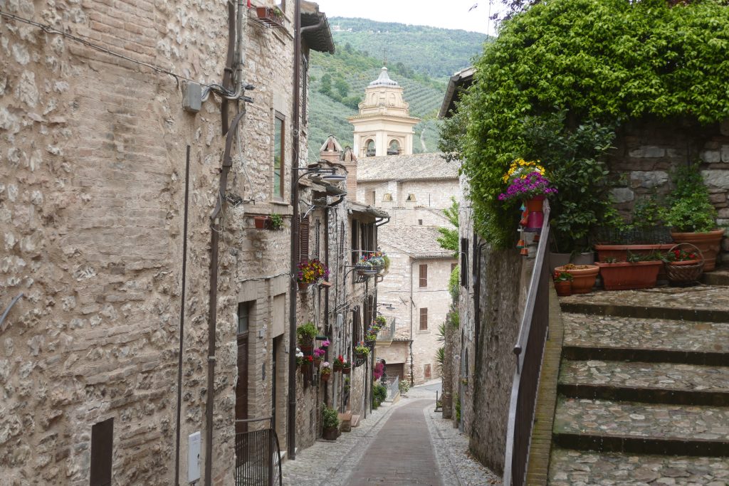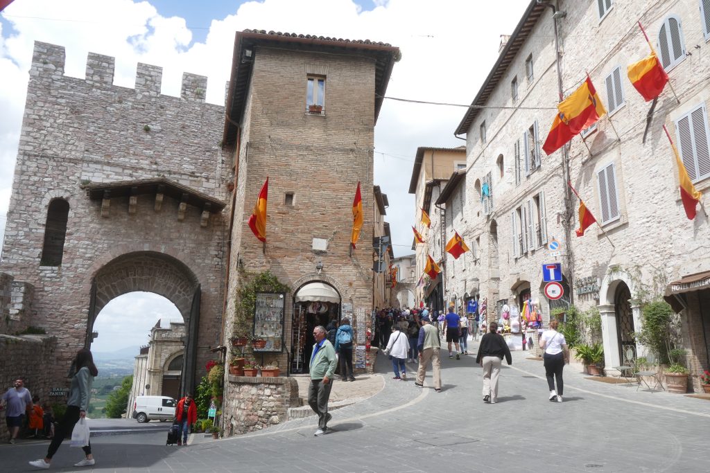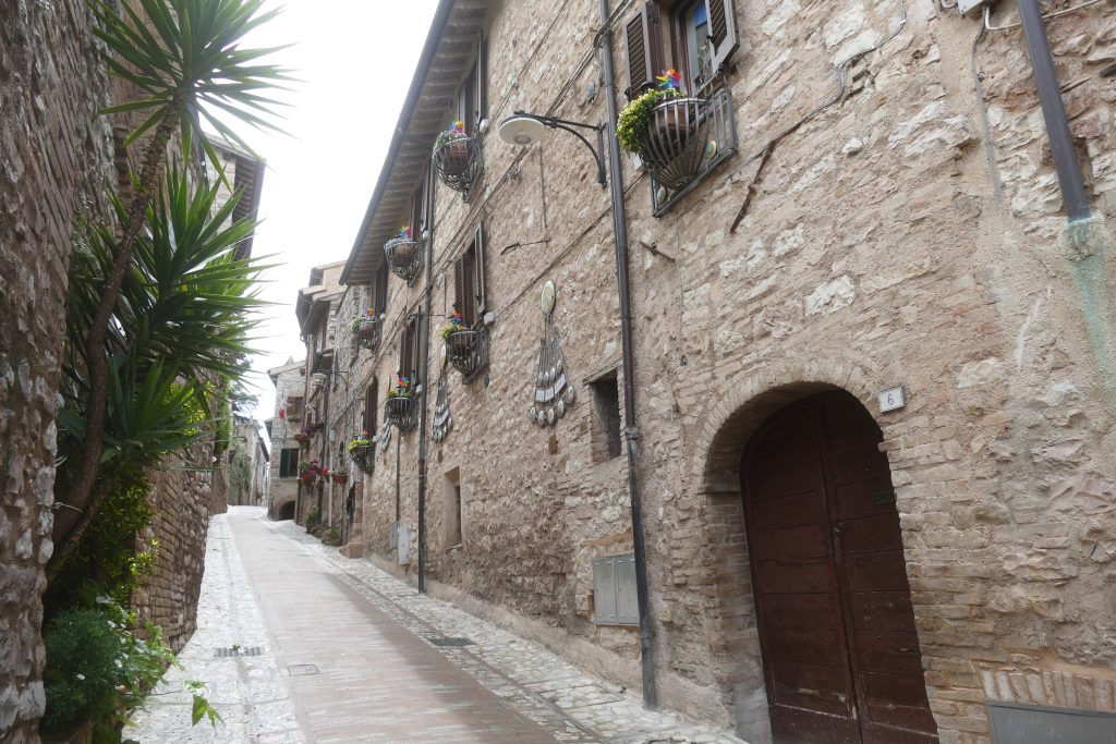 Gestern haben uns Italiener noch den Hinweis auf das ca. 15 km von Asissi entfernte Spello gegeben. Der Ort liegt auf den Ausläufern des Berges Monte Subasio und reicht vom Gipfel bis zur Ebene. Wir betreten die Altstadt durch das Haupttor, der Porta Consolare mit drei Bögen und drei Statuen aus der Zeit von Augustus. Auf dem mittelalterlichen Turm daneben steht ein uralter Olivenbaum, ein Symbol des Friedens und des typischsten lokalen Produkts. Dann kommen wir zum Vorplatz der Kirche Santa Maria Maggiore, der Hauptkirche der Stadt. Ein Stück weiter oben ist die romanische Kirche Sant’Andrea, mit Fresken der umbrischen Schule aus dem 14. und dem 15. Jahrhundert. An der Piazza della Repubblica befindet sich das Rathaus. Gegenüber in der Via Garibald ist der Palazzo Urbani-Acuti mit einer hölzernen Loggiato. Das Stadttor Porta Venere, das schönste und majestätischste Tor, stammt aus der Römerzeit, und befindet sich am Ende der alten Stadtmauer. Spello ist berühmt für sein Blumenfestival, das jedes Jahr am Wochenende nach Fronleichnam stattfindet. Doch auch jetzt sind die Gassen mit Blumen geschmückt, durch die wir schlendern. Ein Anstieg durch die Via Cappuccini bringt uns zum höchsten Teil von Spello, mit dem Belvedere, von dem wir in der Ferne, trotz des Regenwetters Assisi sehen können.