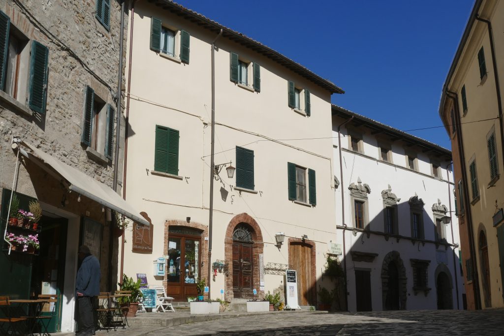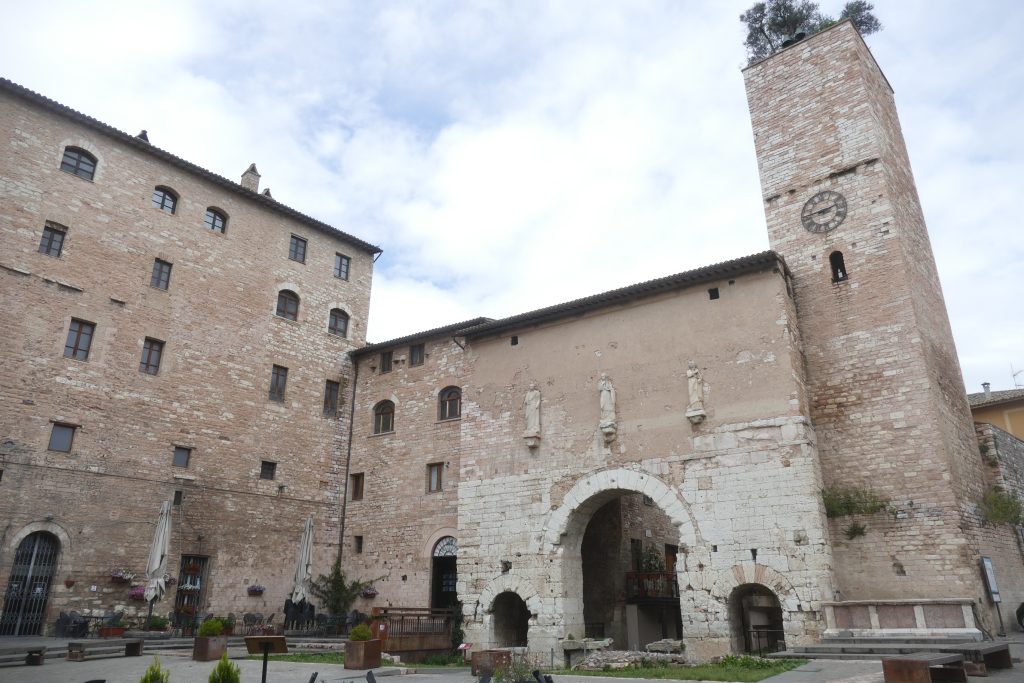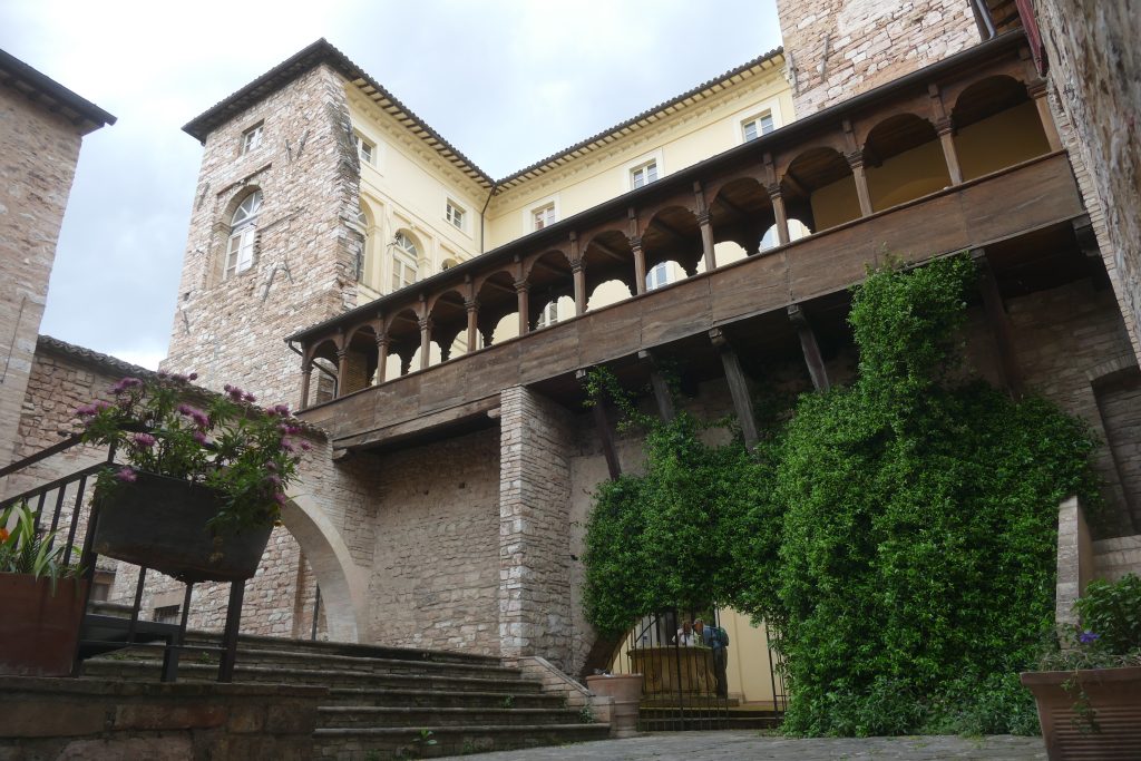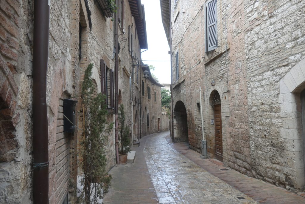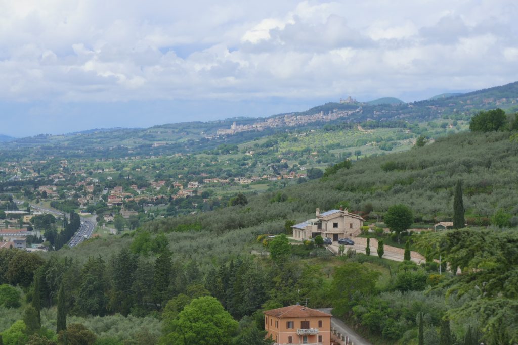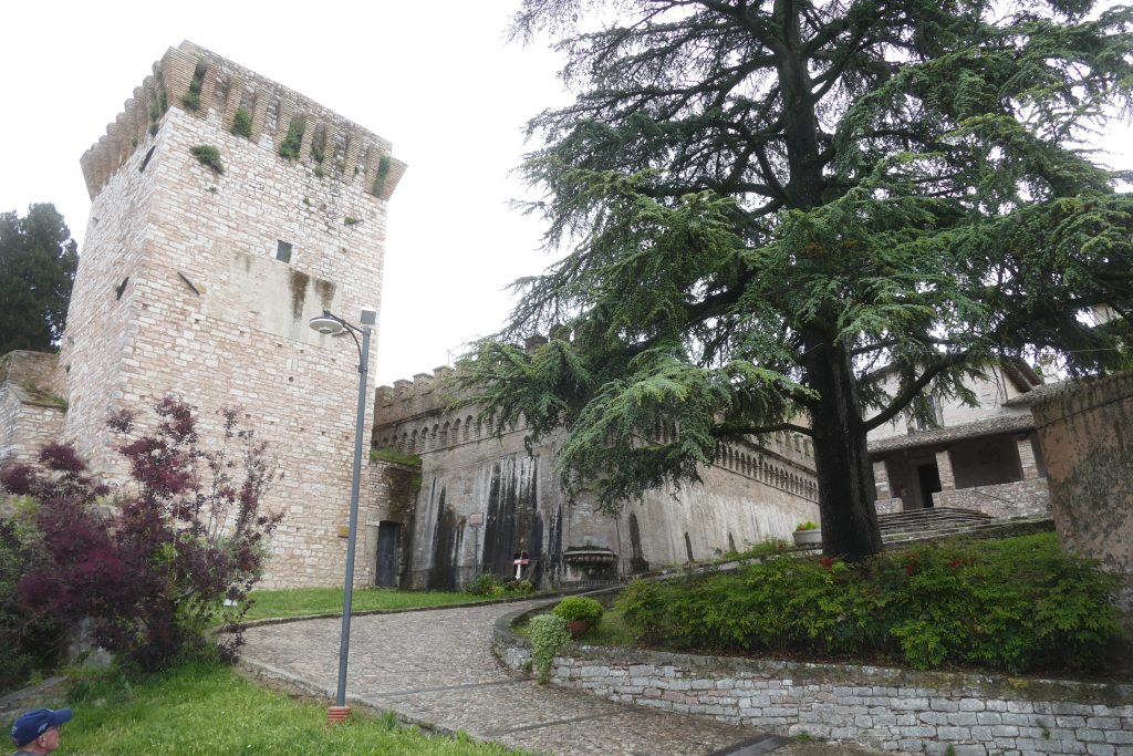 Gestern haben uns Italiener noch den Hinweis auf das ca. 15 km von Asissi entfernte Spello gegeben. Der Ort liegt auf den Ausläufern des Berges Monte Subasio und reicht vom Gipfel bis zur Ebene. Wir betreten die Altstadt durch das Haupttor, der Porta Consolare mit drei Bögen und drei Statuen aus der Zeit von Augustus. Auf dem mittelalterlichen Turm daneben steht ein uralter Olivenbaum, ein Symbol des Friedens und des typischsten lokalen Produkts. Dann kommen wir zum Vorplatz der Kirche Santa Maria Maggiore, der Hauptkirche der Stadt. Ein Stück weiter oben ist die romanische Kirche Sant’Andrea, mit Fresken der umbrischen Schule aus dem 14. und dem 15. Jahrhundert. An der Piazza della Repubblica befindet sich das Rathaus. Gegenüber in der Via Garibald ist der Palazzo Urbani-Acuti mit einer hölzernen Loggiato. Das Stadttor Porta Venere, das schönste und majestätischste Tor, stammt aus der Römerzeit, und befindet sich am Ende der alten Stadtmauer. Spello ist berühmt für sein Blumenfestival, das jedes Jahr am Wochenende nach Fronleichnam stattfindet. Doch auch jetzt sind die Gassen mit Blumen geschmückt, durch die wir schlendern. Ein Anstieg durch die Via Cappuccini bringt uns zum höchsten Teil von Spello, mit dem Belvedere, von dem wir in der Ferne, trotz des Regenwetters Assisi sehen können.
