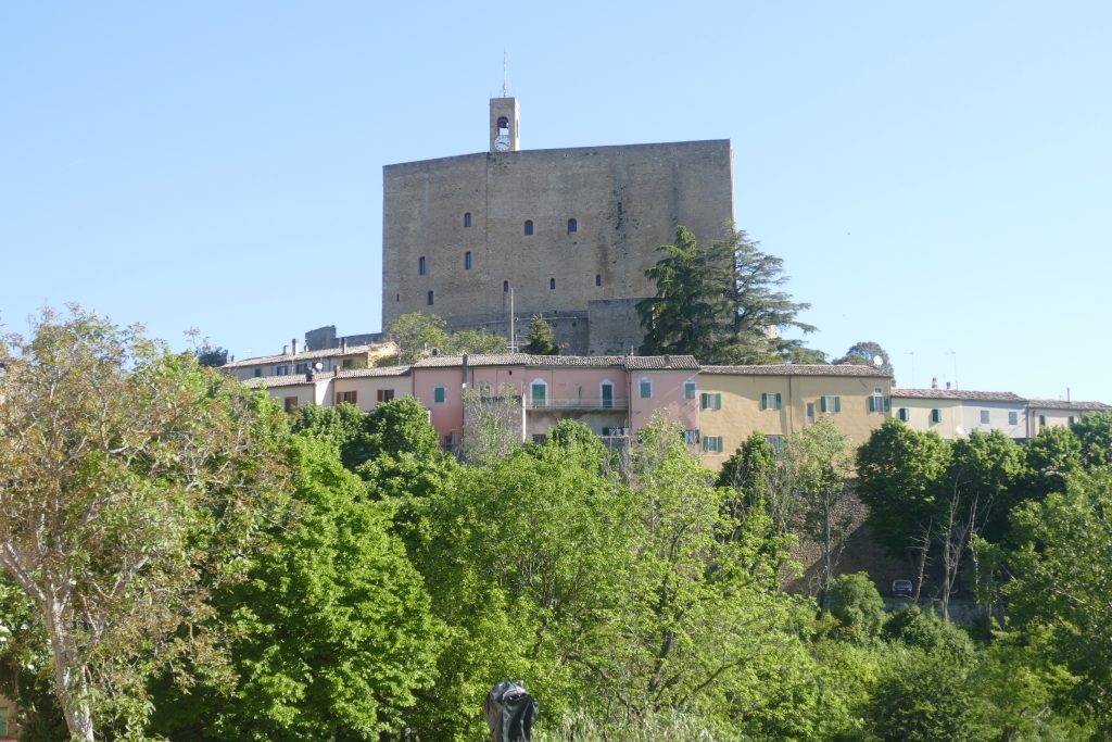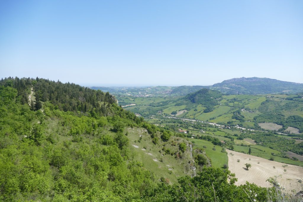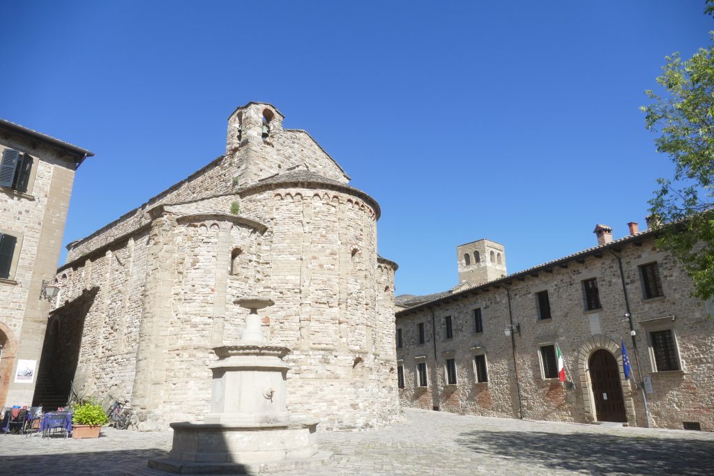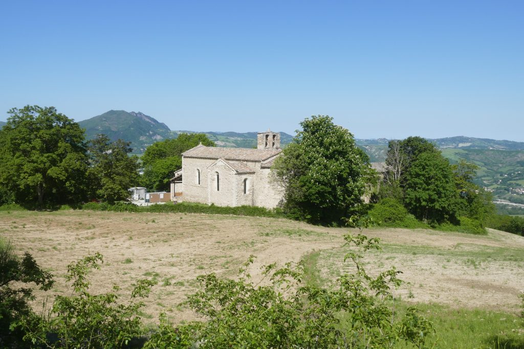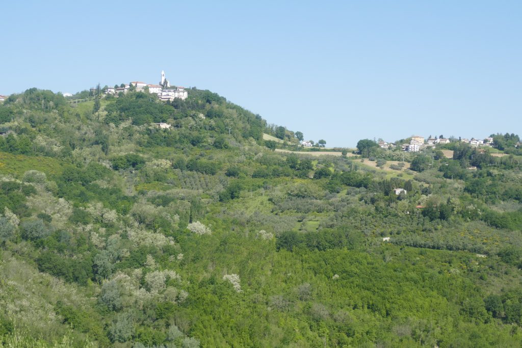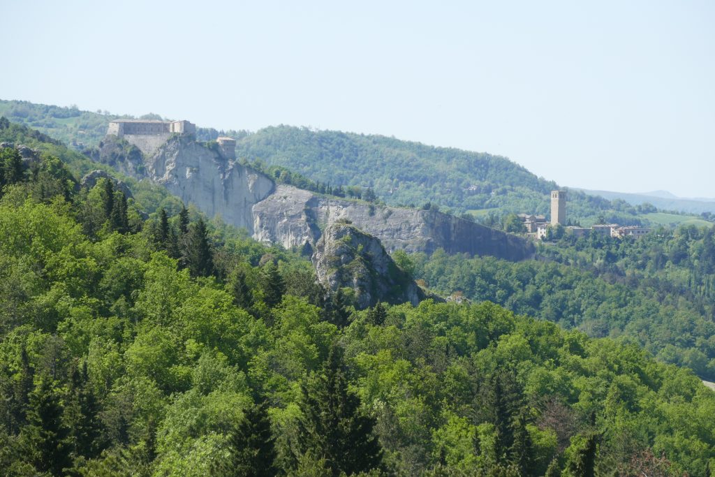 Montefiore Conca gehört zu den „Schönsten Orten Italiens“ mit einer imposanten Befestigungsanlage der adligen Familie der Malatesta, die hoch oben und uneinnehmbar über dem Conca-Tal thront. Teile der Stadtmauer sind noch um das mittelalterlich geprägte Dorf erhalten. Innerhalb der alten Mauern befinden sich die Kapelle des Ospedale del Pozzo und die Kirche San Paolo. Wir durchschreiten die gotische Porta Curina über der das Wappen von Pius XII. Piccolomini prangt und kommen zur Pfarrkirche San Paolo, Schutzpatron der Gemeinde. Wir verlassen den Ort für eine Wanderung von Montefiore Conca nach Gemmano. Zwischen Gemmano und Montefiore erstreckt sich das Ventena-Tal durch die unberührte Natur des Malatesta- und Montefeltro-Gebiets. Es handelt sich um eine der ältesten und überraschendsten Landschaften der Provinz. Steil geht es bergab bis zum Santuario della Madonna die Bonora. Weiter auf einem steilen steinigen Pfad kommen wir hinunter zum Fluss, dessen Brücke eingestürzt ist. Zum Glück finden wir eine Stelle, um hinüberzukommen. Nun geht es genauso steil bergauf nach Gemmano, ein winziges Dorf mit Blick zum Meer und auf die Berge des Herzogtums Urbino. Von Gemanno gehen wir über steile Wege zurück zum Fluss und bergauf zum Stellplatz.