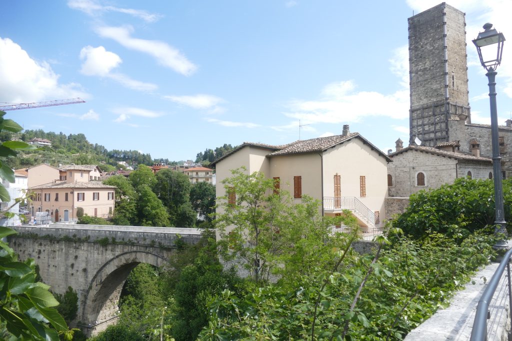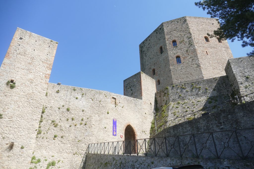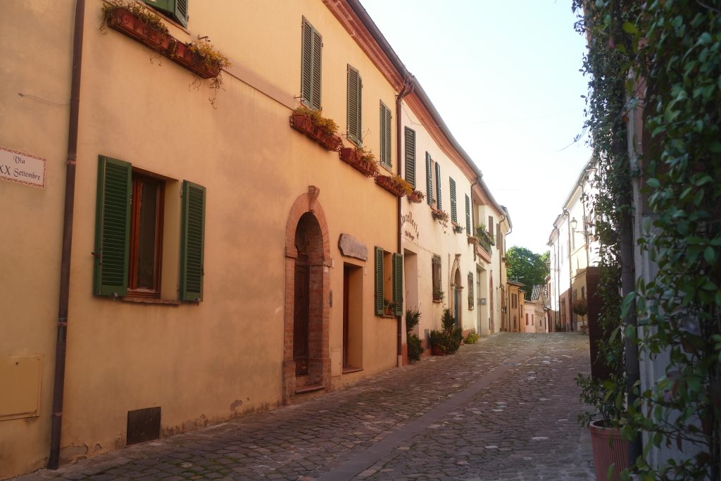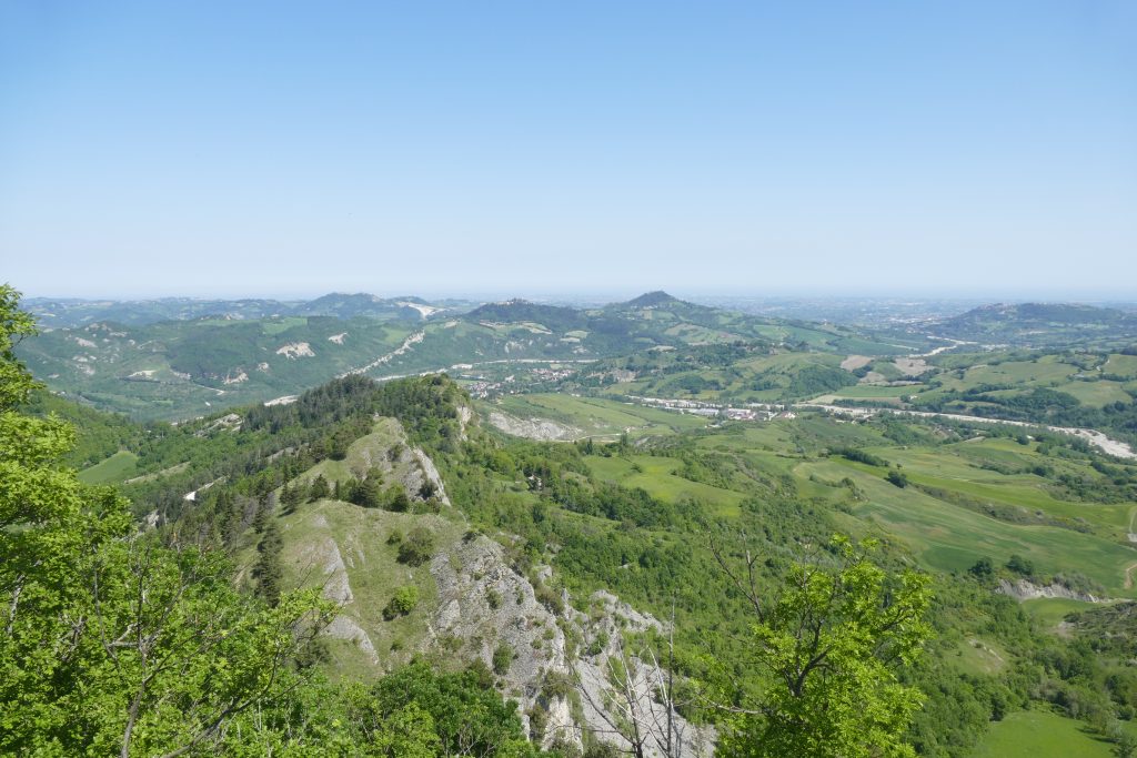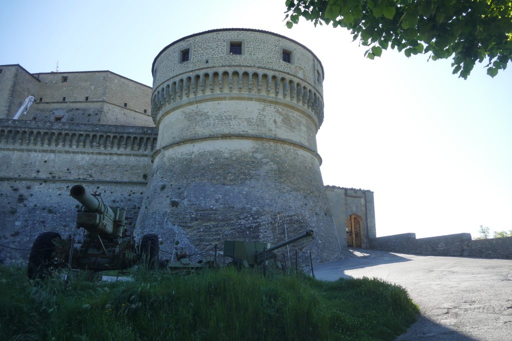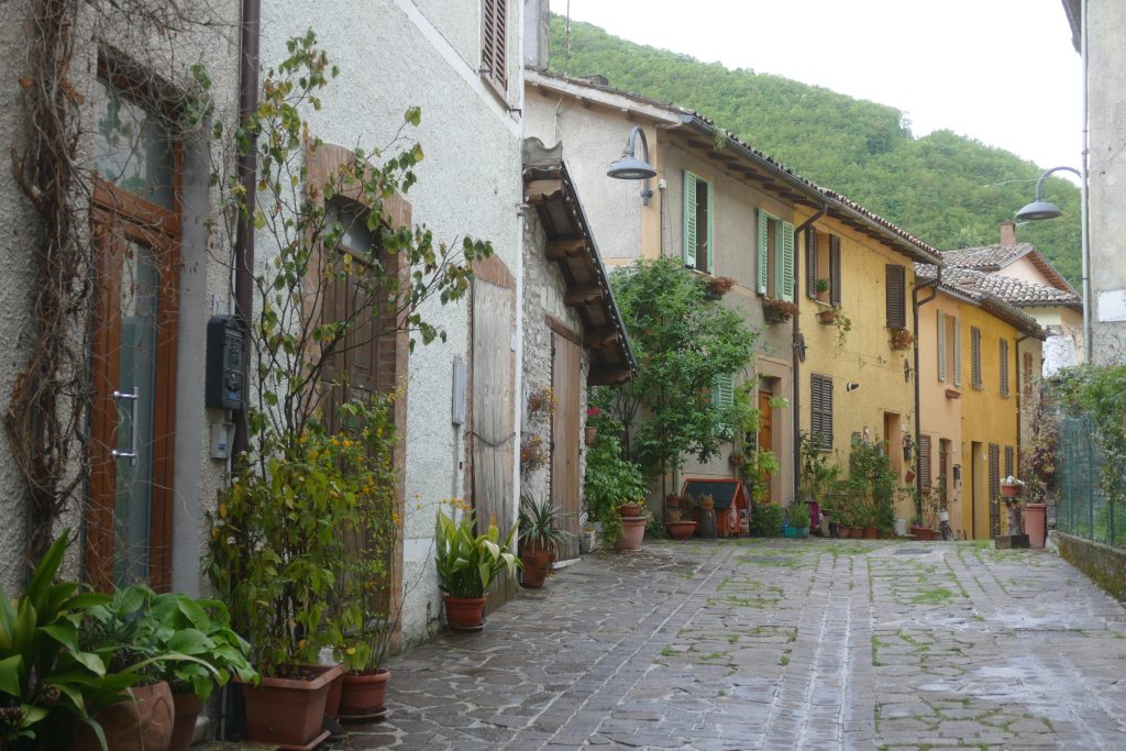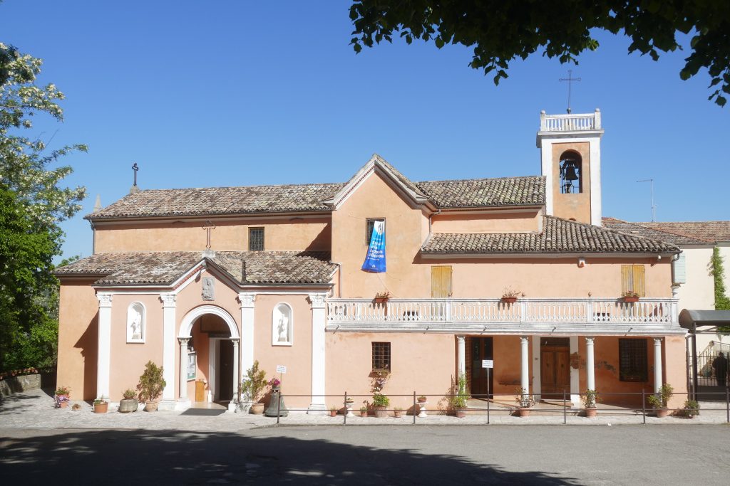 Montefiore Conca gehört zu den „Schönsten Orten Italiens“ mit einer imposanten Befestigungsanlage der adligen Familie der Malatesta, die hoch oben und uneinnehmbar über dem Conca-Tal thront. Teile der Stadtmauer sind noch um das mittelalterlich geprägte Dorf erhalten. Innerhalb der alten Mauern befinden sich die Kapelle des Ospedale del Pozzo und die Kirche San Paolo. Wir durchschreiten die gotische Porta Curina über der das Wappen von Pius XII. Piccolomini prangt und kommen zur Pfarrkirche San Paolo, Schutzpatron der Gemeinde. Wir verlassen den Ort für eine Wanderung von Montefiore Conca nach Gemmano. Zwischen Gemmano und Montefiore erstreckt sich das Ventena-Tal durch die unberührte Natur des Malatesta- und Montefeltro-Gebiets. Es handelt sich um eine der ältesten und überraschendsten Landschaften der Provinz. Steil geht es bergab bis zum Santuario della Madonna die Bonora. Weiter auf einem steilen steinigen Pfad kommen wir hinunter zum Fluss, dessen Brücke eingestürzt ist. Zum Glück finden wir eine Stelle, um hinüberzukommen. Nun geht es genauso steil bergauf nach Gemmano, ein winziges Dorf mit Blick zum Meer und auf die Berge des Herzogtums Urbino. Von Gemanno gehen wir über steile Wege zurück zum Fluss und bergauf zum Stellplatz.
