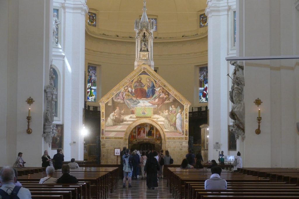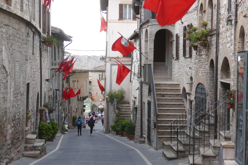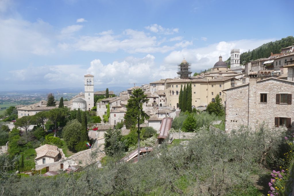 Nicht umhin kommen wir nach Assisi zu fahren, einer der bedeutendsten Pilgerorte Umbriens, Italiens und des Christentums. Hier wurde Franz von Assisi, der Gründer des Franziskanerordens, geboren sowie die Heilige Klara von Assisi, der Gründerin des Ordens der Klarissen. Seit dem Jahr 2000 ist Assisi mit der gut erhaltenen Stadtmauer und der Festungsruine Rocca Maggiore UNESCO-Weltkulturerbe. Die Parkplatzsuche gestaltet sich etwas schwierig. Schließlich landen wir in Santa Maria degli Angeli und fahren mit dem Bus nach Assisi. Auf dem Hügel Colle Paradiso befindet sich die Basilica di S. Francesco, ein monumentaler Koloss aus drei Kirchen, die übereinander angeordnet sind, das Kloster Sacro Convento mit seinem 53 meisterhaften Stützbögen und die kleinere Schwester, die Basilica di S. Chiara. In der Altstadt befinden sich die Kirche Chiesa di S. Maria Maggiore, in der Franziskus einer Überlieferung zufolge öffentlich all seine Besitztümer abgelegt hat. Die Kirche Chiesa Nuova, die auf dem Haus errichtet wurde, in der er seine Kindheit verbrachte. Die Cattedrale di S. Rufino und die Kirche Abbazia di S. Pietro sind eines der ältesten religiösen Gebäude der Stadt. Die Piazza del Comune mit dem Palazzo del Capitano del Popolo, dem Turm Torre Civica, dem Palazzo dei Priori und dem Tempel Tempio di Minerva dem schönsten und geschichtsträchtigsten Ort der Stadt. Unterhalb der Piazza erstreckt sich das alte Assisi. Wir gehen durch die Via Fontebella und die Via Bernardo da Quintavalle und natürlich durch die Via S. Francesco, eine Straße, die zur Basilika führt und durch die schon seit acht Jahrhunderten alle Pilgern der Welt laufen. Wieder zurück in Santa Maria degli Angeli sehen wir uns noch die gleichnamige Basilika an, die zum Schutz der Porziuncola, der kleinen Kirche, in der der heilige Franziskus Zuflucht fand, seinen Orden gründete, und in der er am 3. Oktober 1226 starb.