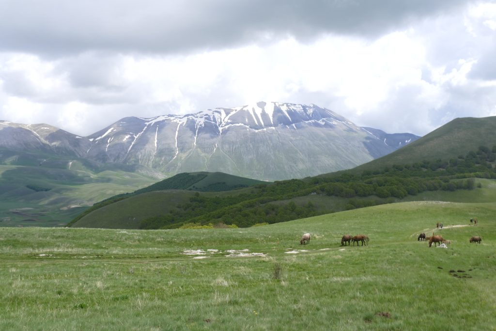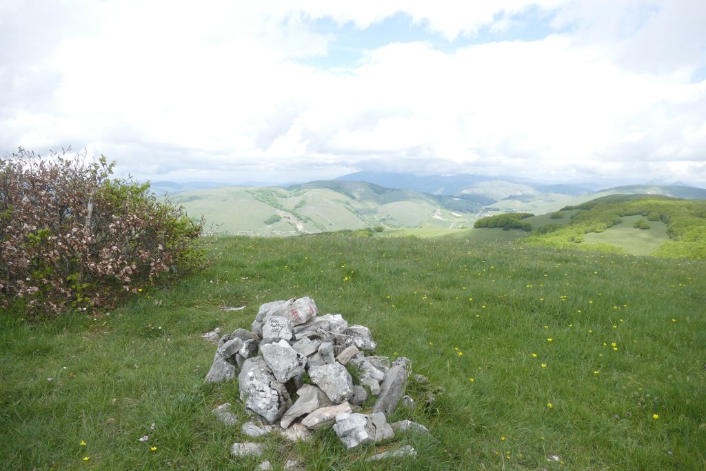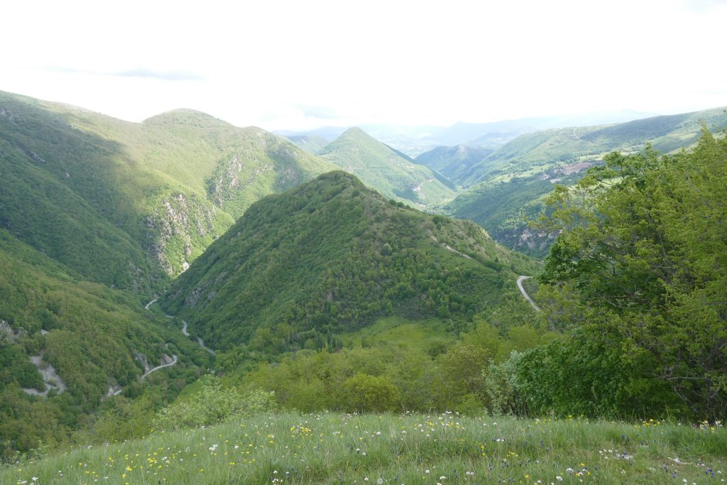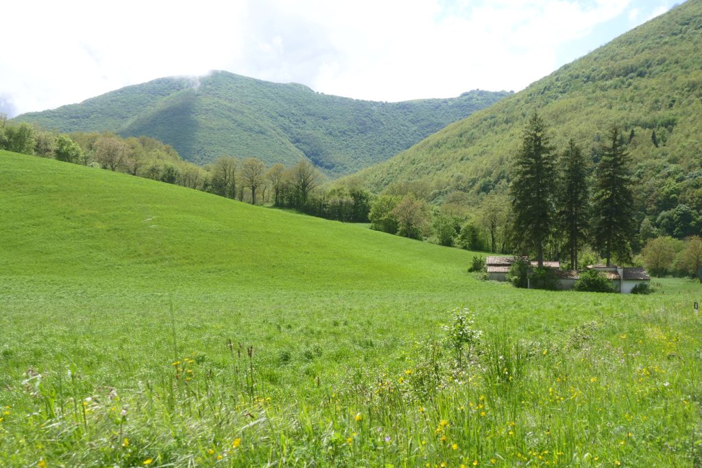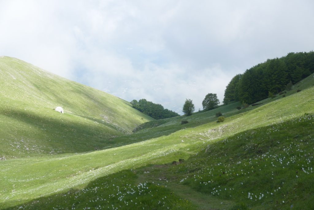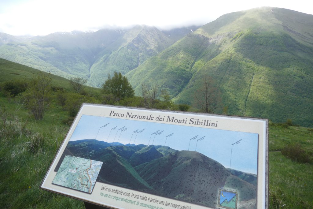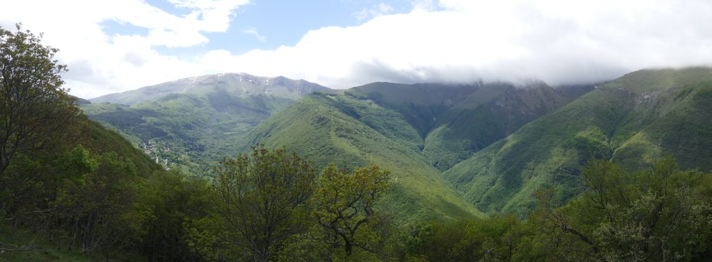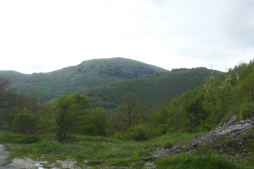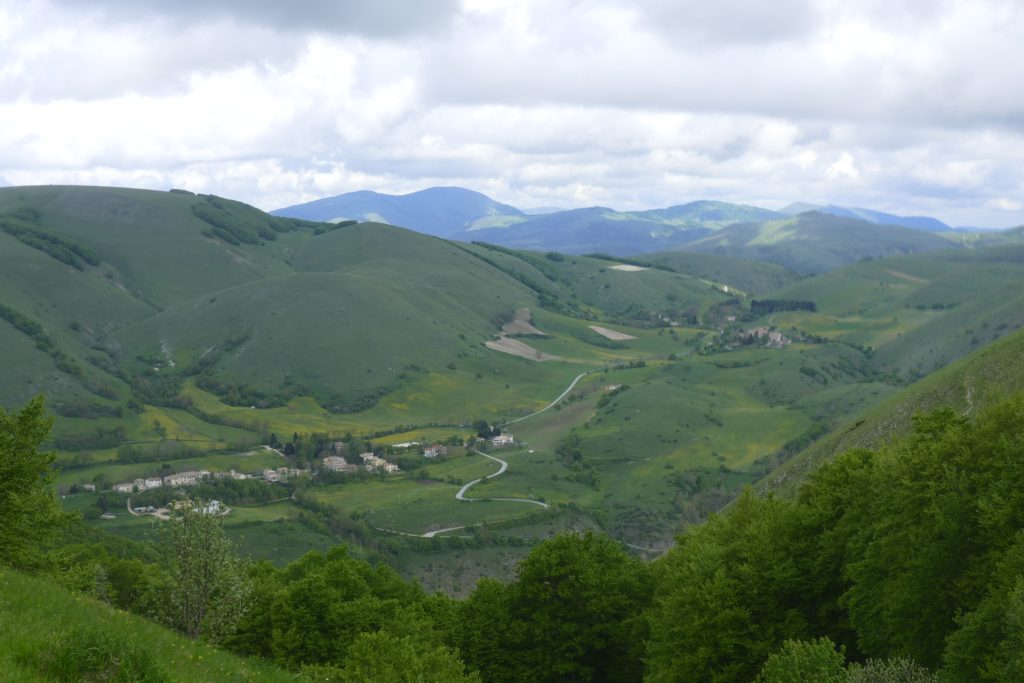 Weiter fahren wir heute wieder durch lange Tunnel, dann geht es hoch auf einen Pass mit herrlicher Aussicht auf die Landschaft über der die schweren Wolken hängen. Immer mehr sind die Spuren des letzten Erdbebens sichtbar. Nach ca. 35 km erreichen wir Bolognola auf 1070 m Höhe im Nationalpark Monti Sibillini. Hier starten wir zu unserer Wanderung zur Fonte dell’Aquila und Piani di Ragnolo. Ein schöner Waldpfad führt am, in den 2000er Jahren eingerichteten Wildtiergebiet zur Wiederansiedlung der Gämsen vorbei, zur Fonte dell Aquilla auf 1300 m Höhe. Wir machen den kleinen Abstecher zum Belvedere del Sentiero dell’Aquila mit einer Tafel, die die umliegende Bergwelt darstellt. Zurück an der Quelle laufen wir auf einem nicht eindeutigen Weg bergauf, den wir nur mithilfe des GPS finden. Steil geht es weiter bergauf über bunt blühende Wiesen bis wir zum 1464 m hohen Colle Ripe kommen. Nur die Wolken versperren den herrlichen Panoramablick. Am Refugio Fratelli Cioci vorbei geht es nun leicht bergab über das Plateau Piani di Ragnolo bis wir die Straße mit der Villa Lucio erreichen. Ein wenig unterhalb folgen wir dem schmalen Pfad durch den Wald bergab nach Bolognola.