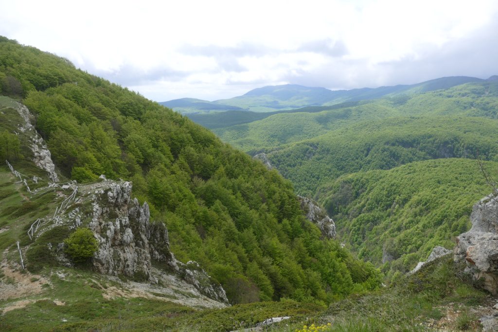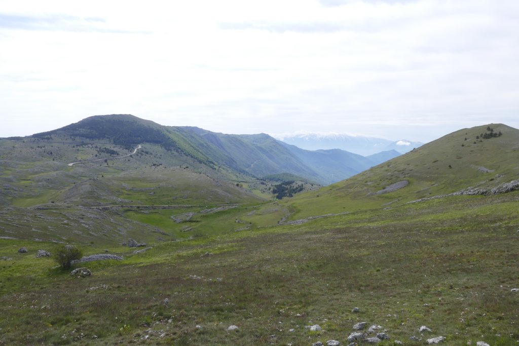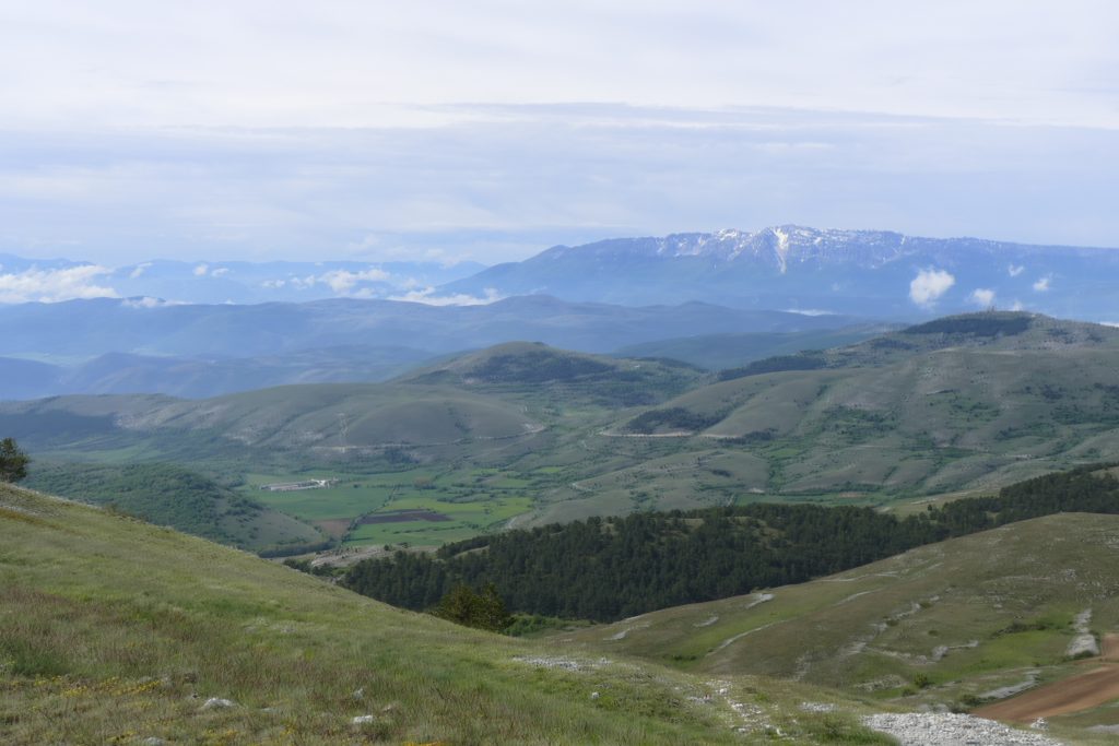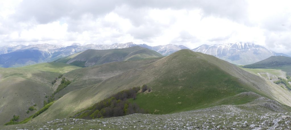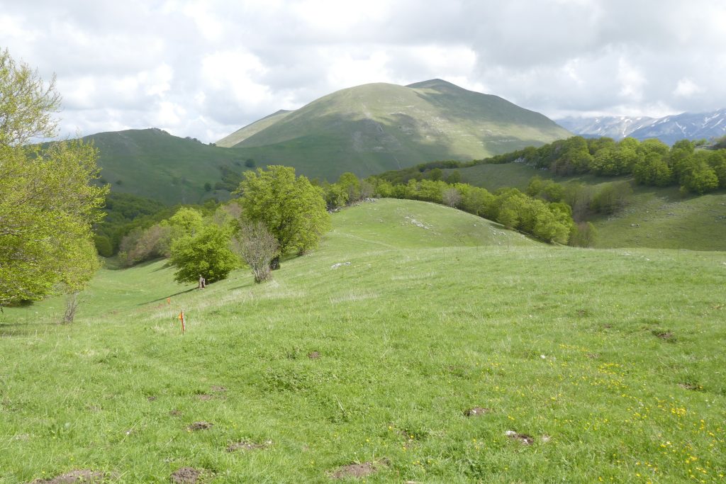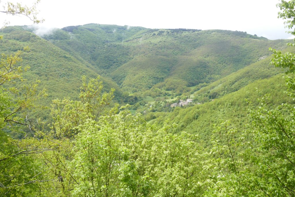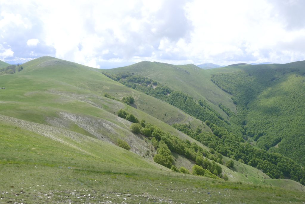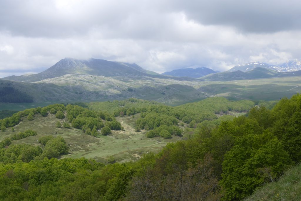 Weiter fahren wir heute wieder durch lange Tunnel, dann geht es hoch auf einen Pass mit herrlicher Aussicht auf die Landschaft über der die schweren Wolken hängen. Immer mehr sind die Spuren des letzten Erdbebens sichtbar. Nach ca. 35 km erreichen wir Bolognola auf 1070 m Höhe im Nationalpark Monti Sibillini. Hier starten wir zu unserer Wanderung zur Fonte dell’Aquila und Piani di Ragnolo. Ein schöner Waldpfad führt am, in den 2000er Jahren eingerichteten Wildtiergebiet zur Wiederansiedlung der Gämsen vorbei, zur Fonte dell Aquilla auf 1300 m Höhe. Wir machen den kleinen Abstecher zum Belvedere del Sentiero dell’Aquila mit einer Tafel, die die umliegende Bergwelt darstellt. Zurück an der Quelle laufen wir auf einem nicht eindeutigen Weg bergauf, den wir nur mithilfe des GPS finden. Steil geht es weiter bergauf über bunt blühende Wiesen bis wir zum 1464 m hohen Colle Ripe kommen. Nur die Wolken versperren den herrlichen Panoramablick. Am Refugio Fratelli Cioci vorbei geht es nun leicht bergab über das Plateau Piani di Ragnolo bis wir die Straße mit der Villa Lucio erreichen. Ein wenig unterhalb folgen wir dem schmalen Pfad durch den Wald bergab nach Bolognola.