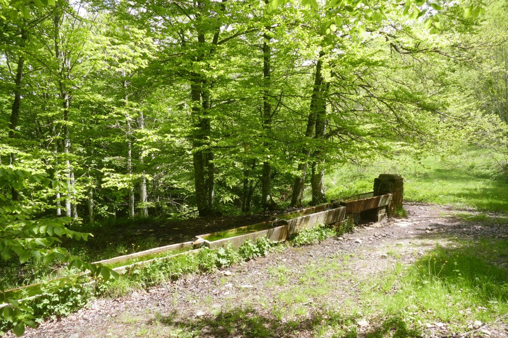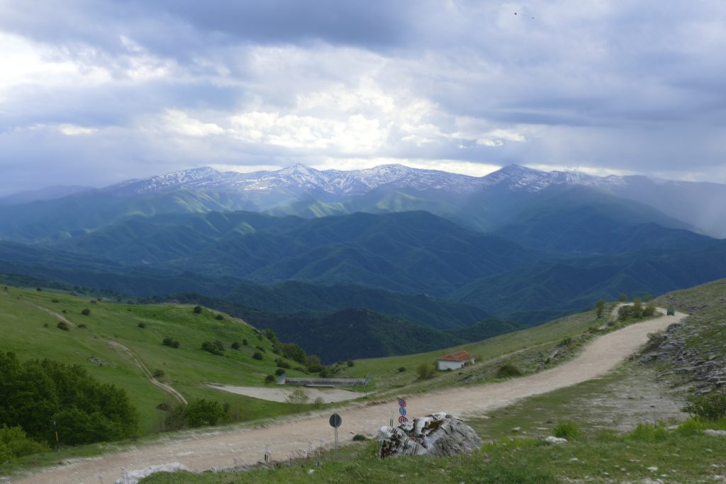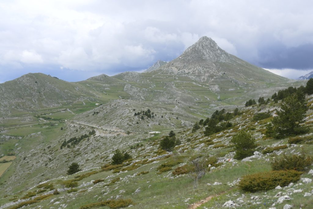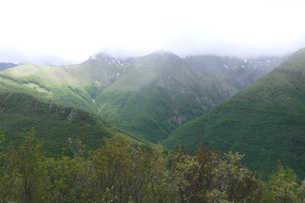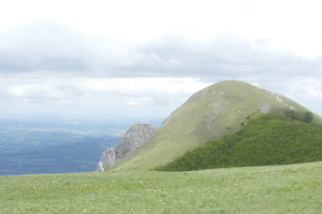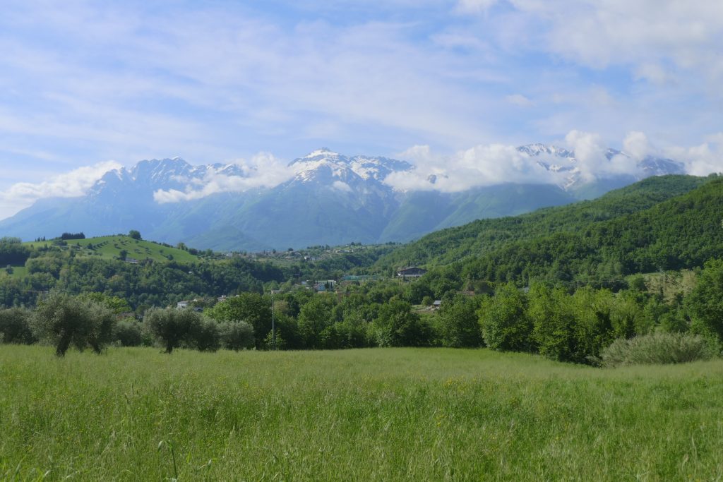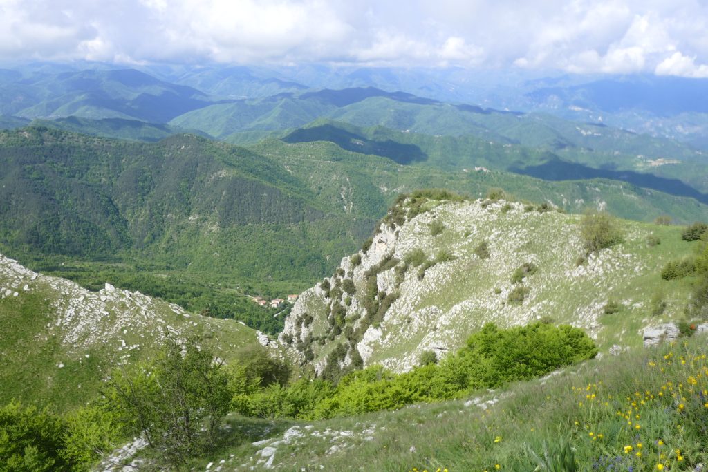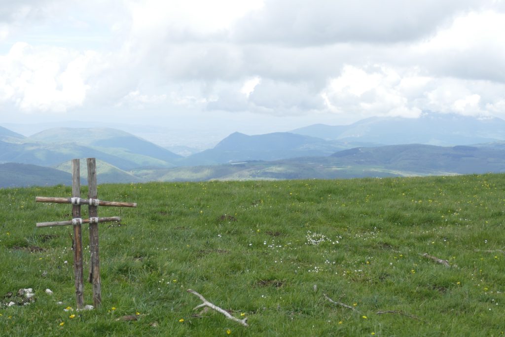 Weiter fahren wir heute wieder durch lange Tunnel, dann geht es hoch auf einen Pass mit herrlicher Aussicht auf die Landschaft über der die schweren Wolken hängen. Immer mehr sind die Spuren des letzten Erdbebens sichtbar. Nach ca. 35 km erreichen wir Bolognola auf 1070 m Höhe im Nationalpark Monti Sibillini. Hier starten wir zu unserer Wanderung zur Fonte dell’Aquila und Piani di Ragnolo. Ein schöner Waldpfad führt am, in den 2000er Jahren eingerichteten Wildtiergebiet zur Wiederansiedlung der Gämsen vorbei, zur Fonte dell Aquilla auf 1300 m Höhe. Wir machen den kleinen Abstecher zum Belvedere del Sentiero dell’Aquila mit einer Tafel, die die umliegende Bergwelt darstellt. Zurück an der Quelle laufen wir auf einem nicht eindeutigen Weg bergauf, den wir nur mithilfe des GPS finden. Steil geht es weiter bergauf über bunt blühende Wiesen bis wir zum 1464 m hohen Colle Ripe kommen. Nur die Wolken versperren den herrlichen Panoramablick. Am Refugio Fratelli Cioci vorbei geht es nun leicht bergab über das Plateau Piani di Ragnolo bis wir die Straße mit der Villa Lucio erreichen. Ein wenig unterhalb folgen wir dem schmalen Pfad durch den Wald bergab nach Bolognola.