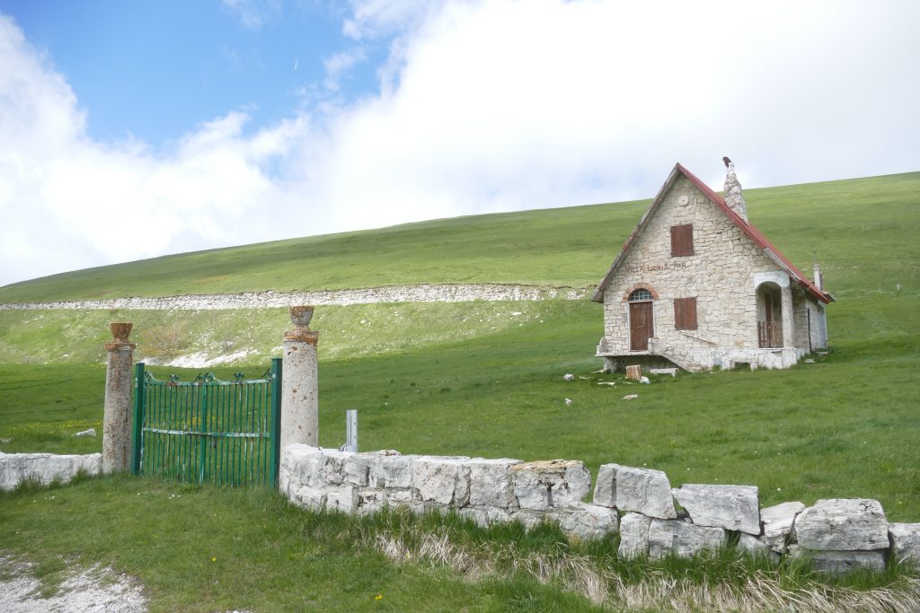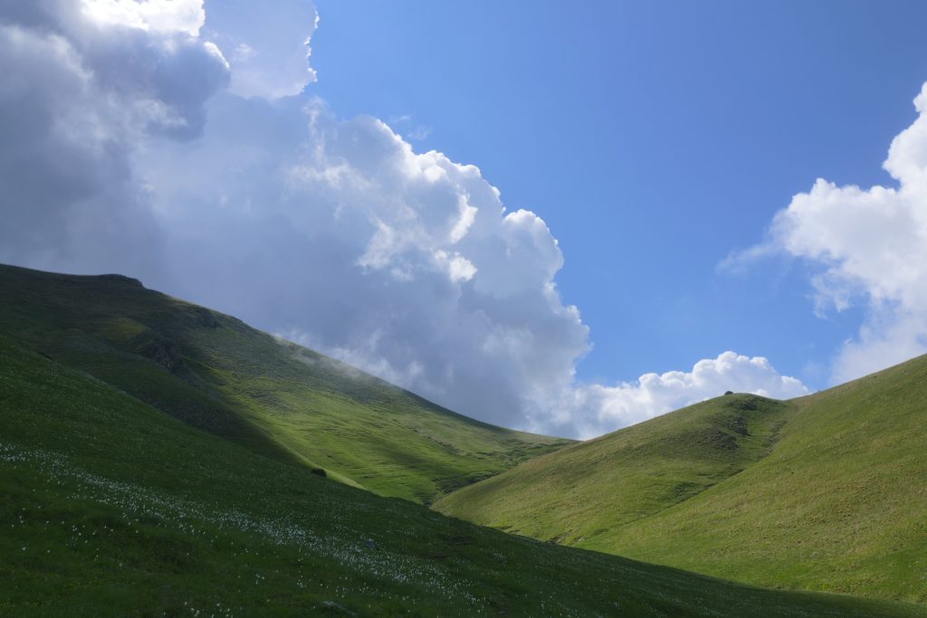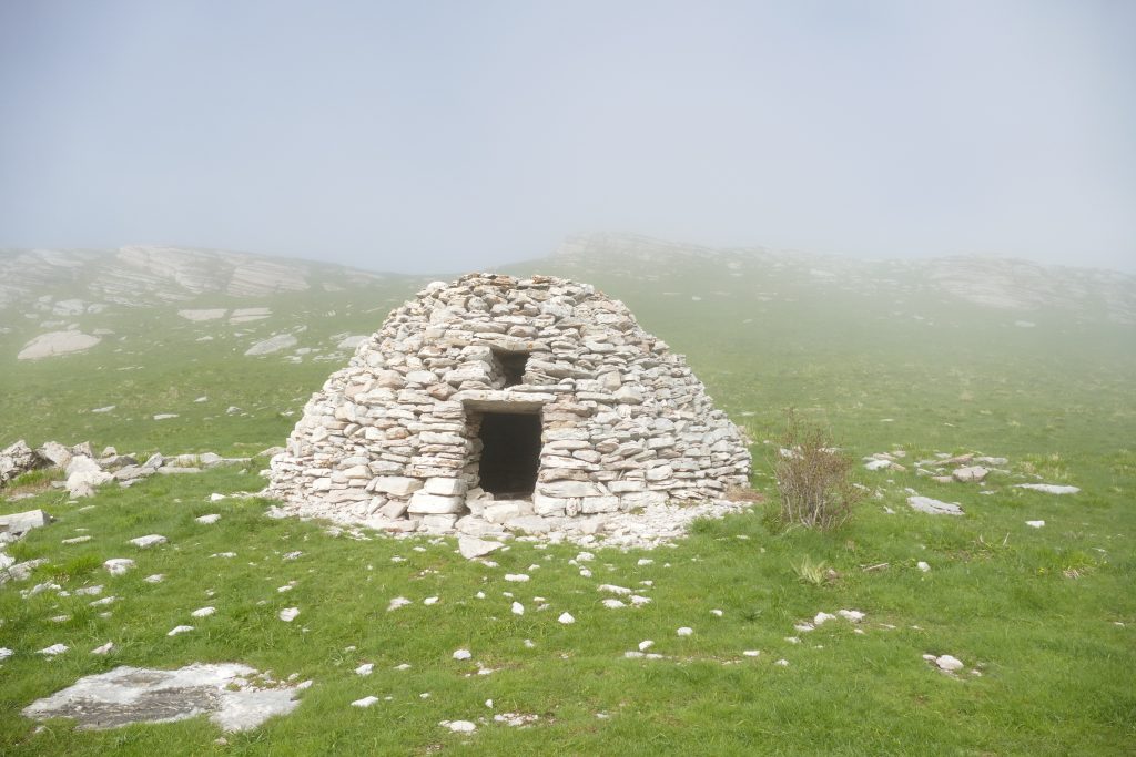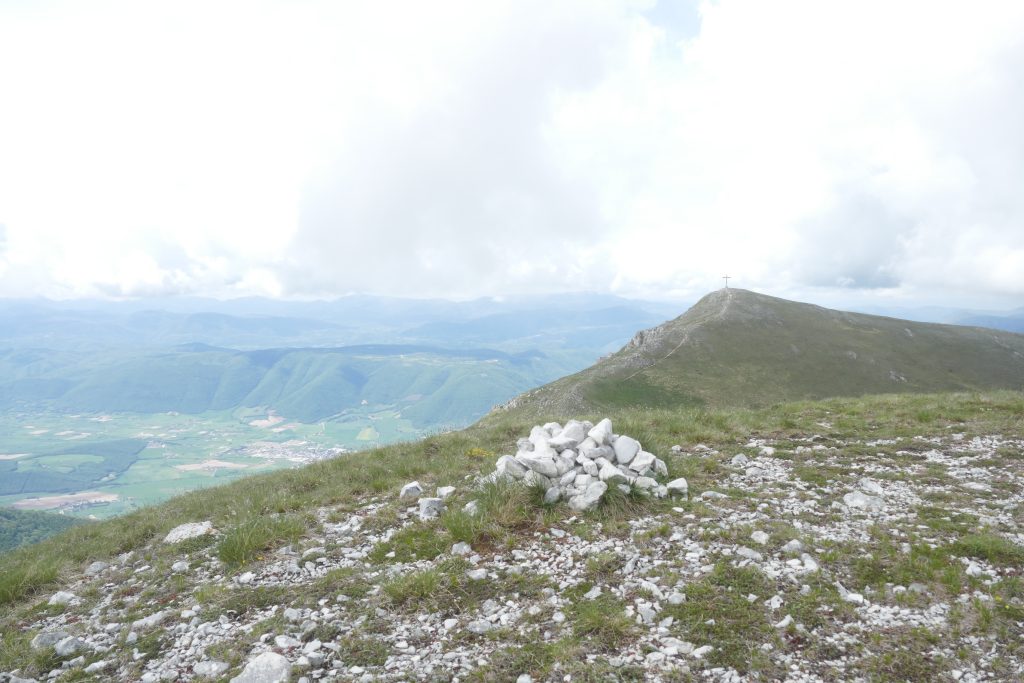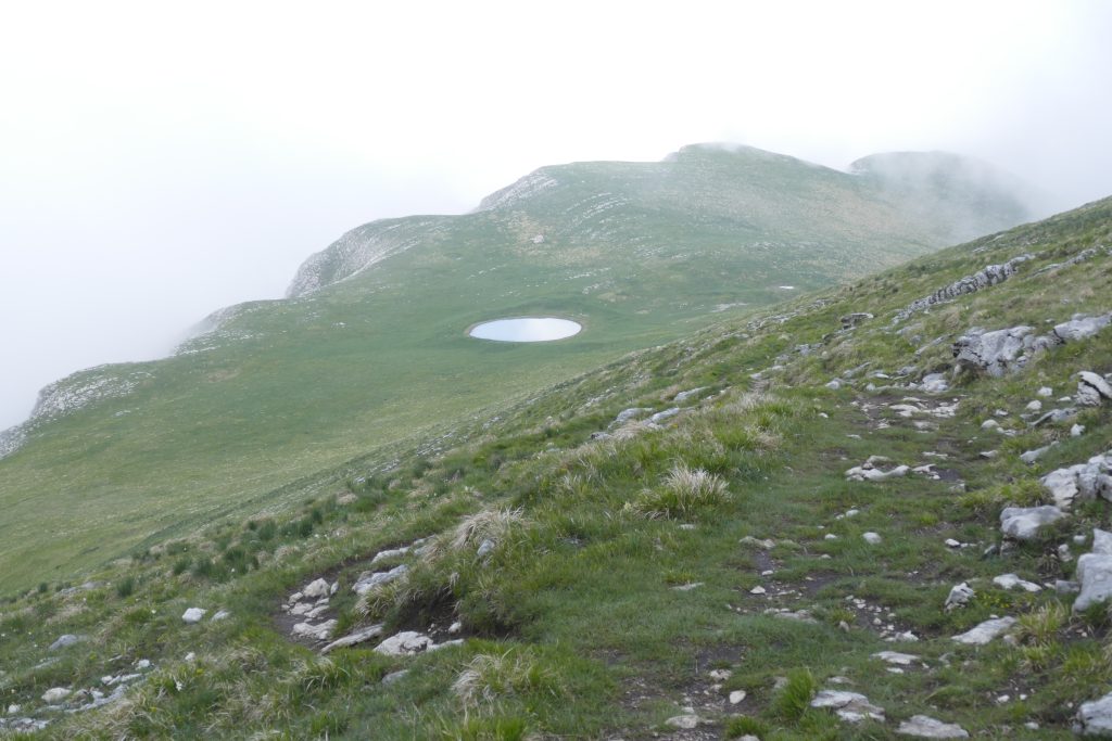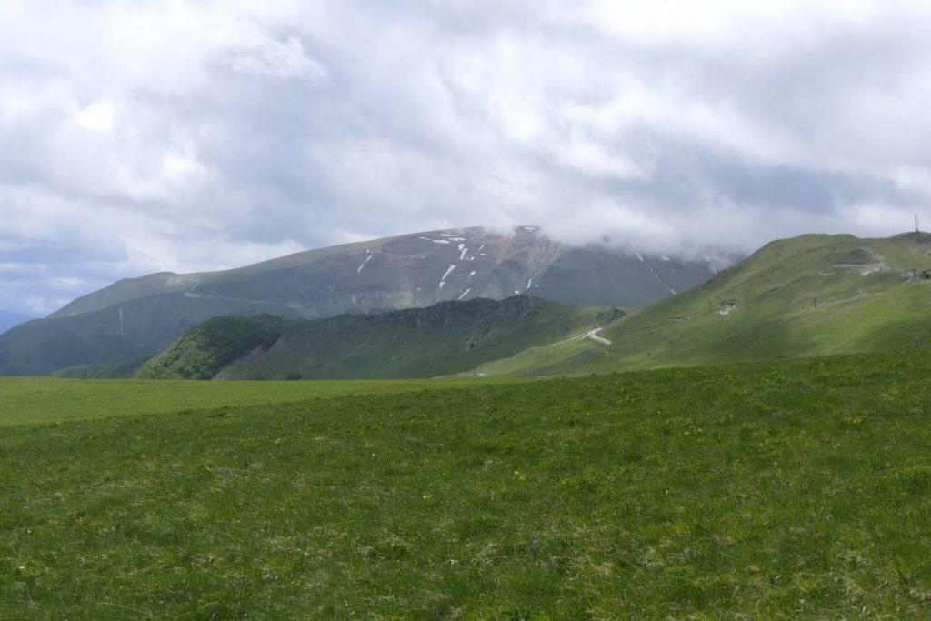 Wir stehen heute sehr früh auf, da die umliegende Bergwelt frei ist und einen atemberaubenden Blick bietet. Nach dem Frühstück starten wir zur Wanderung Ring des Blumenbergs, zu dem der Berg Piselle auf 1676 m und der Berg Girella mit 1814 m gehören. Der Weg geht zuerst durch Wald bis zum Gipfel mit der Seilbahnstation und einigen Antennen. Wir folgen weiter dem ehemaligen Sessellift. Der Weg ist nicht ganz eindeutig, sondern geht den Kamm hinauf. Leider ist mittlerweile dicker Nebel aufgezogen und versperrt die Sicht auf die Berge Sibilini und Laga. Ein letzter steiler Anstieg, und wir haben das Gipfelkreuz des Monte Girella erreicht, von wo aus wir ein wunderbares 360° Panorama bewundern könnten, wenn da nicht diese weiße Nebelwand wäre. Wir beginnen den Abstieg entlang von herrlich blühenden Bergwiesen und kommen an einem kleinen See vorbei. Hier finden wir auch mehrere Tholos, die kleinen Steinhäuschen der Hirten. Wir folgen dem nun eindeutigen Pfad durch eine Schlucht und anschließend durch Wälder bis zur Schotterstraße, die uns zur Seilbahnstation zurückbringt. Dunkle Wolken hängen über den Bergen als wir unseren Parkplatz verlassen und weiter nach Tossicia in der Provinz Teramo in den Abruzzen fahren. Der Ort liegt im Nationalpark Gran Sasso und Monti della Laga, auf dem wir vom Stellplatz einen herrlichen Blick haben.