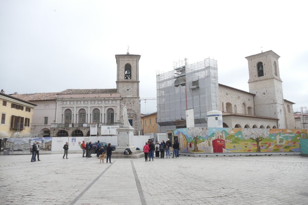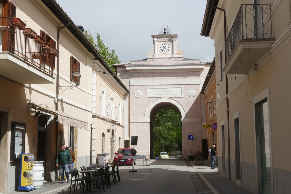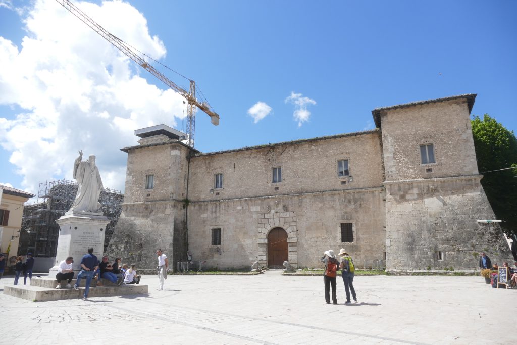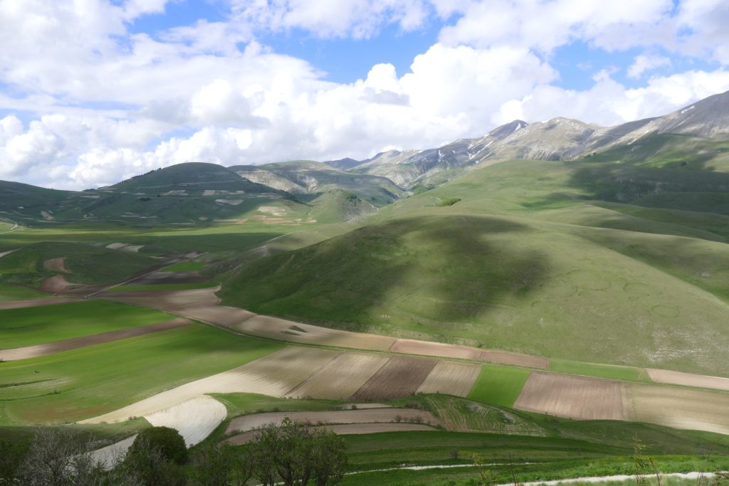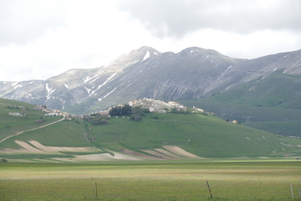 Am Morgen hängt der Nebel in den Tälern. Wir fahren weiter in die von Bergen umgebene Stadt Norcia, am Fuß der beeindruckenden Monti Sibillini. Der historische Kern ist von einer Stadtmauer mit acht Stadttoren und Türmen aus dem 13. Jahrhundert umgeben. Von der Porta Massani betreten wir die Stadt und gehen auf dem Corso Sertorio zum Hauptplatz Piazza S. Benedetto mit der Statue des Heiligen Benedikt. Leider sind sämtliche Kirchen und historischen Gebäude durch die Erdbebenserie 2016 zerstört. Bei Sant´Angelo, einem Ortsteil von Norcia, ereignete sich das schwerste Erdbeben am 30. Oktober 2016. Unvorstellbar, was hier geschah. Wir schlendern durch die Gassen und entlang der Stadtmauer, teilweise ist das normale Leben zurückgekehrt. Die Basilika des Heiligen Benedikt soll im Oktober wieder hergestellt sein. Anschließend fahren wir eine Bergstraße hinauf in die Bergwelt der Monti Bibillini. Kurvenreich erreichen wir eine Passhöhe, die den Blick auf eine von kahlen Bergen eingerahmte Hochebene öffnet: der Piano Grande di Castelluccio, die Hochebene von Castellucci, die durch einen eiszeitlichen See entstanden ist. Das kleine Dorf Castelluccio auf 1452 m, deren Bewohner von der traditionellen Landwirtschaft leben, ist von weitläufigen Wiesen für die Schafzucht und Feldern umgeben. Im Winter ist das Dorf eingeschneit. Wir machen noch einen Spaziergang durch die ebenfalls durch das Erdbeben schwer gezeichnete Stadt. Kaum ein Haus steht noch.