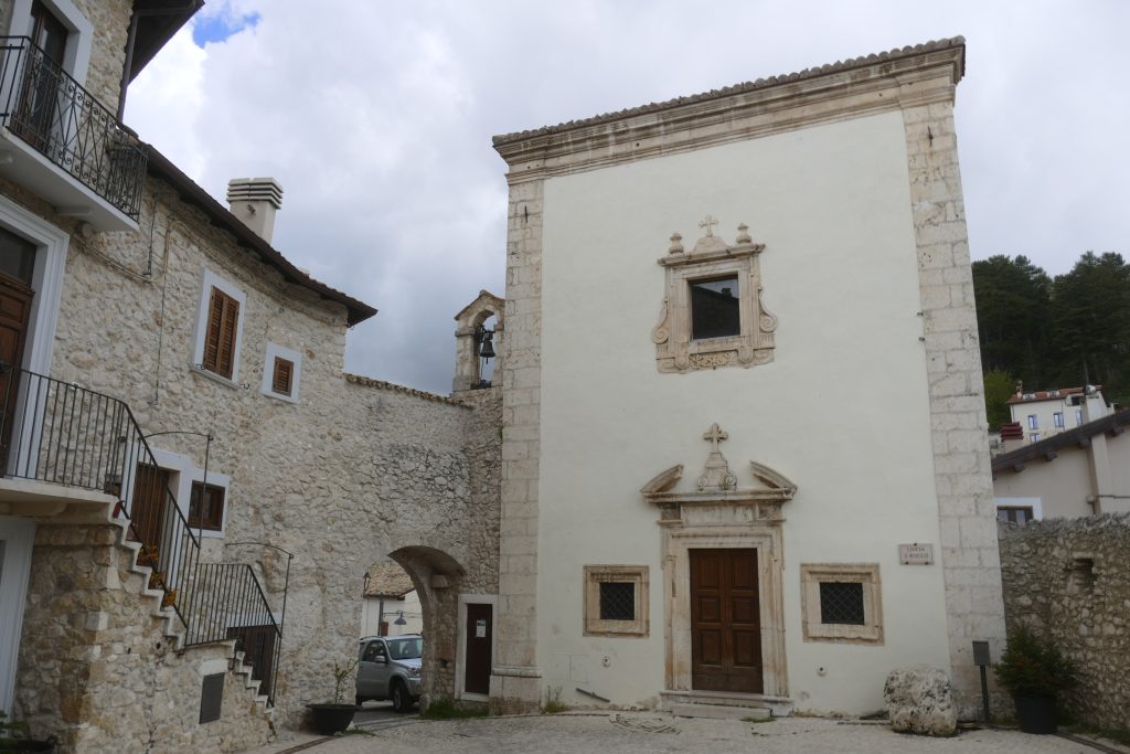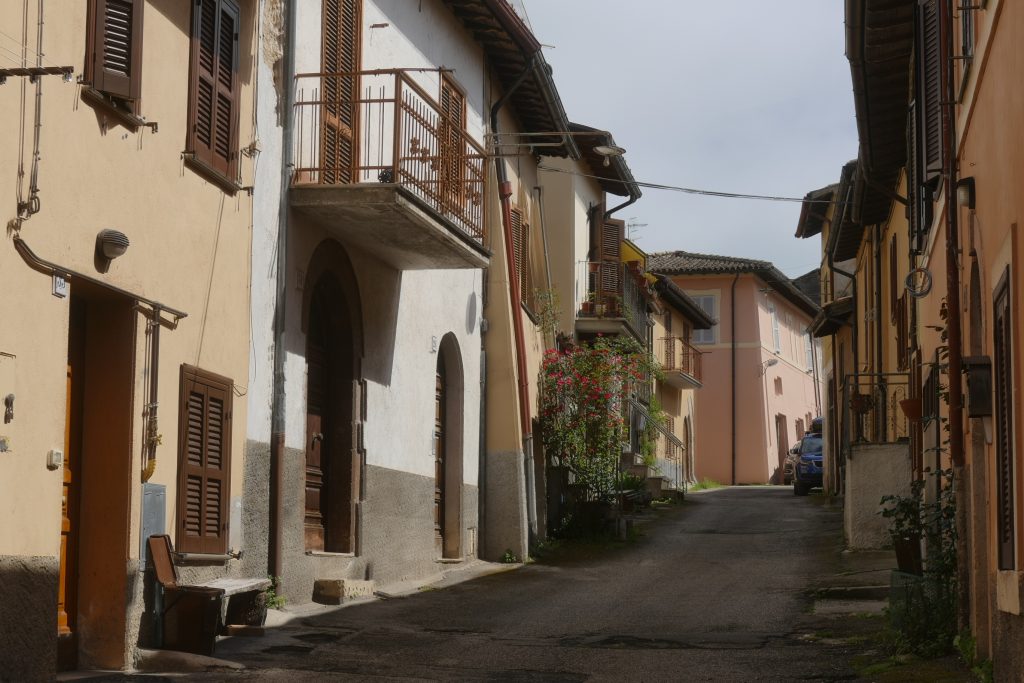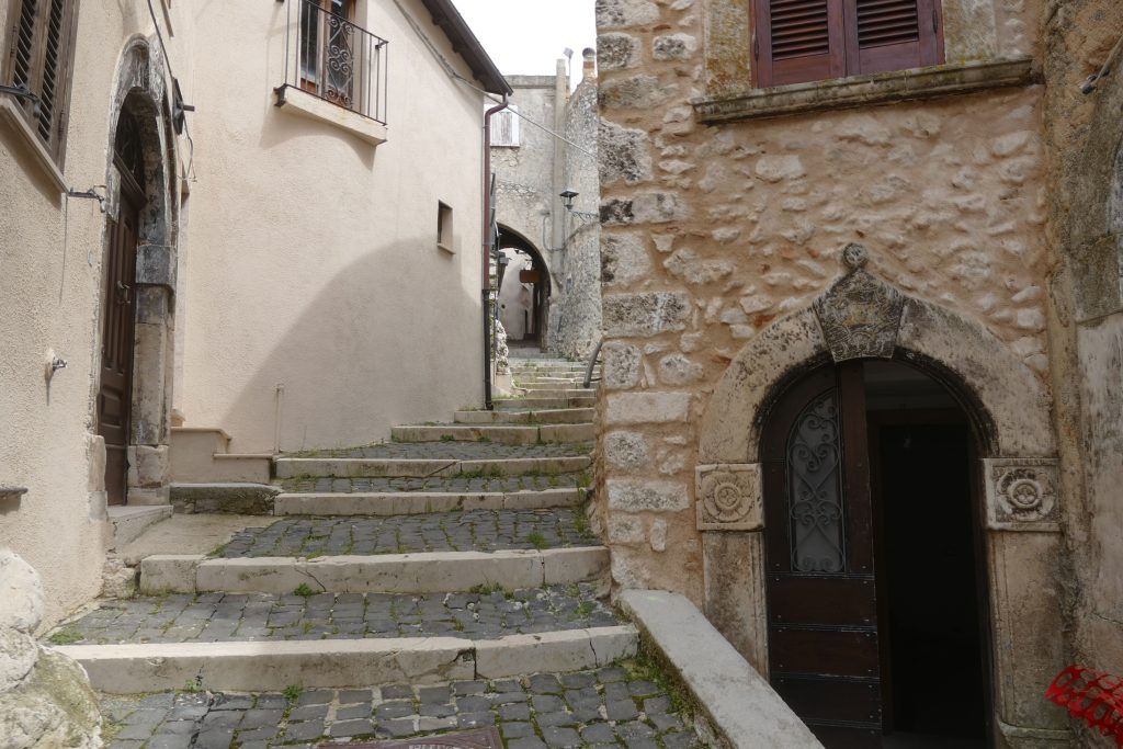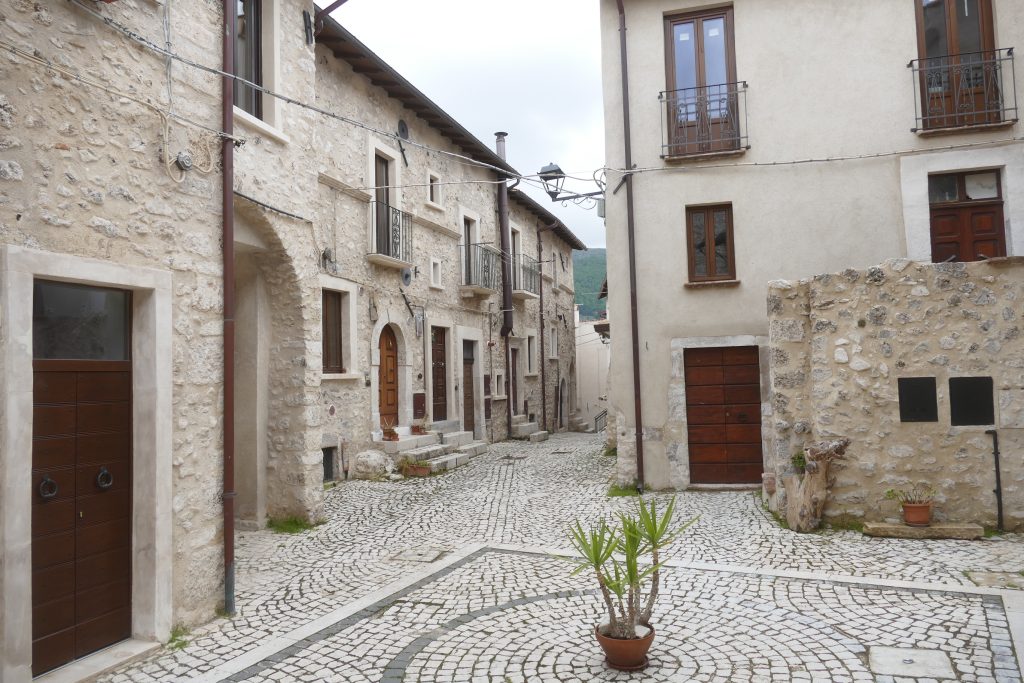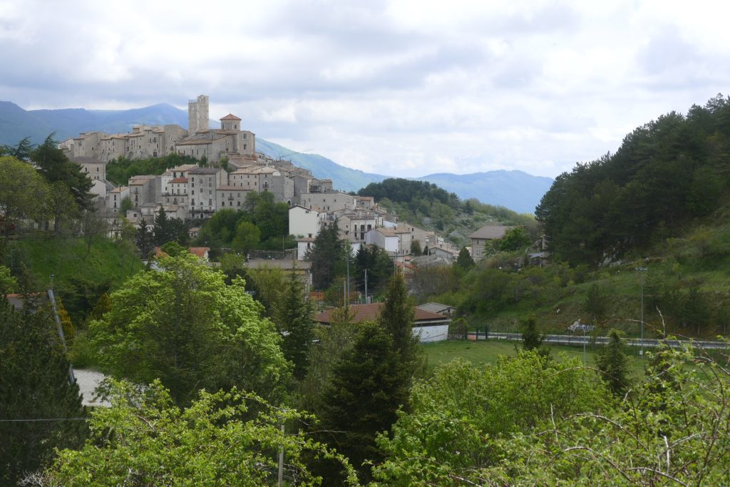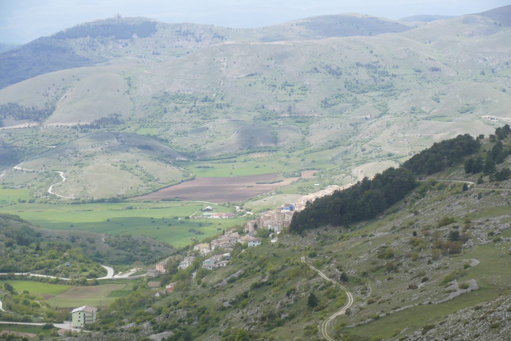 Am Morgen erwachen wir mit herrlichem Blick auf den Gran Sasso. Wir starten unsere Wanderung und gehen zuerst durch den kleinen Ort. Danach gehen wir die Straße bis zum Ortsausgang und biegen in einen Wiesenweg ein. Hüfthohes Gras durchnässt unsere Sachen. Der Weg ist nicht gepflegt und wir brechen ab. Nach der Entsorgung fahren wir auf einer abenteuerlichen Straße mit nicht enden wollenden Serpentinen hinauf zum Pass Vado di Sole auf über 1600 Höhenmeter. Dann überqueren wir die beeindruckende Hochebene Campo Imperatore. Nun ist es nicht mehr weit bis zu einem der schönsten Dörfer Italiens im Nationalpark des Gran Sasso und der Monti della Laga, südlich des Campo Imperatore, Castel del Monte. Überdachte Durchgänge, kleine Balkone und Haustürme, Wohnhäuser aus Stein und kleine Ecken, ein Dorf eingebettet in die herrliche Landschaft. Schilder mit Fotos erzählen vom früheren Leben mit Wandertierhaltung und altem Handwerk. Wir sind total begeistert, als wir durch die engen Gassen mit Treppen steigen. Kaum sind wir wieder am Auto zurück, schüttet sich eine dunkle Wolke aus.